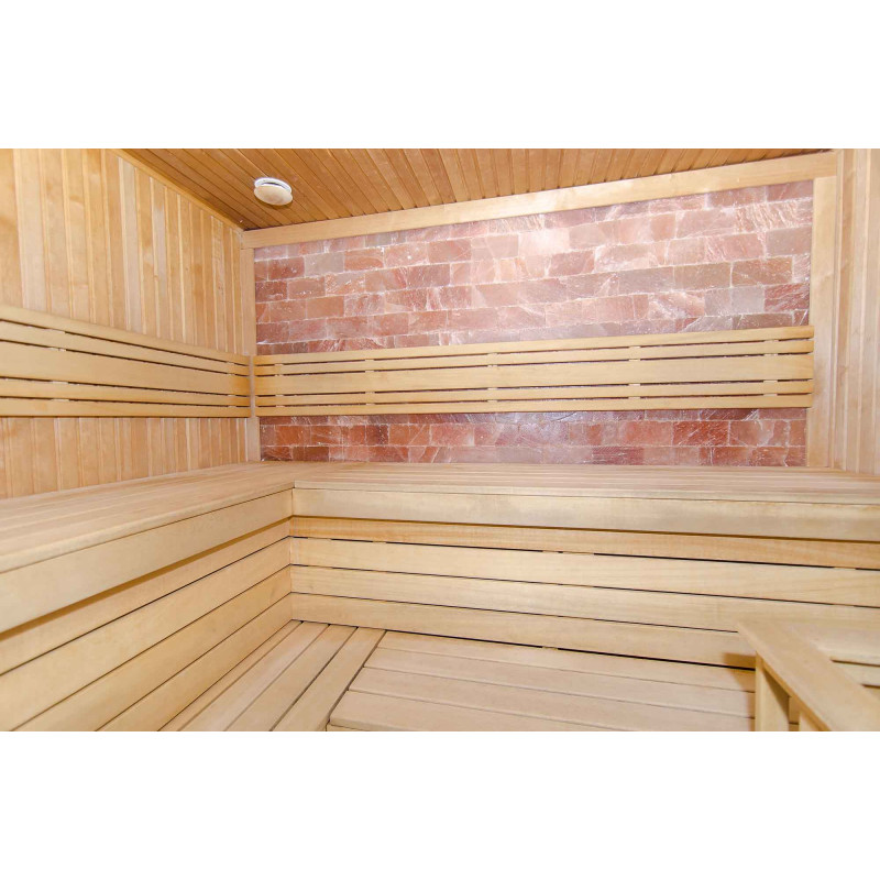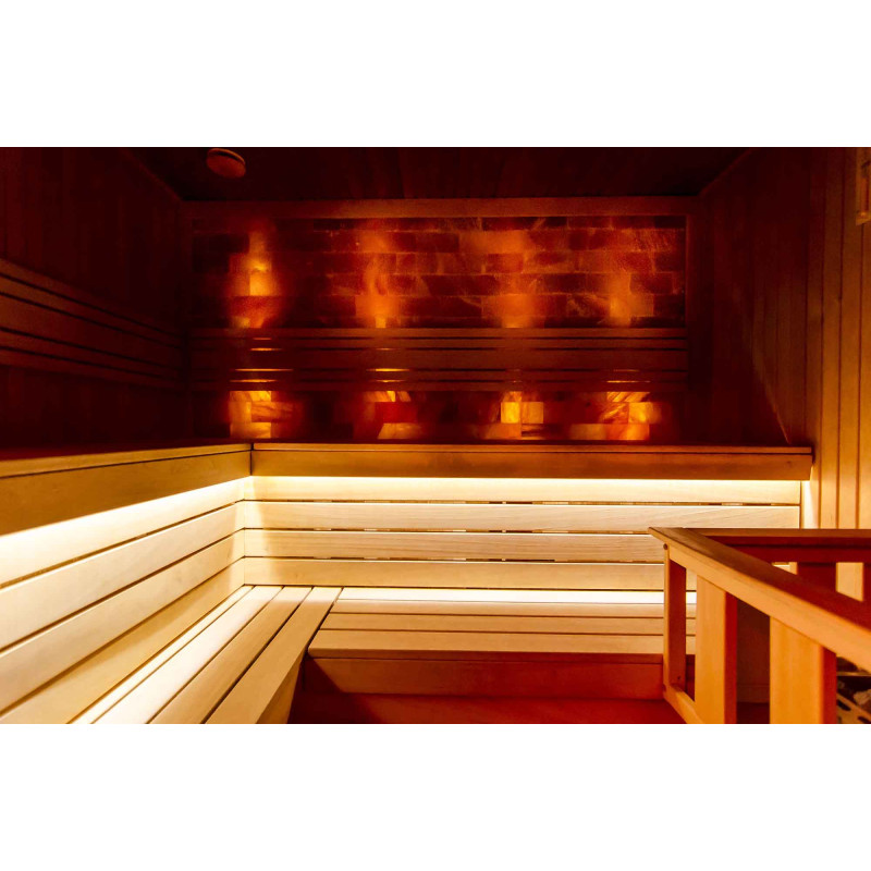 För att ge nöje inte bara för kroppen utan också för ögonen, installerades en vägg av släta Himalaya-saltstenar, upplyst av ljuskronor monterade under ryggstödet.