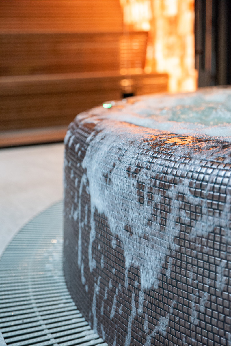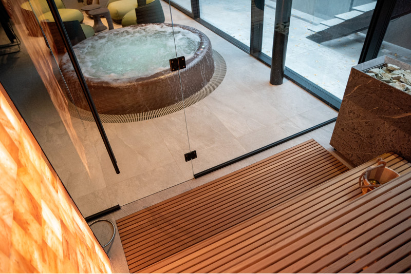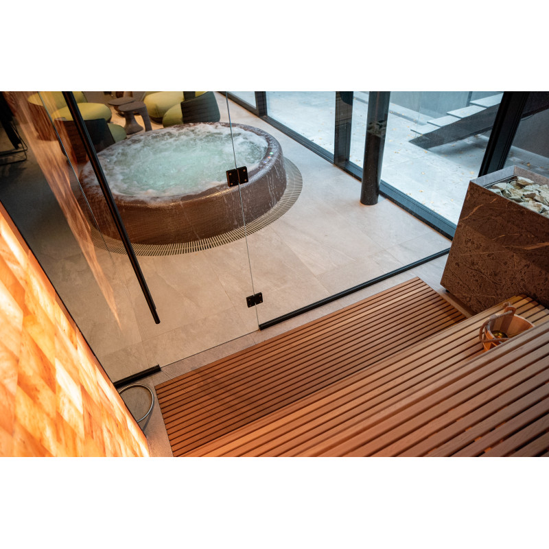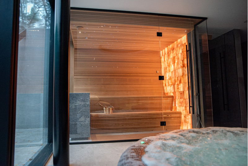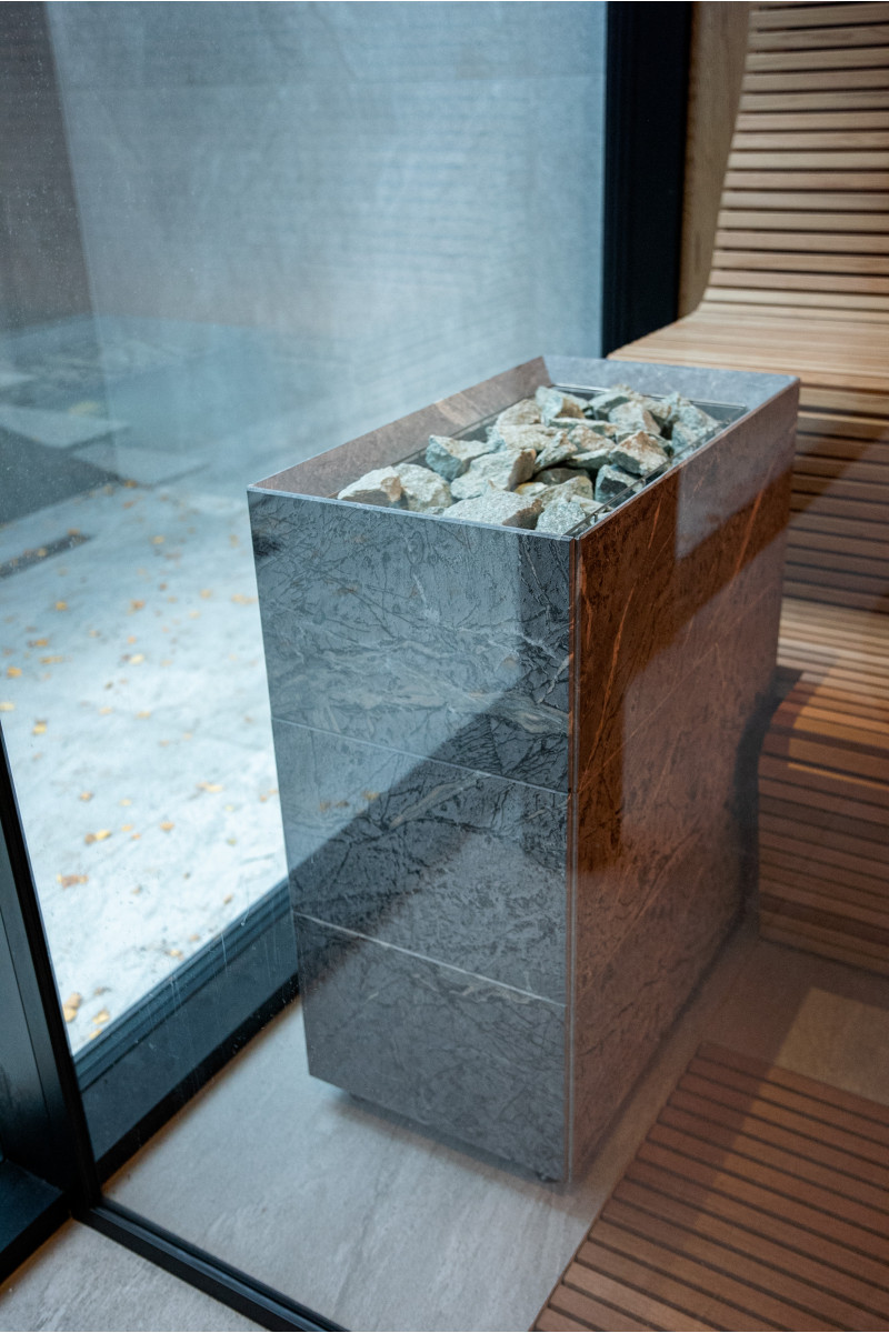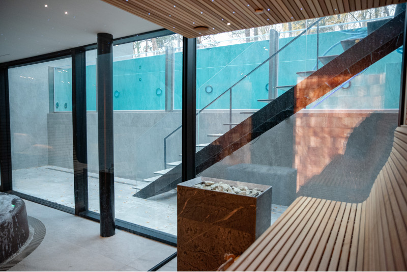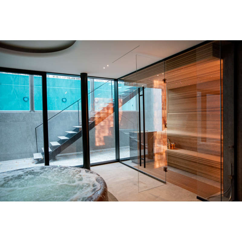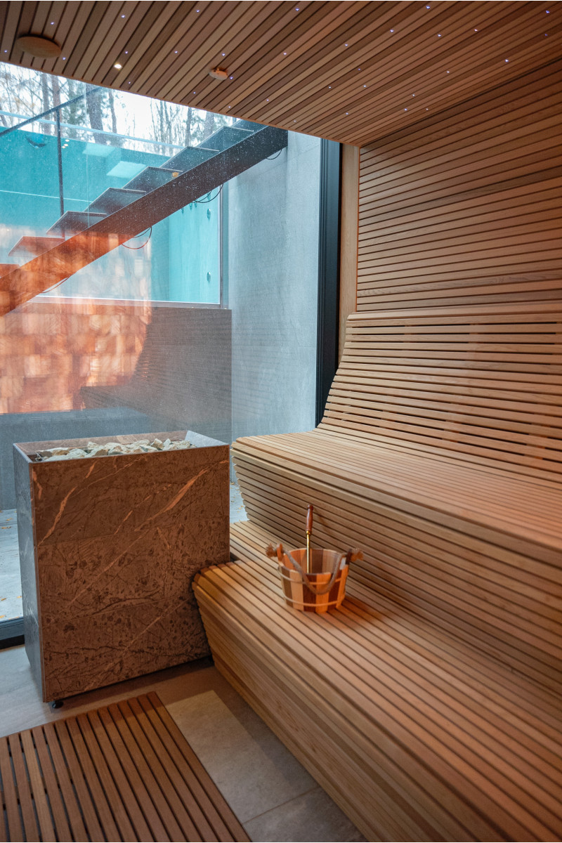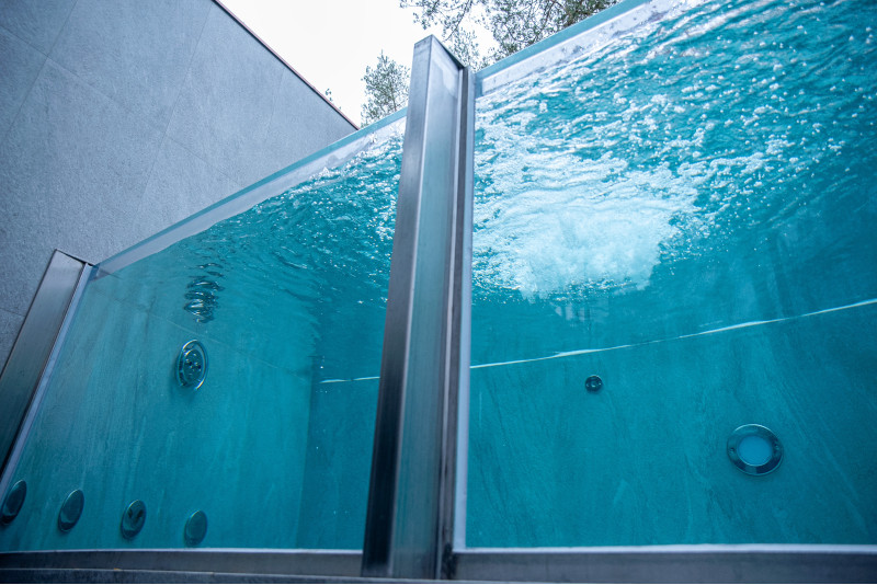 Individuellt projekt av bastu, utomhuspool, hällanordning och bubbelpool