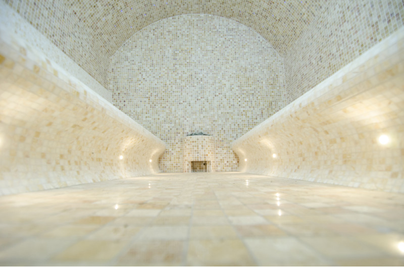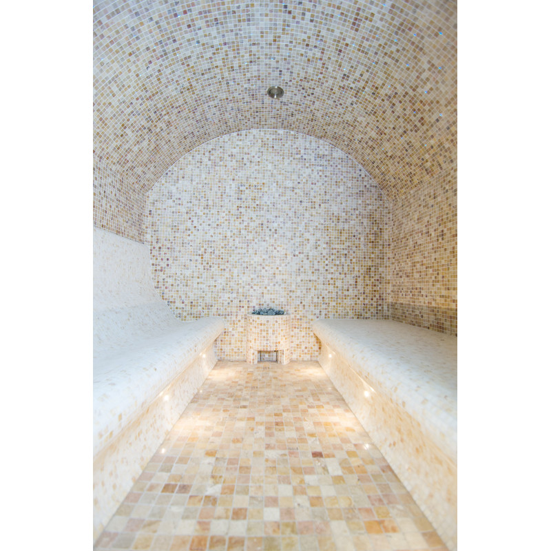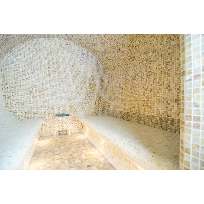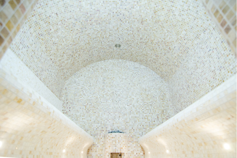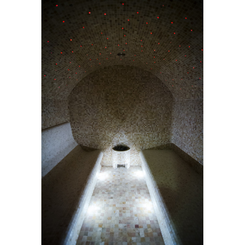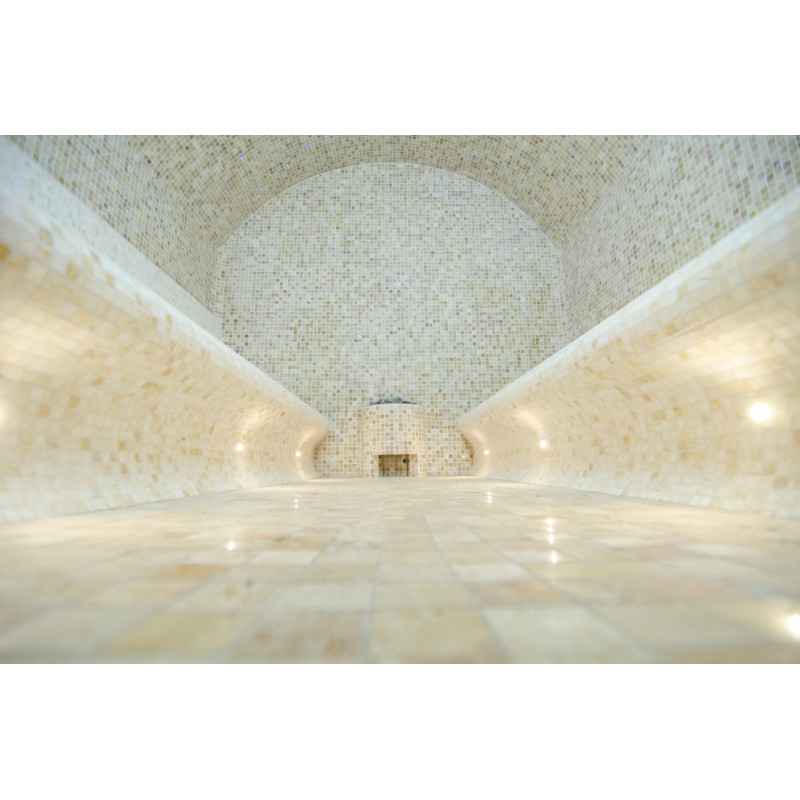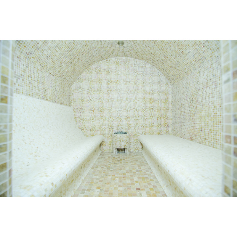 På kundens begäran är bastubäddarna utformade på två sätt – du kan njuta av bastun både liggande och sittande. Ångbadsängar, väggar och tak är gjorda individuellt av speciell extruderad polystyren. Bänkarna för att sitta är placerade på höger sida och på vänster sida finns bänkar för att njuta av bastun liggandes. Bågformade tak förhindrar kondensering av ånga från att droppa från dem.