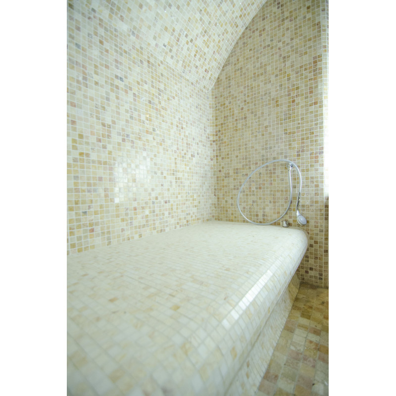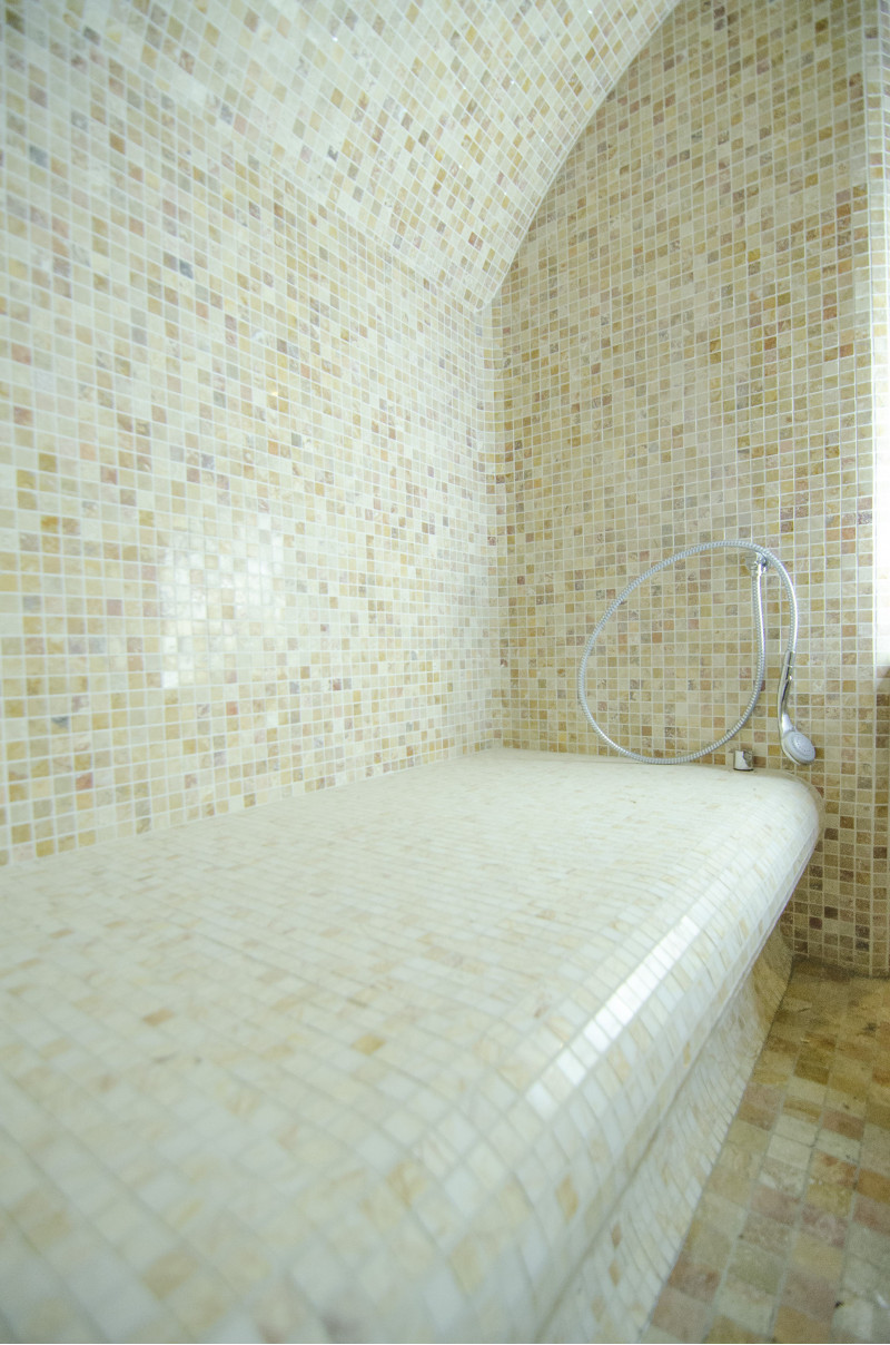 Efterbehandling - hela basturummet och bänkarna är dekorerade med mosaikplattor.