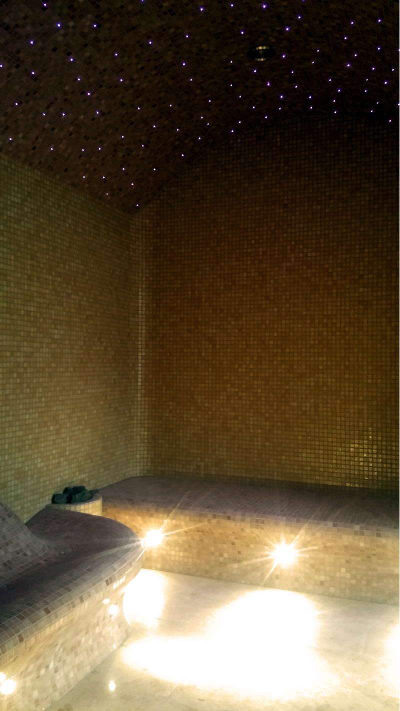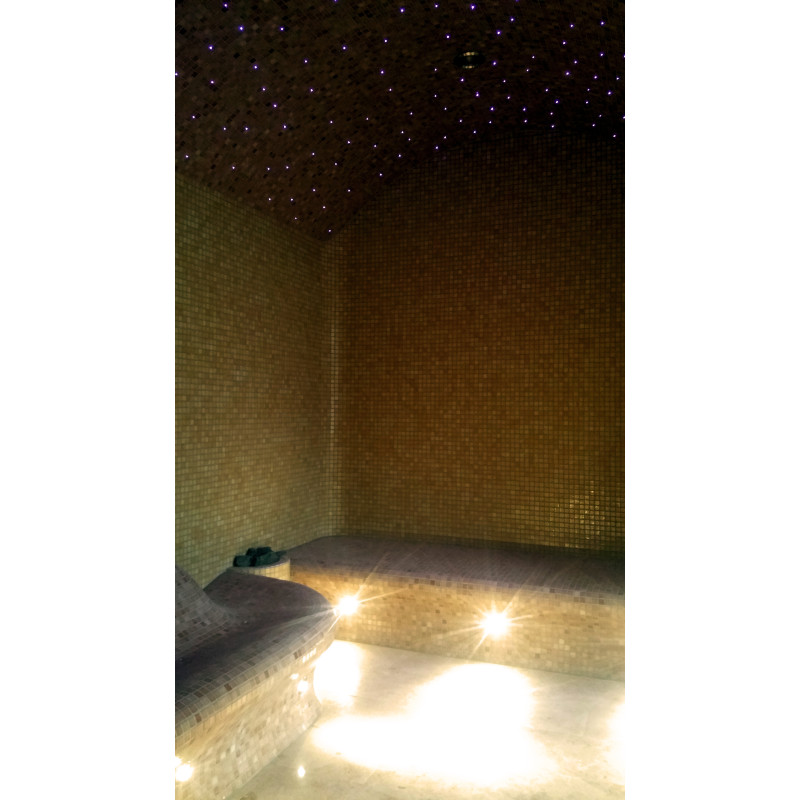 Fiberoptiskt belysningssystem för taket - "stjärnhimmel". Under bänkarna finns LED-belysning för att lysa upp golvet.