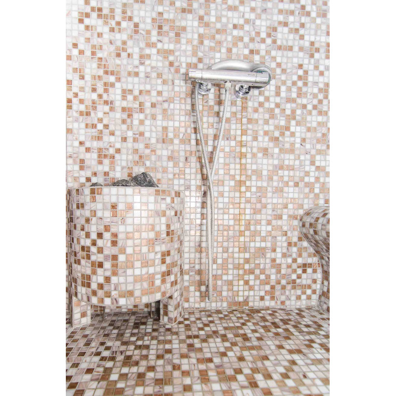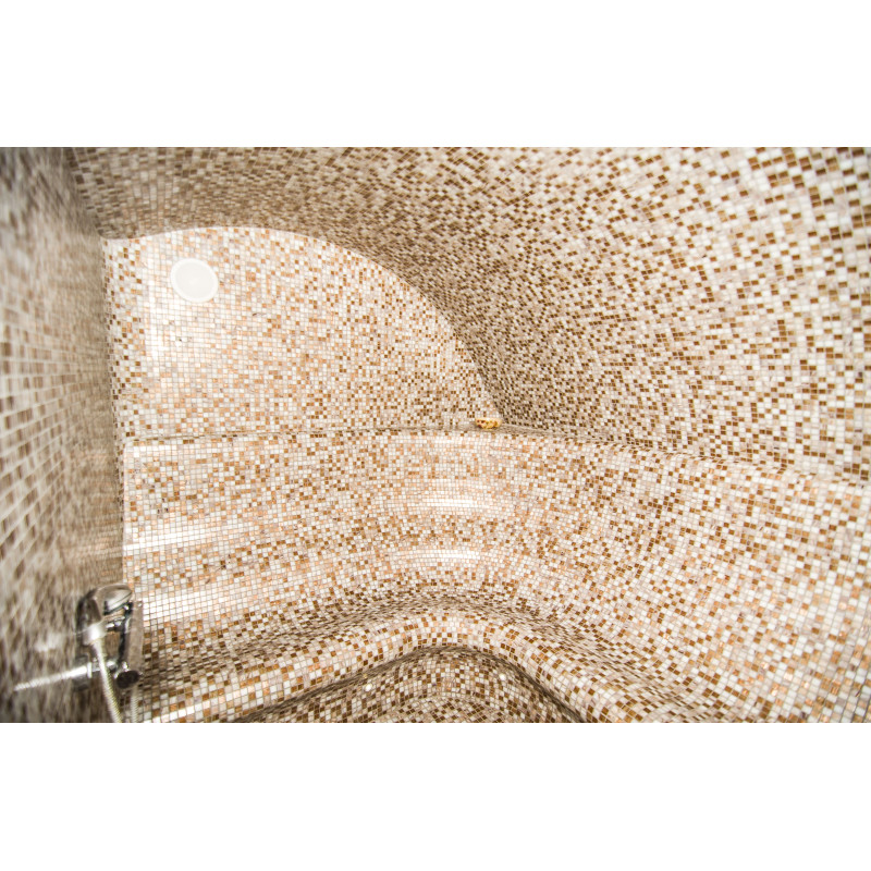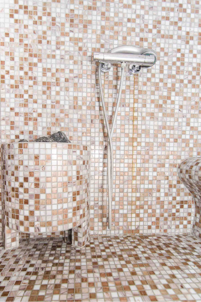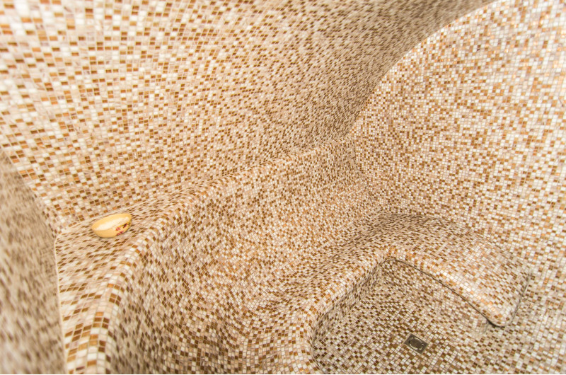 Finish - neutralfärgade mosaikplattor av krossat glas.