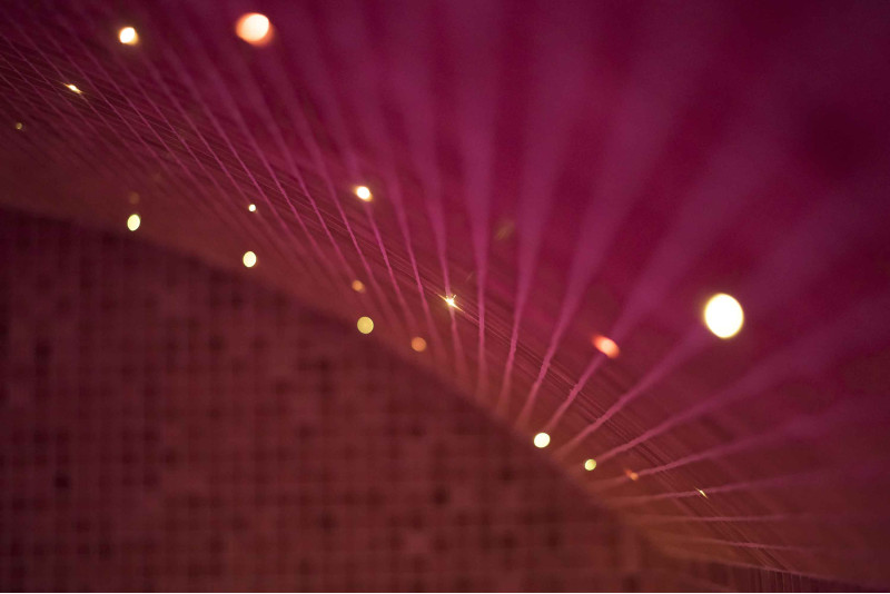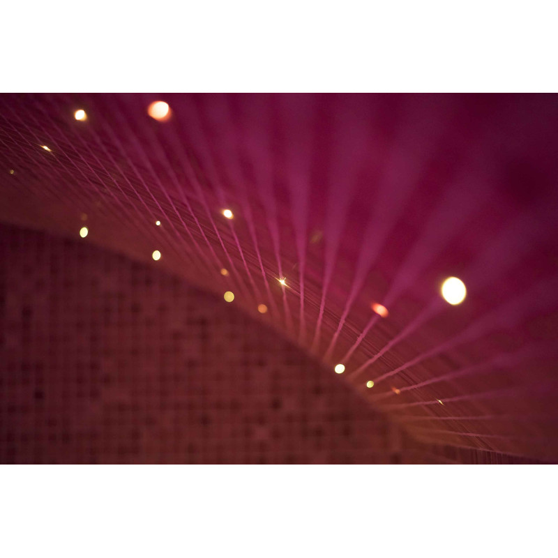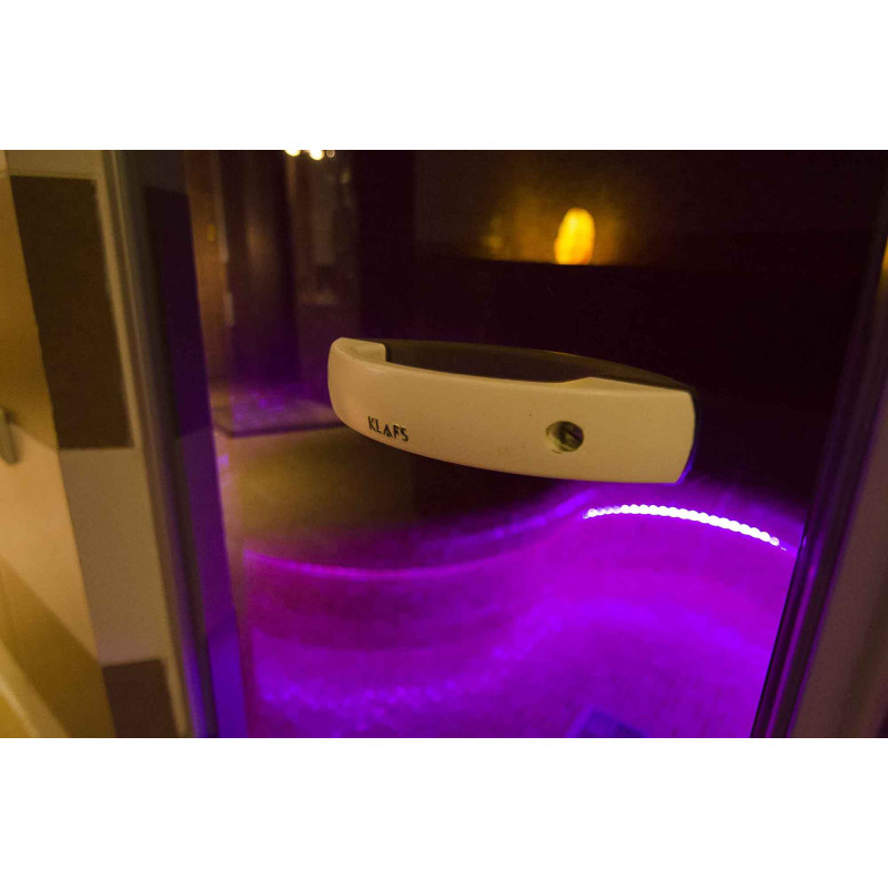 Belysningssystem - taket är upplyst med ett fiberoptiskt belysningssystem "Stjärnhimmel". Fiberoptisk belysning är en långvarig, mångsidig, ekonomisk och enkel lösning. Tack vare det kan du extrahera de mest imponerande belysningsalternativen. "Stjärnhimlen" skapar en mysig miljö och kompletterar perfekt upplevelsen av att värma upp i bastun. Under bänkarna finns färgad belysning för att lysa upp golvet. Färger kan ändras.