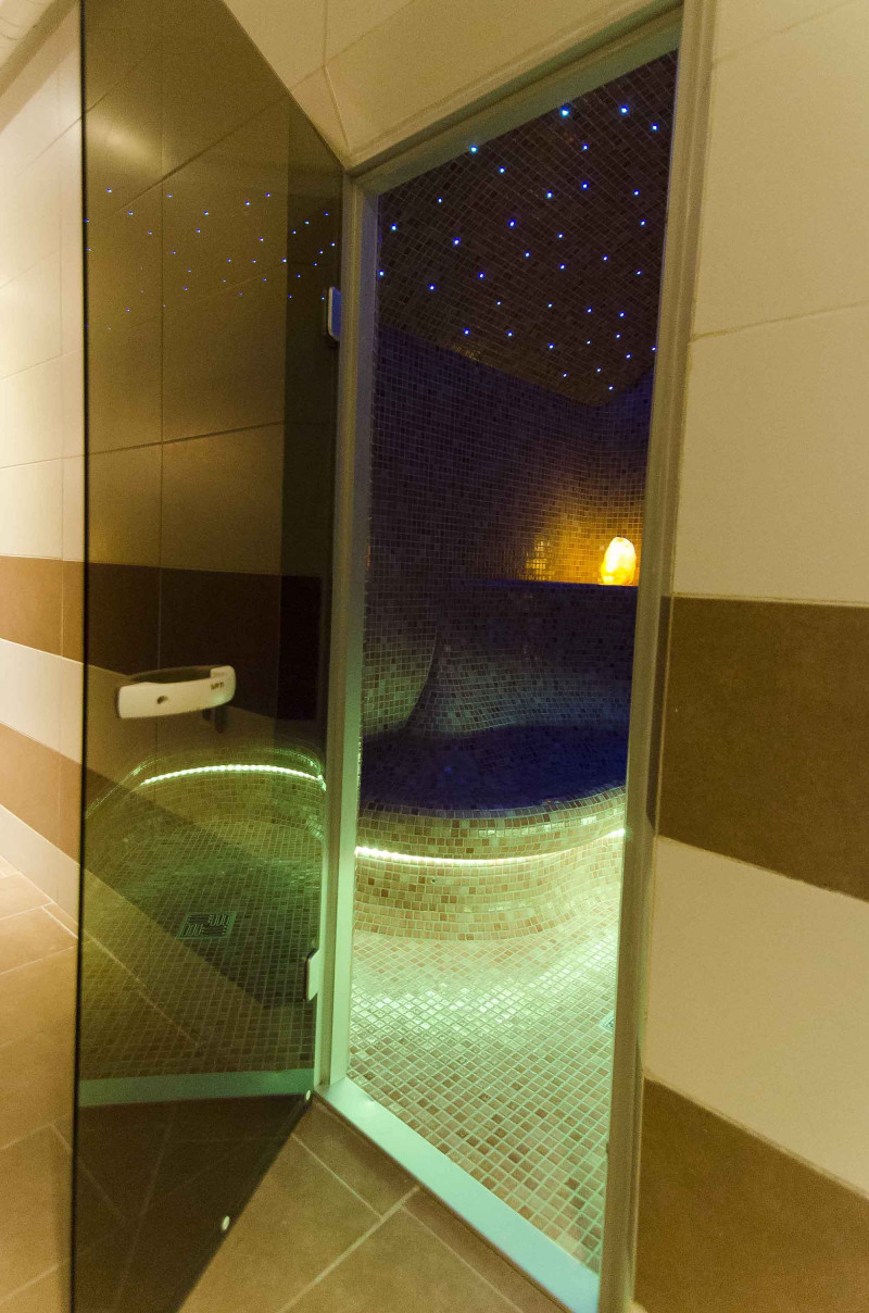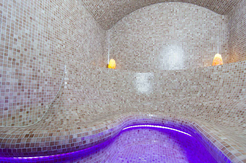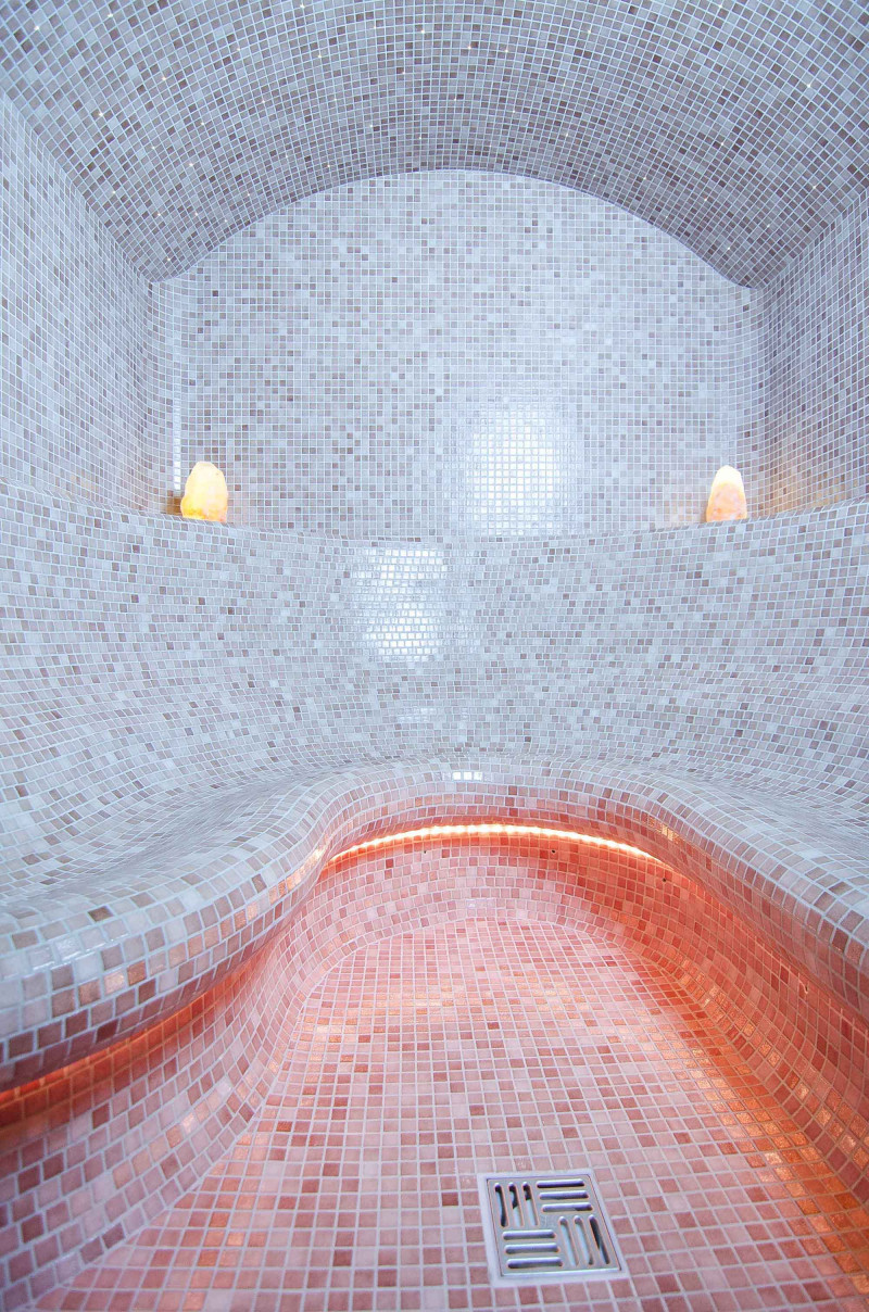 Ångbastubänkar, väggar och tak är gjorda av speciell extruderad polystyren enligt ett individuellt projekt. Takbågarna är formade så att ångkondensatet som samlats på dem inte droppar på personerna som njuter av bastun.