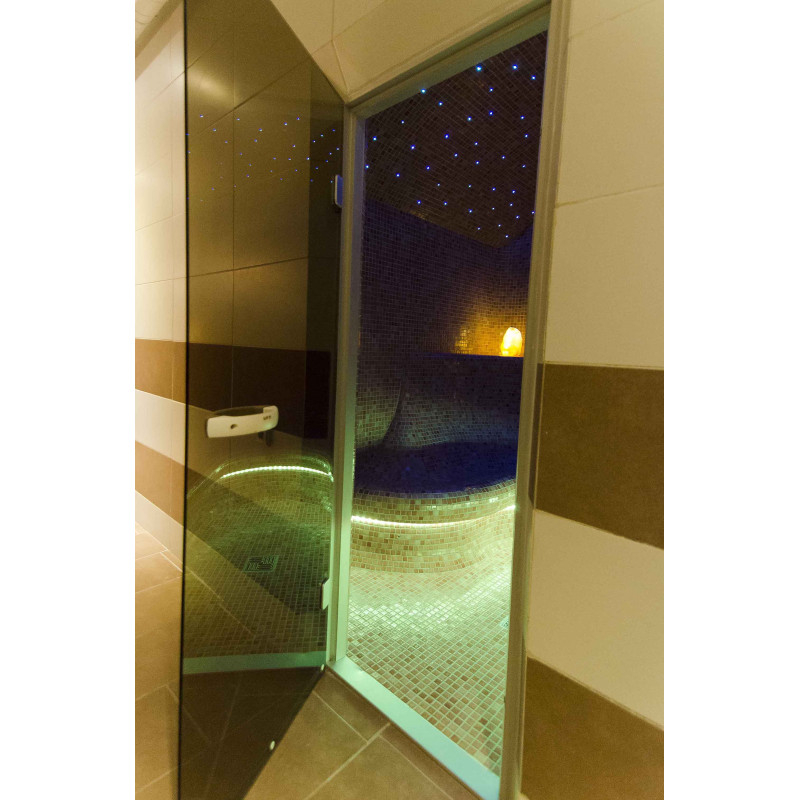 Dörr i härdat glas med aluminiumram, värme- och fuktbeständig.
