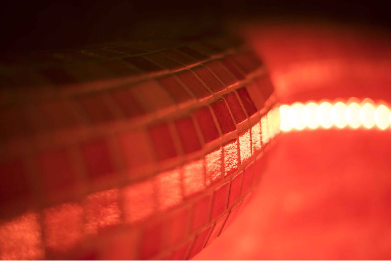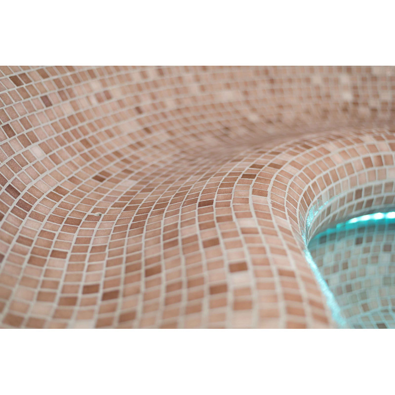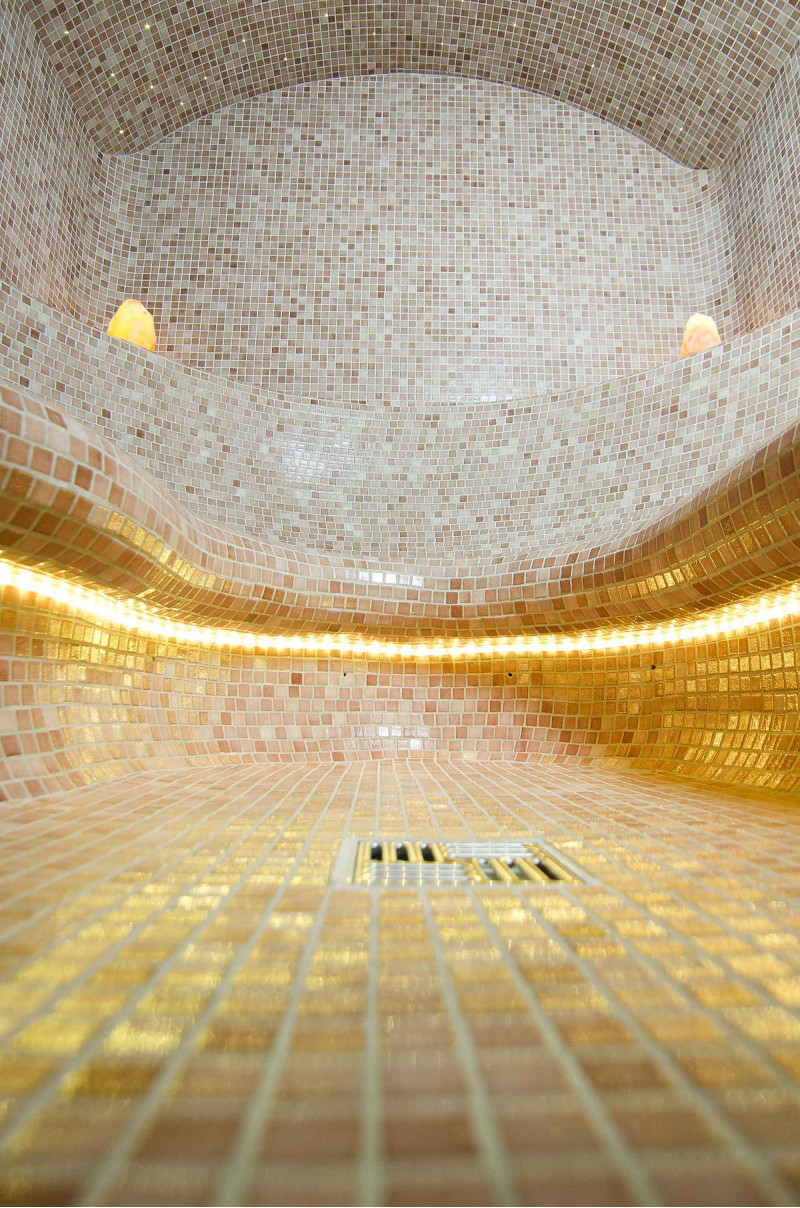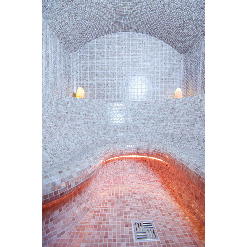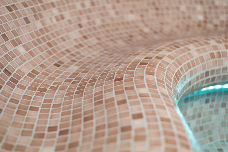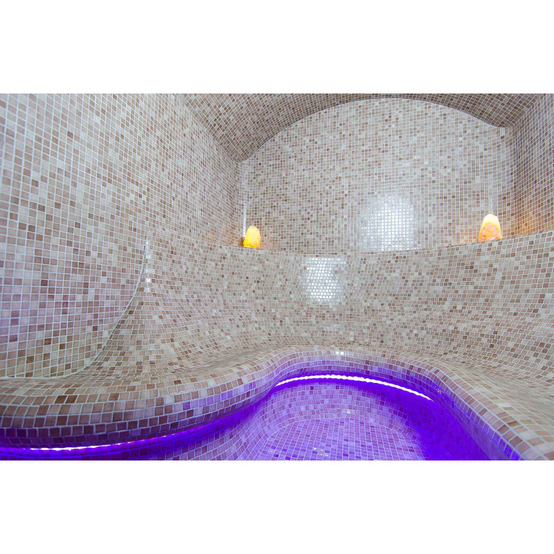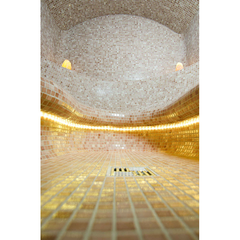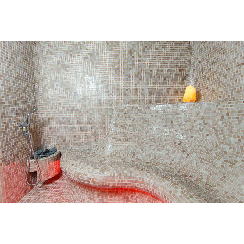 Efterbehandling - bastugolv, väggar, tak och bänkar är dekorerade med små mosaikplattor av krossat glas.