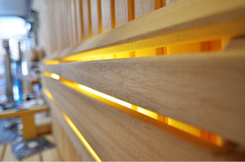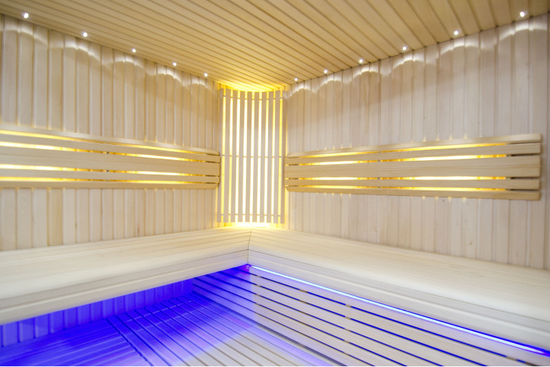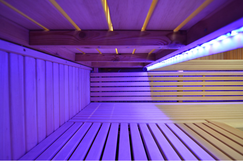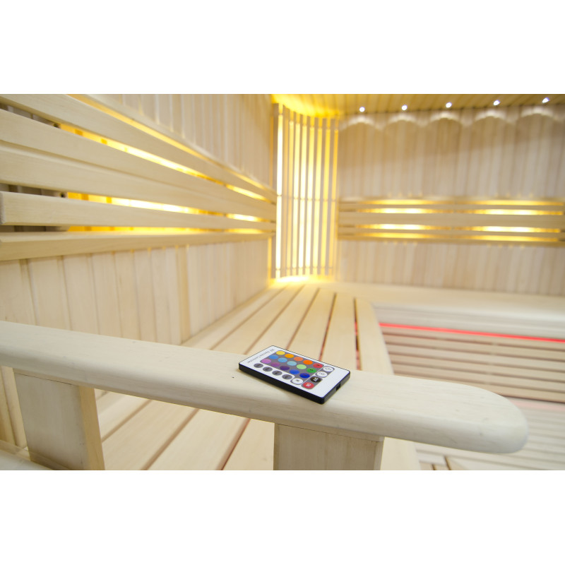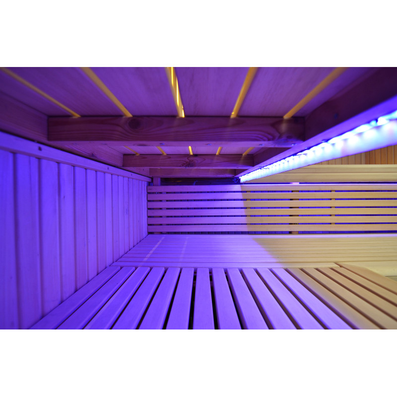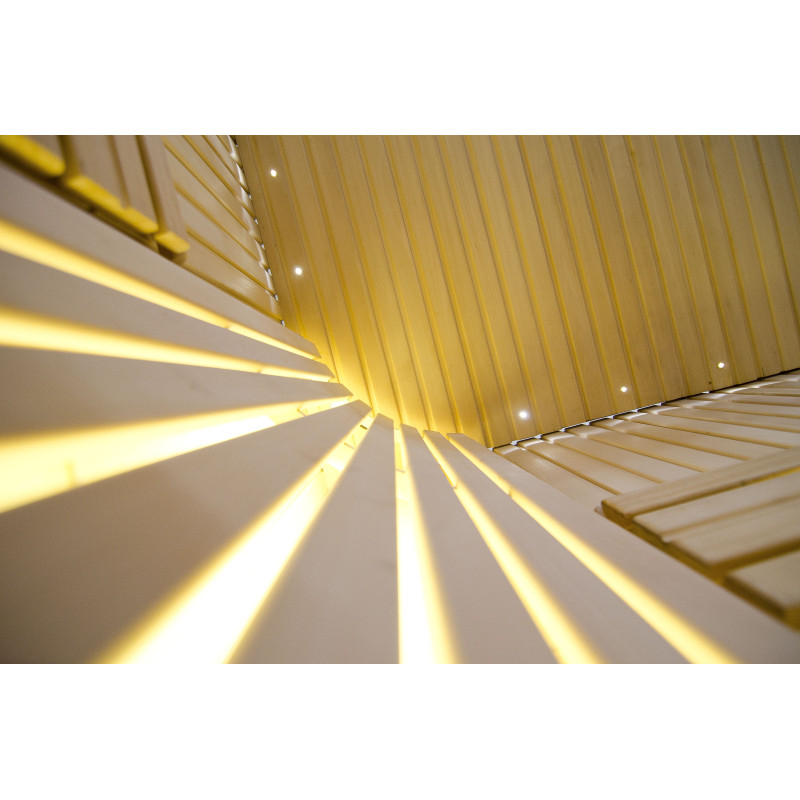 Taket är upplyst med vit LED-belysning "måne" - ett bra alternativ till fiberoptisk belysning. På väggarna under ryggstöden - LED vit varm belysning, som perfekt accentuerar träets struktur. Under bänkarna - LED RGB färgbelysning, vars färger du enkelt kan styra med fjärrkontrollen för att skapa den önskade atmosfären i bastun.
