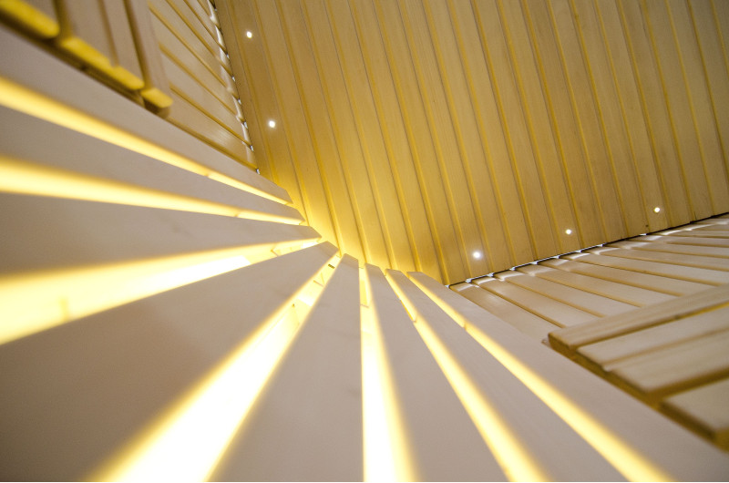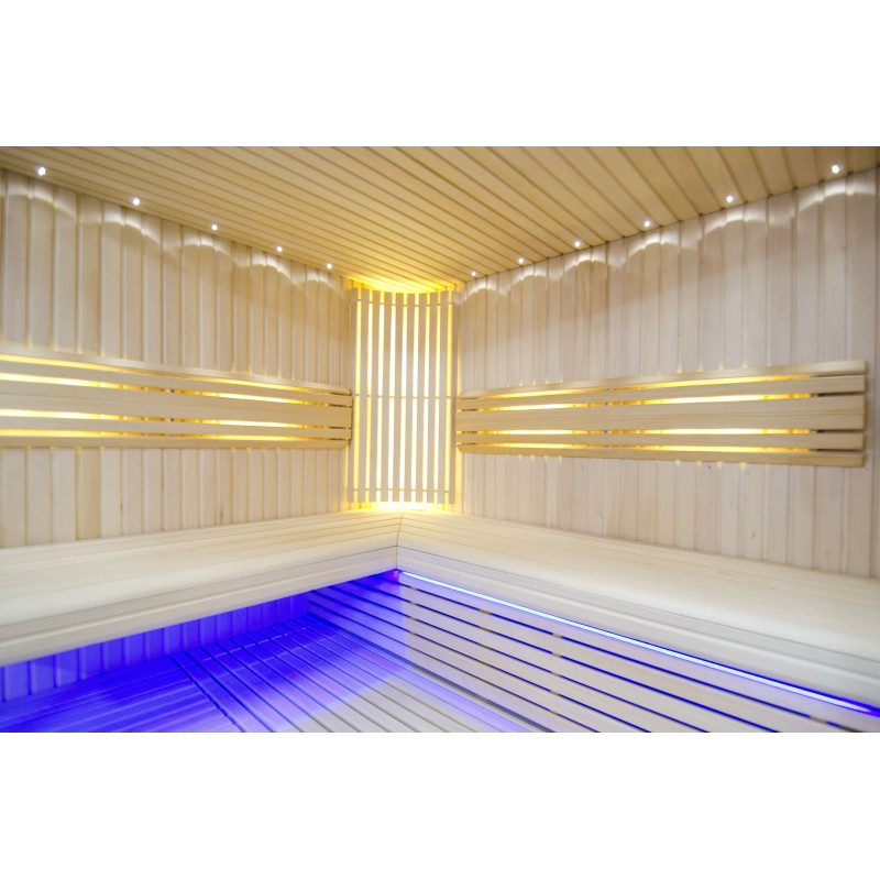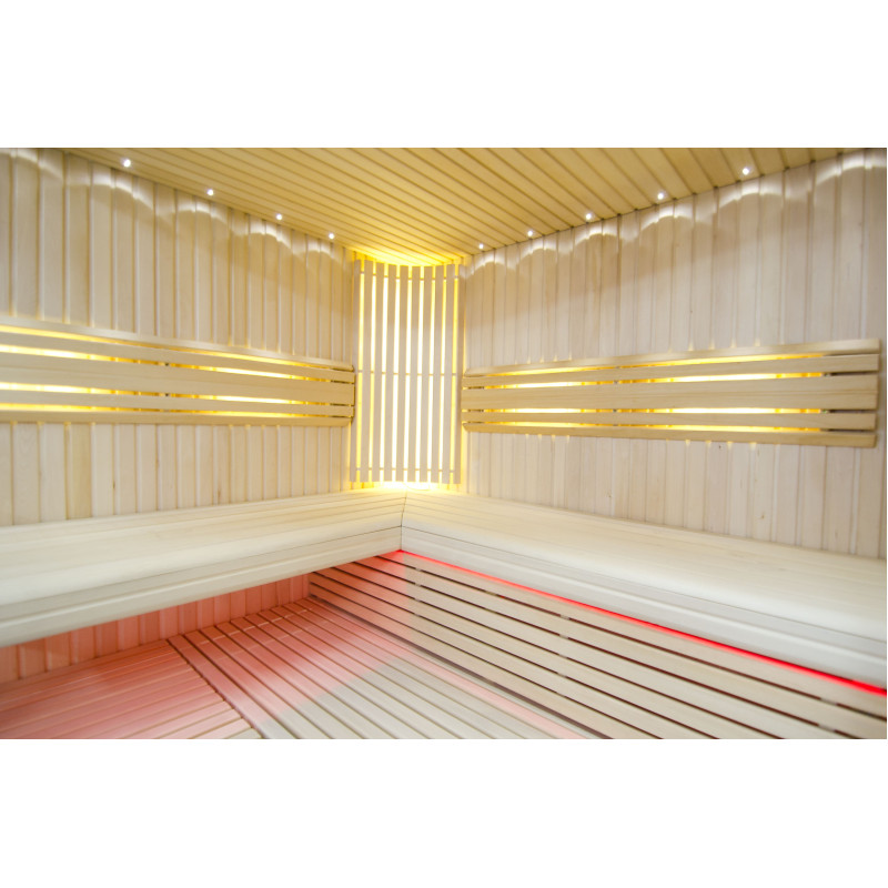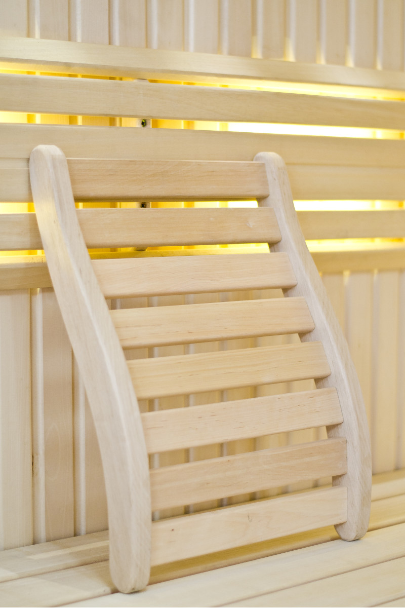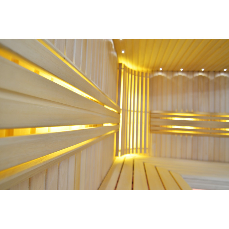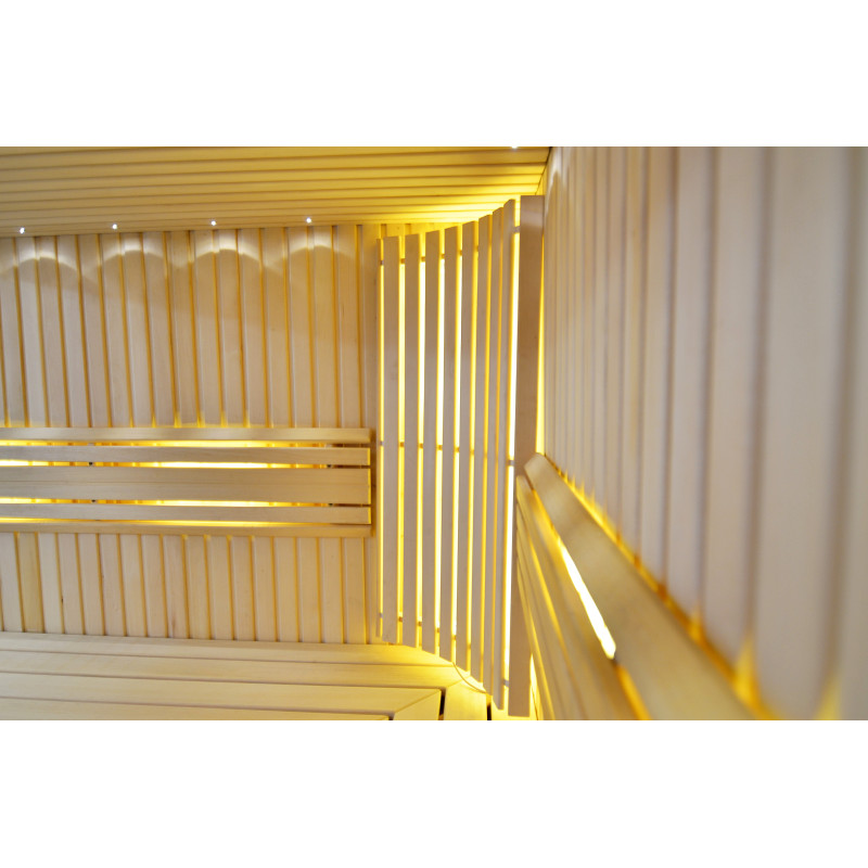 Väggarna är gjorda av ljust lindträ av högsta kvalitet och bänkarna och ryggstöden är gjorda av afrikanskt abachiträ, som inte värmer mycket, vilket gör det extra behagligt och bekvämt att sitta på.