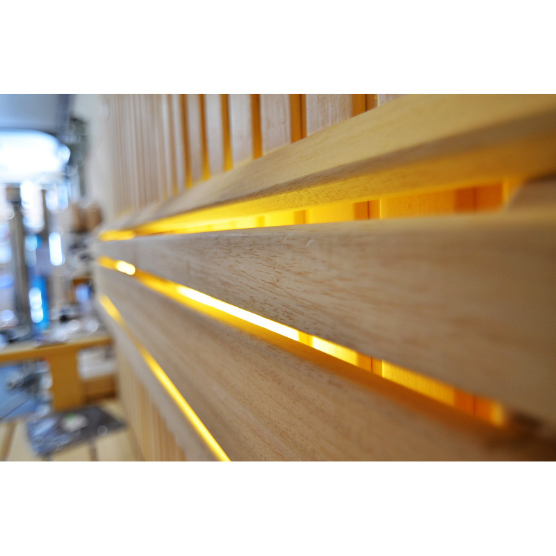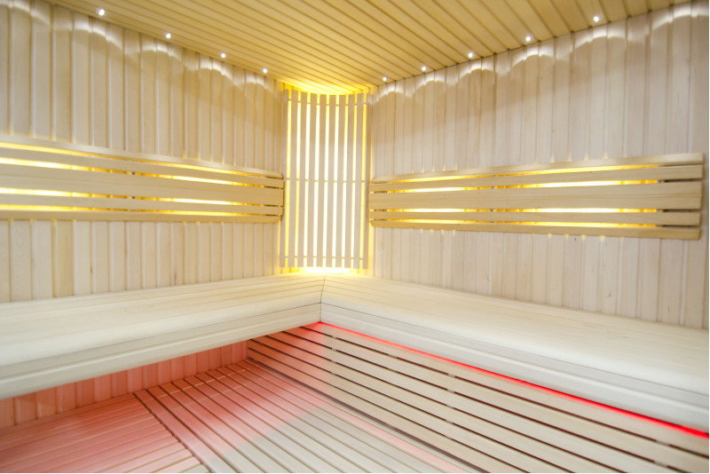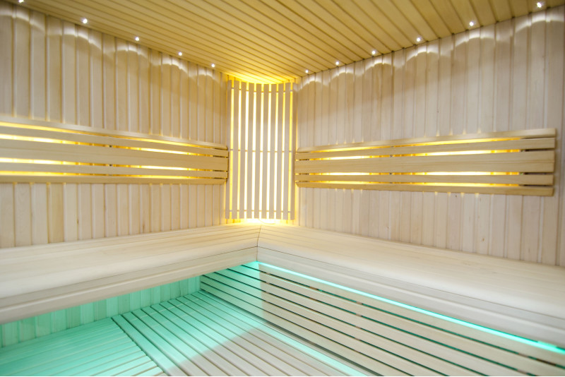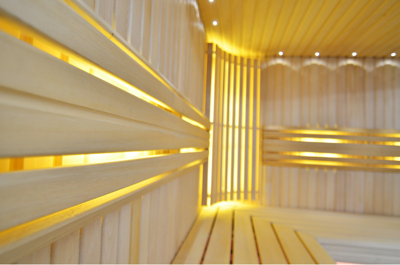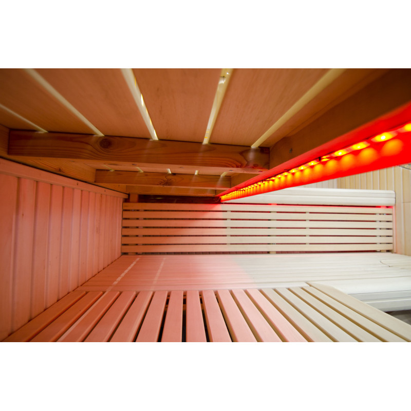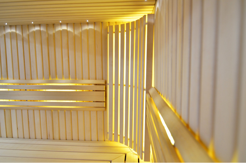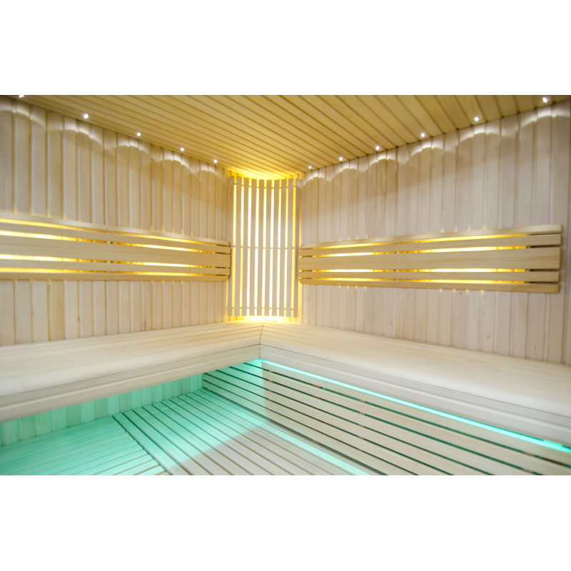 Väggarna är gjorda av ljust lindträ av högsta kvalitet och bänkarna och ryggstöden är gjorda av afrikanskt abachiträ, som inte värmer mycket, vilket gör det extra behagligt och bekvämt att sitta på.