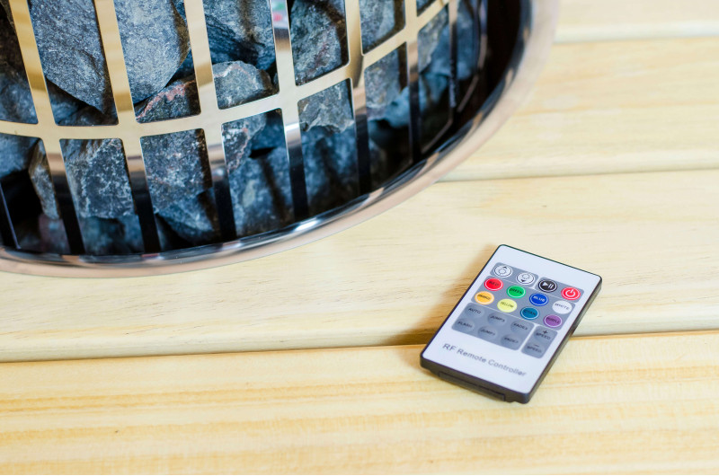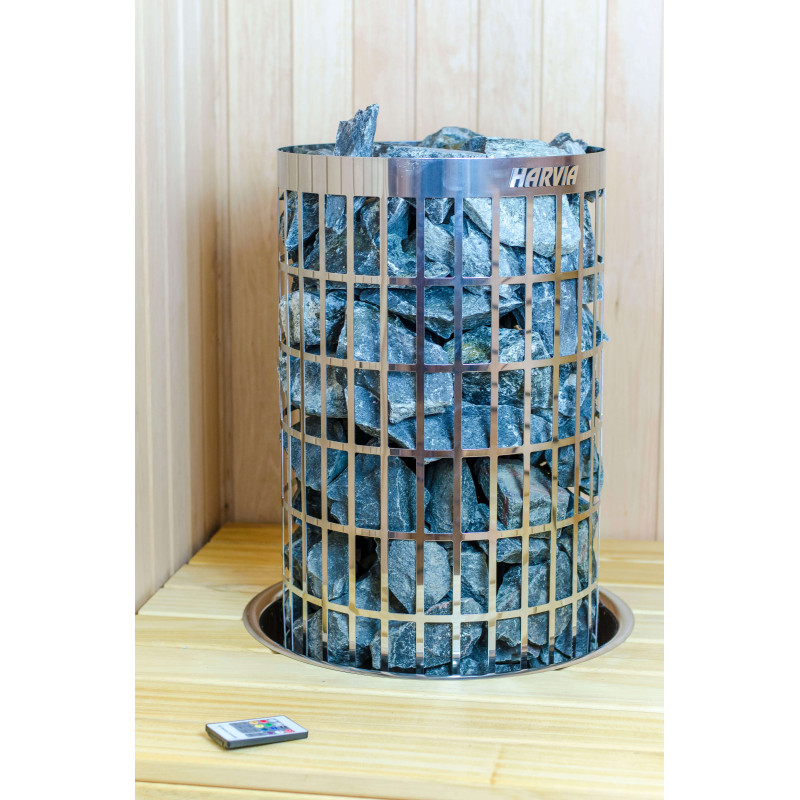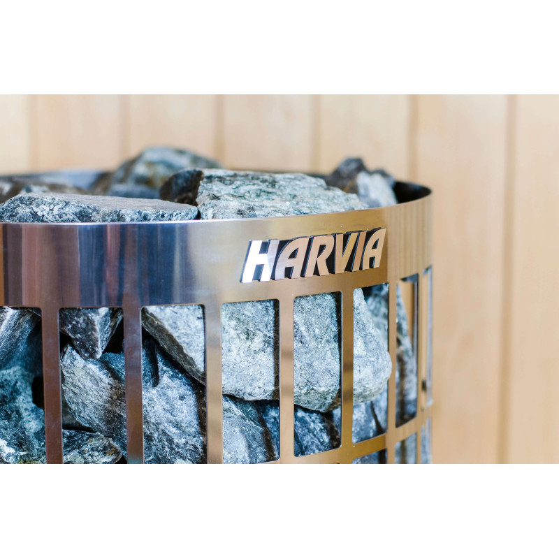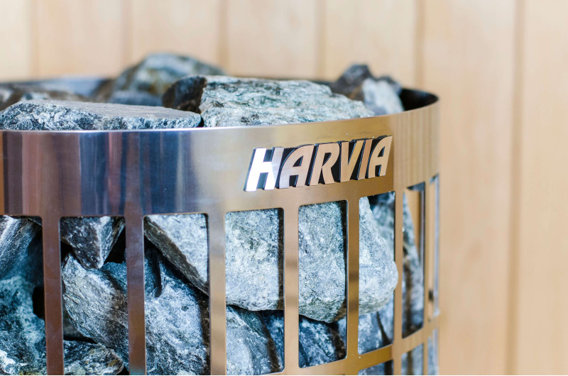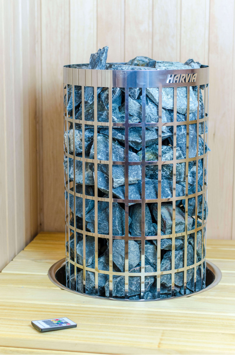 Värmare - Harvia Cilindro med en avslutande ring och fylld med gabbro diabasstenar. Dörrar - härdat bronsglas med ram i svart al.