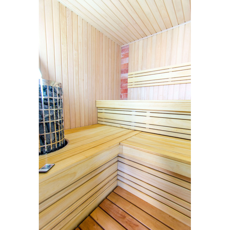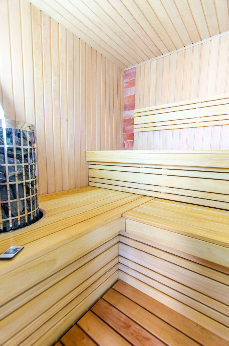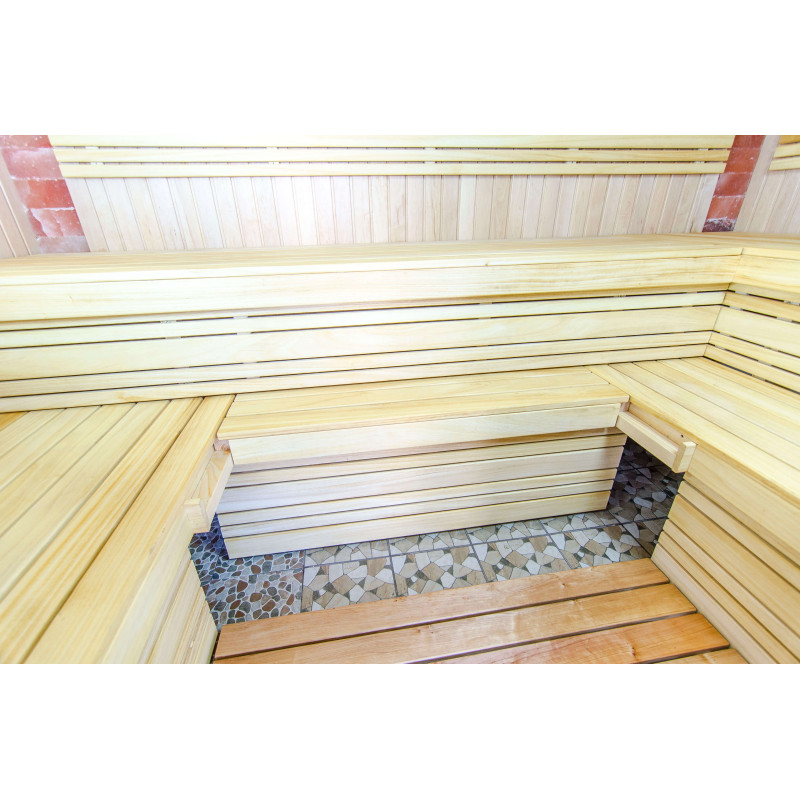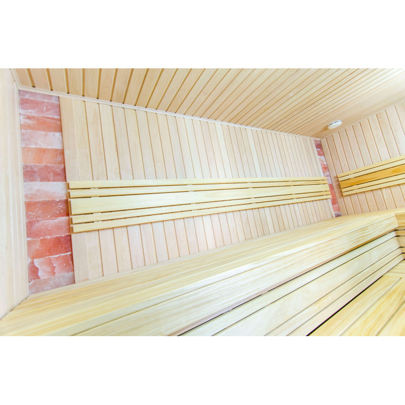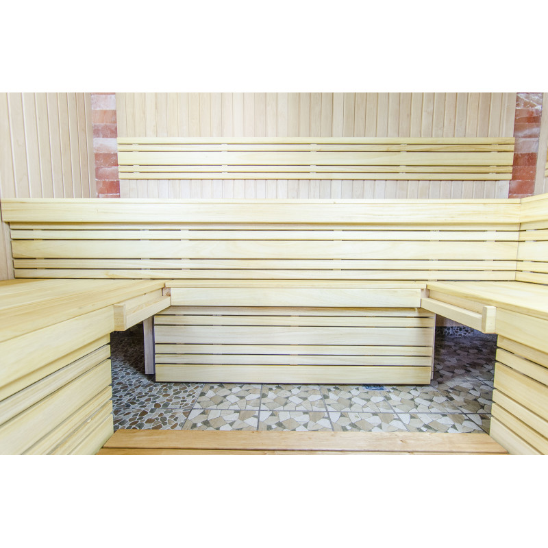 Bänkar, ryggstöd, tak, väggar - gjorda av afrikanskt icke-värmande högklassigt abachiträ, golvgaller - av svart alträ. Ryggstöden och bakom Himalayas saltstenar har inbyggd färg RGB-belysning, kontrollerad av en trådlös färgskiftande konsol som accentuerar det distinkta utseendet hos Himalayasaltet.