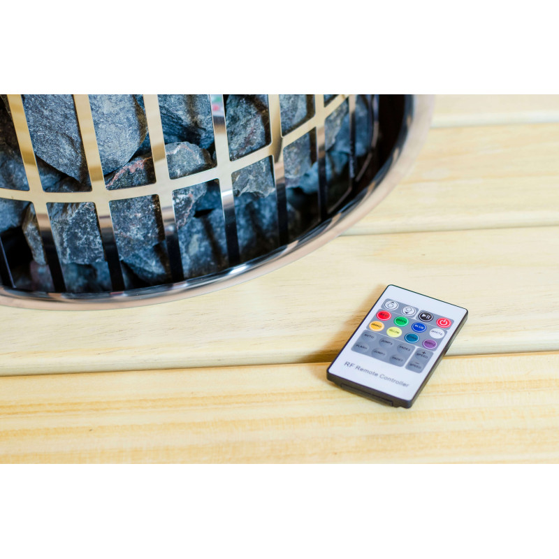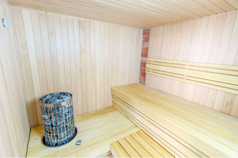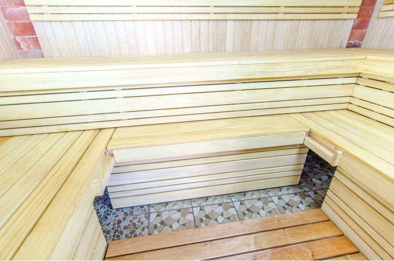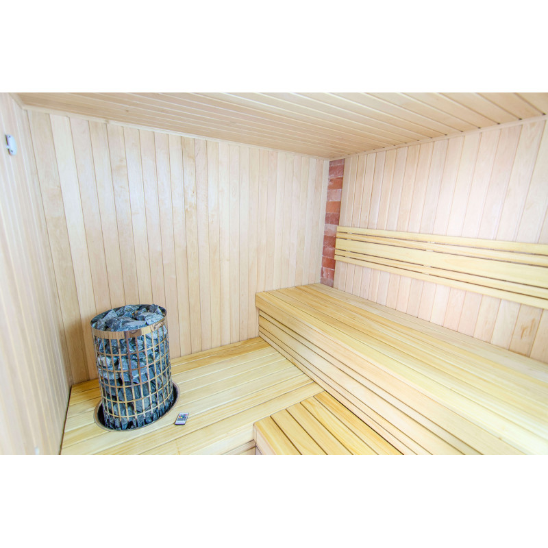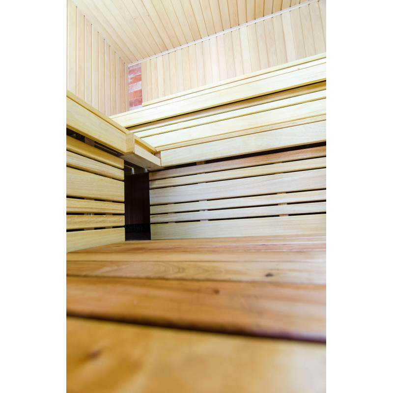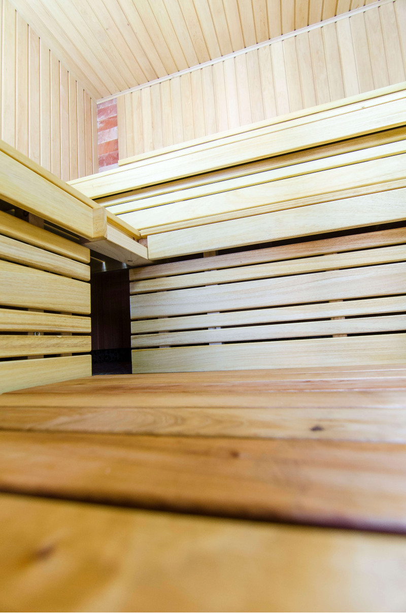 Bänkar, ryggstöd, tak, väggar - gjorda av afrikanskt icke-värmande högklassigt abachiträ, golvgaller - av svart alträ. Ryggstöden och bakom Himalayas saltstenar har inbyggd färg RGB-belysning, kontrollerad av en trådlös färgskiftande konsol som accentuerar det distinkta utseendet hos Himalayasaltet.