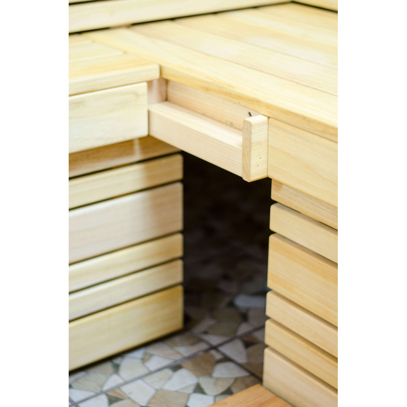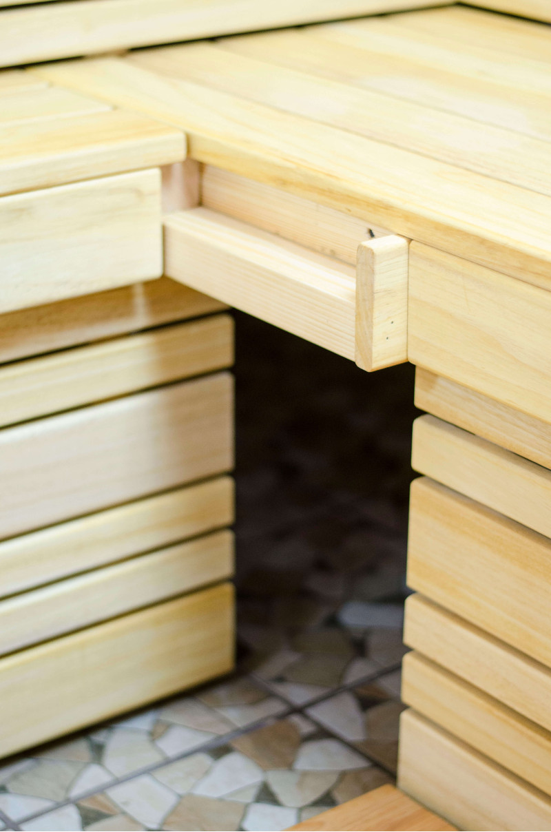 Den största fördelen med denna bastu är den skjutbara bänkbänken för bekvämt bad. På kundens begäran var solstolar som var tillräckligt breda och av rätt höjd utformade för att stå bekvämt. Under badet förvandlas solsängen till en sittgrupp. Den breda solsängen gör det mycket bekvämare att bada själv, eftersom det är möjligt att få fötterna där det är varmare.