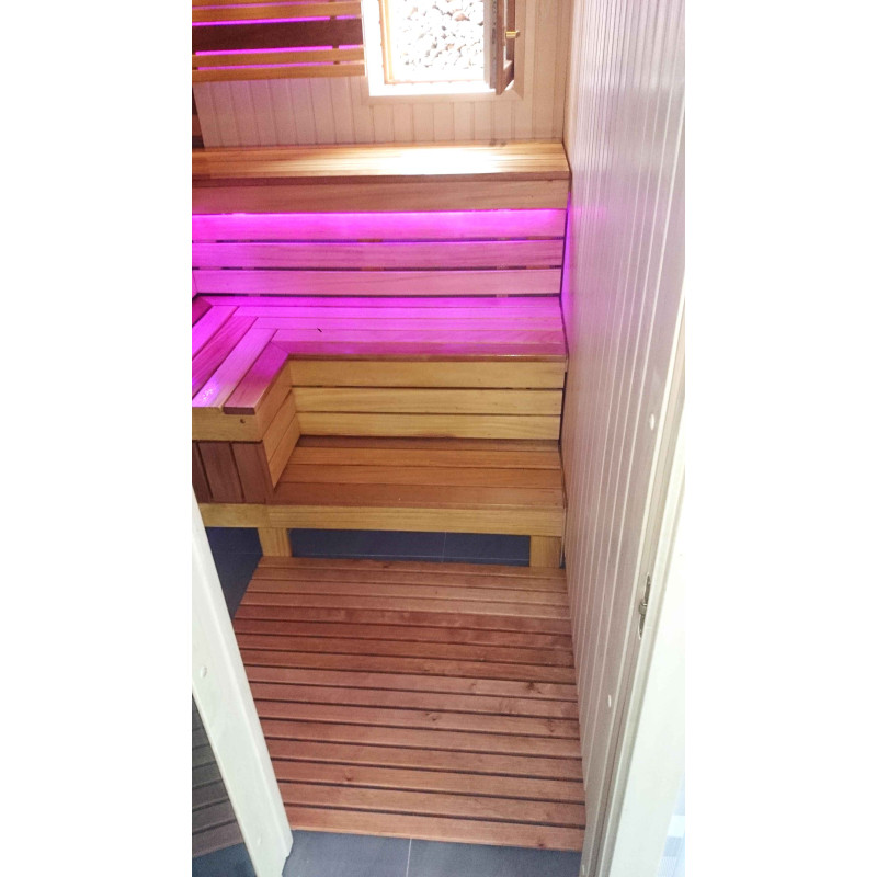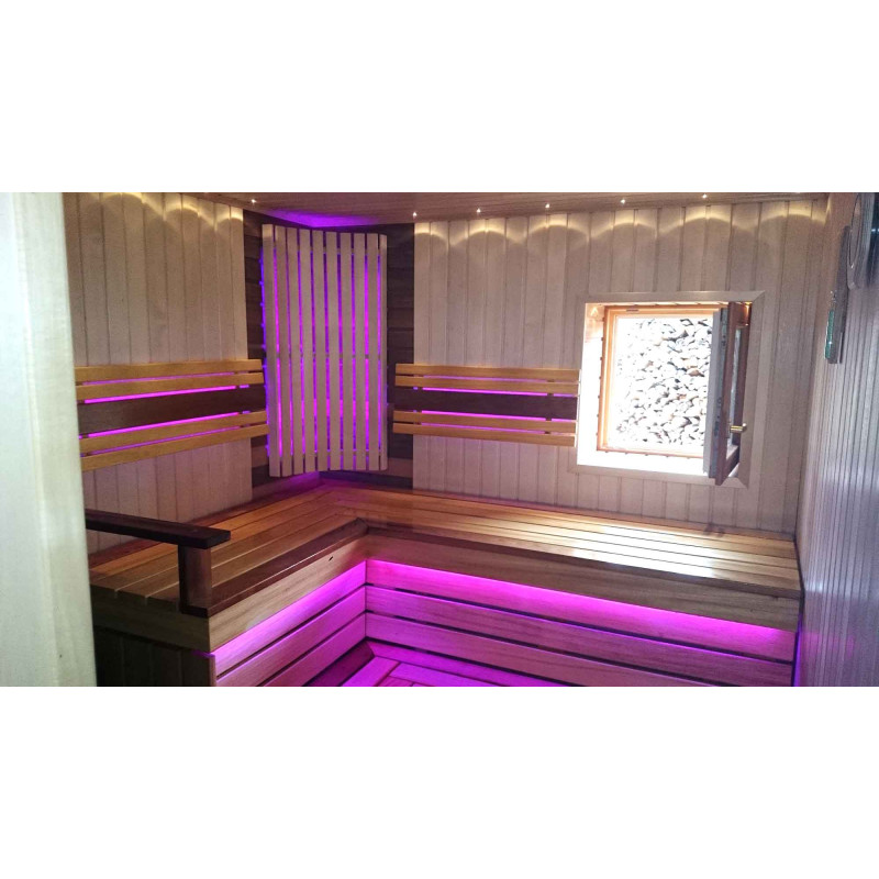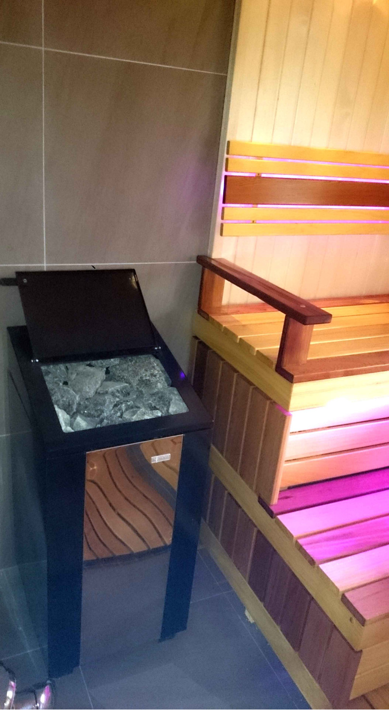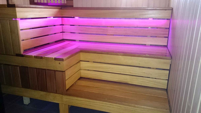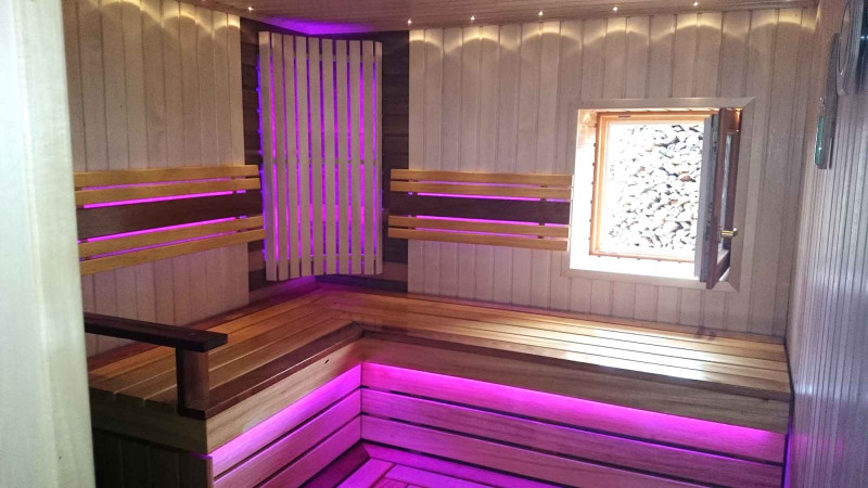 Bastun är utrustad med ett ventilationssystem. Färgad belysning installeras under bänkarna och bakom ryggstöden, vilket skapar en mysig, lugnande miljö. Hängande lampa Harvia med abachi träskydd. Harvia termometer och hygrometer, två vågar.