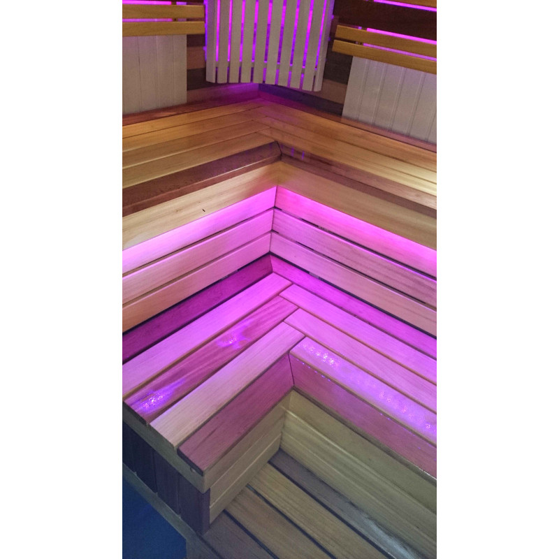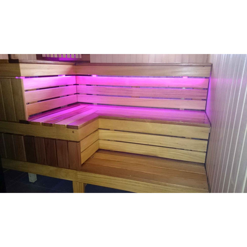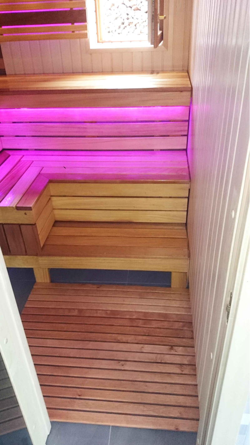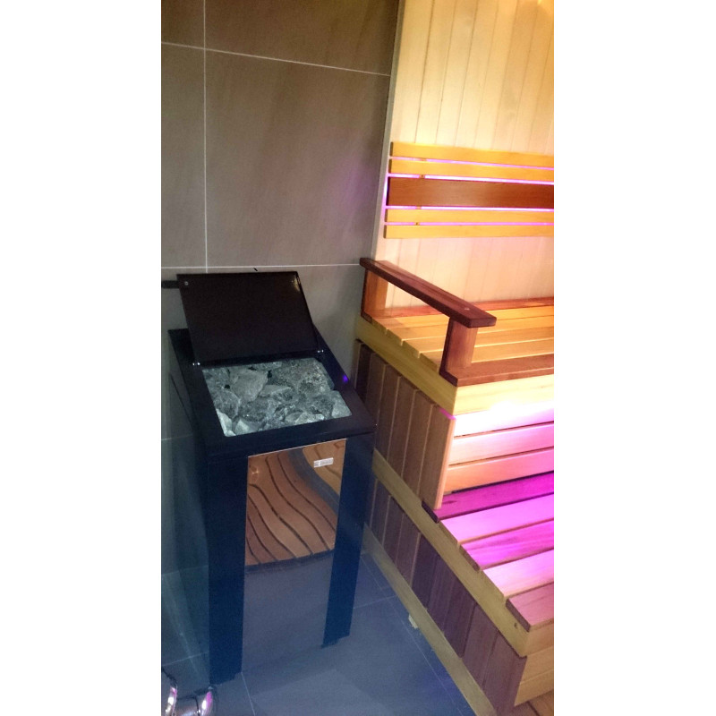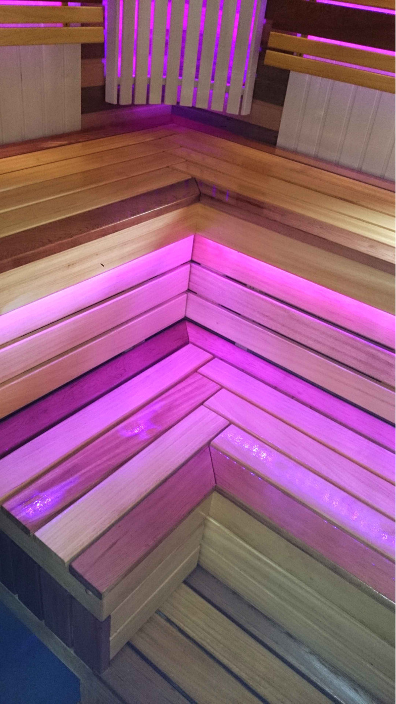 Bastun är utrustad med ett ventilationssystem. Färgad belysning installeras under bänkarna och bakom ryggstöden, vilket skapar en mysig, lugnande miljö. Hängande lampa Harvia med abachi träskydd. Harvia termometer och hygrometer, två vågar.