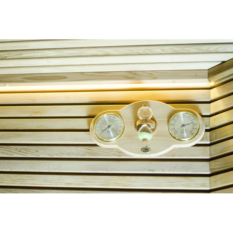 Bastutillbehör: hink- och slevsats, trätermometer med hygrometer och timglas.