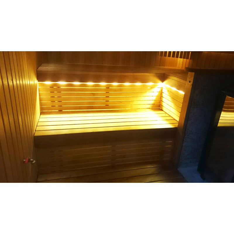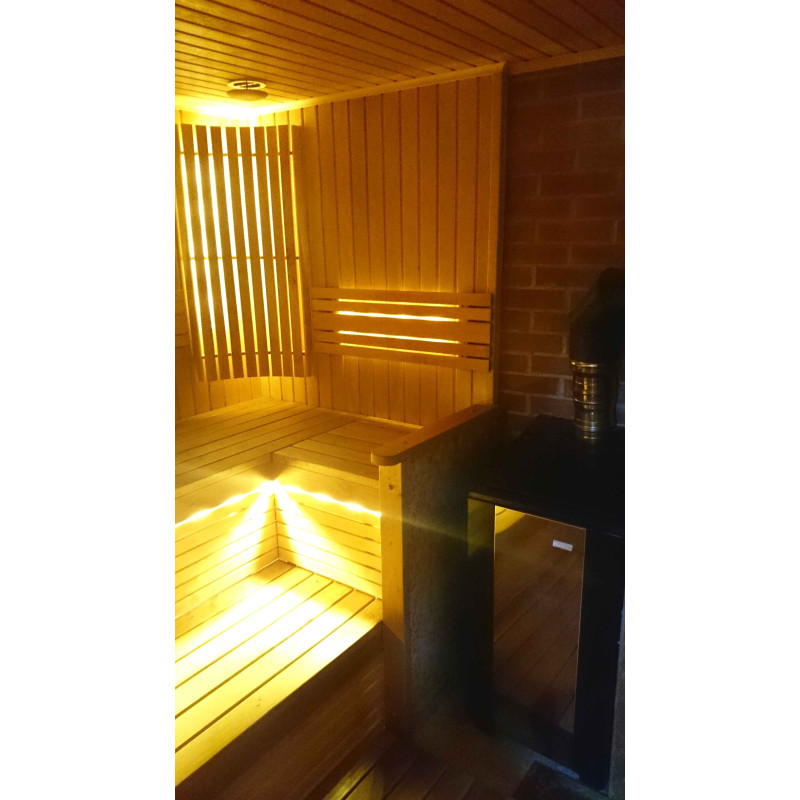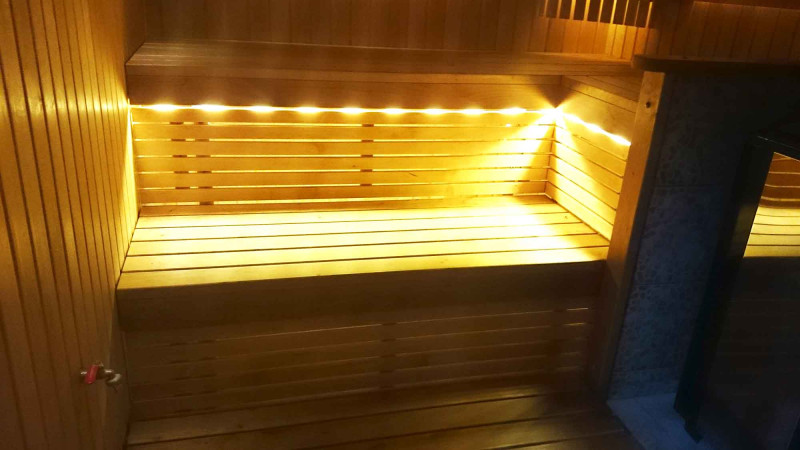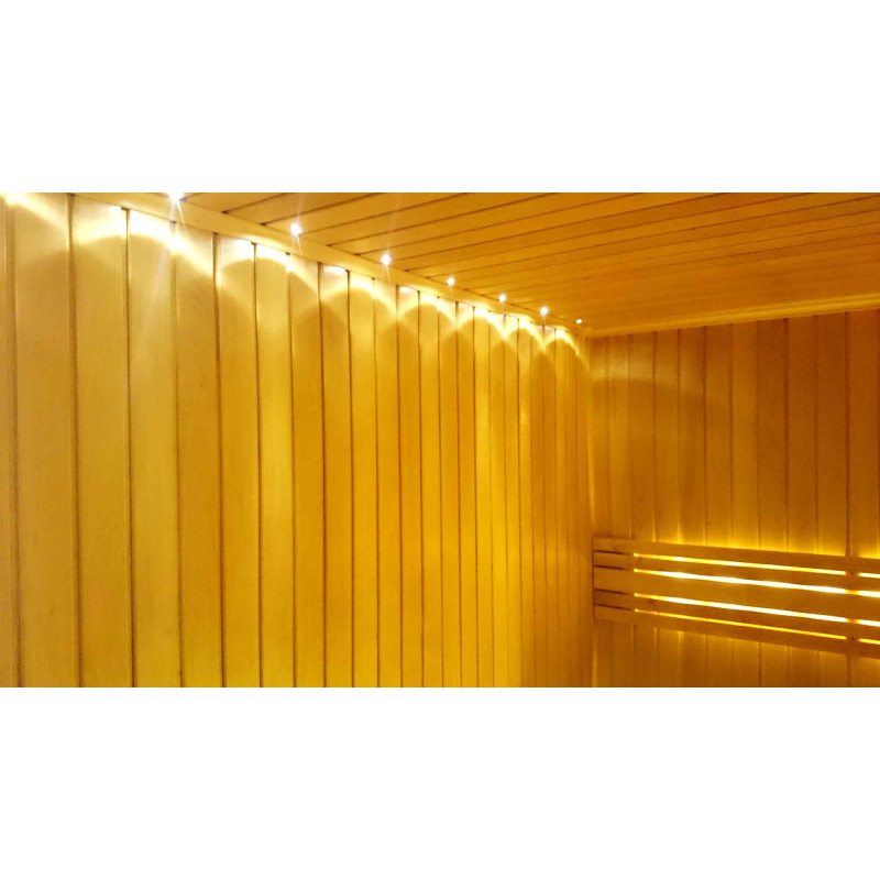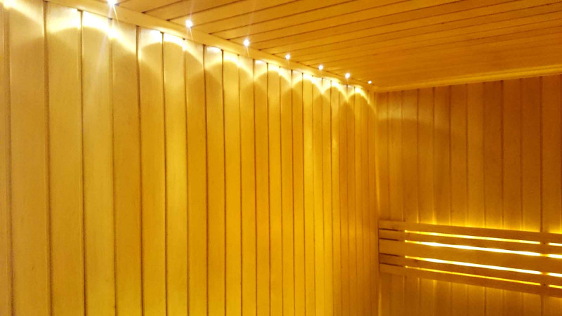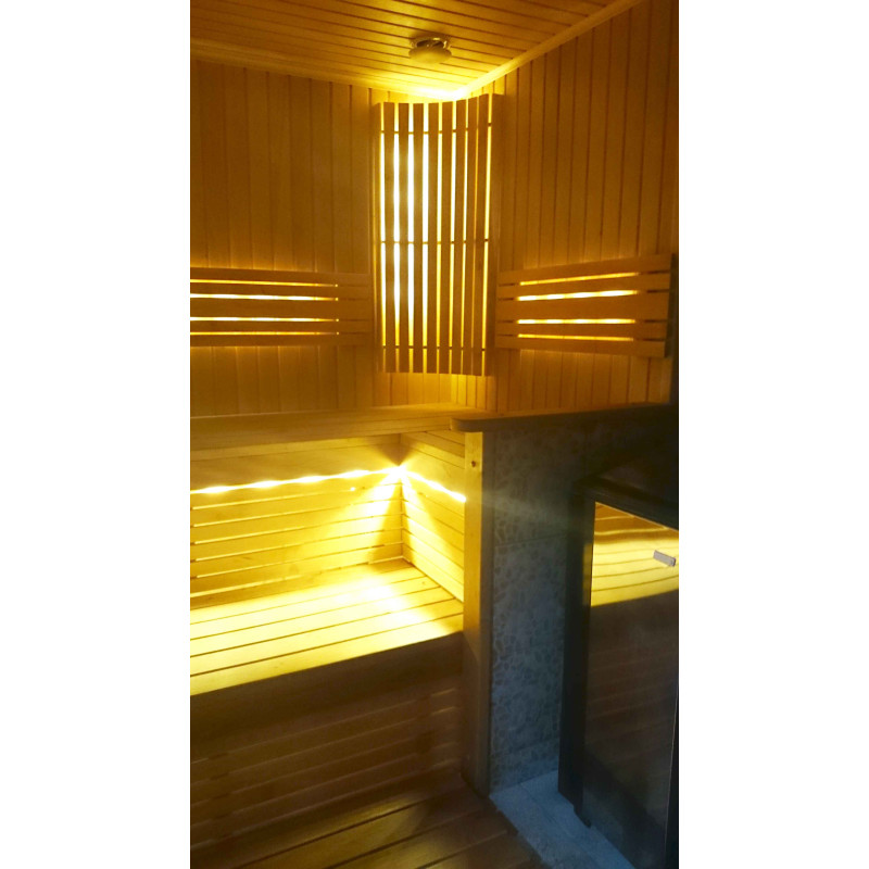 Bastubelysning är ett mycket viktigt element, eftersom det är belysningen som ger en del av bastuns avslappnande effekt. Denna bastu är utrustad med LED-lampor i taket, under solstolarna och ryggstöden. Armaturer är resistenta mot fukt och höga temperaturer.