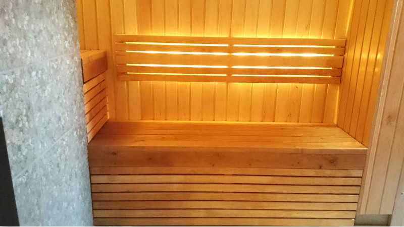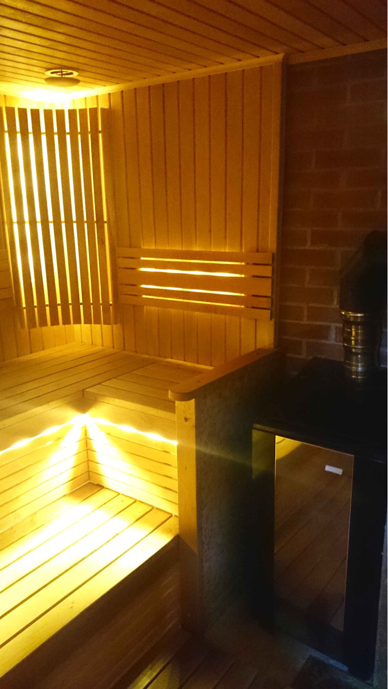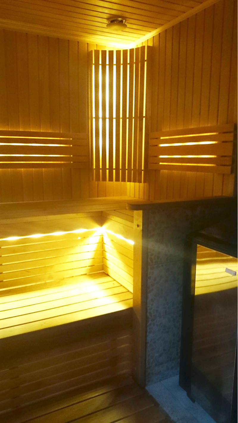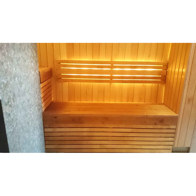 Bastubelysning är ett mycket viktigt element, eftersom det är belysningen som ger en del av bastuns avslappnande effekt. Denna bastu är utrustad med LED-lampor i taket, under solstolarna och ryggstöden. Armaturer är resistenta mot fukt och höga temperaturer.