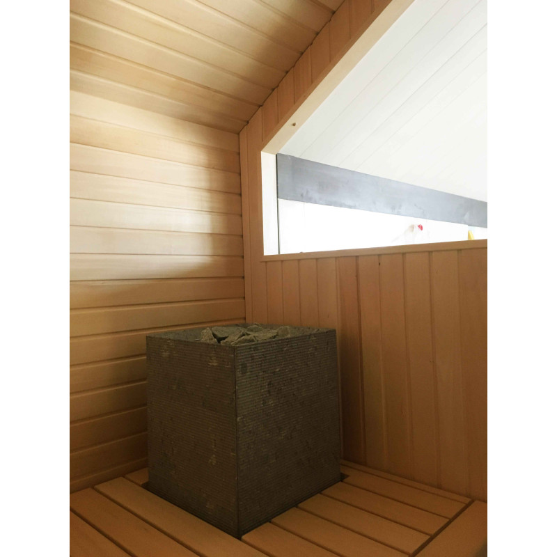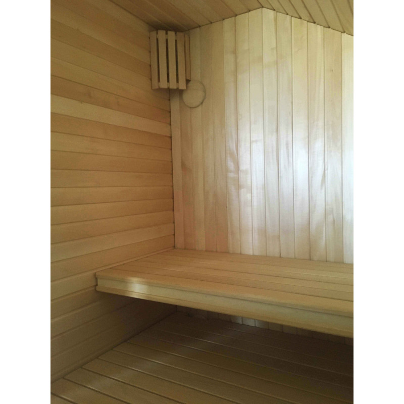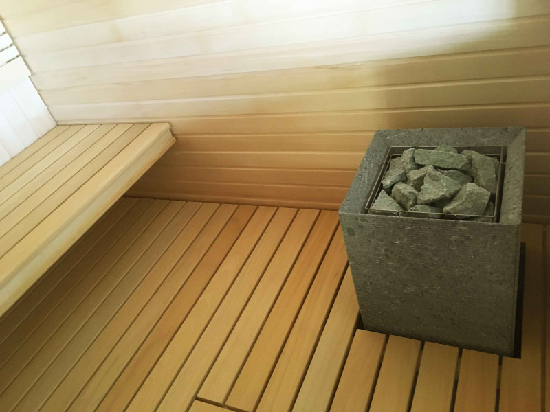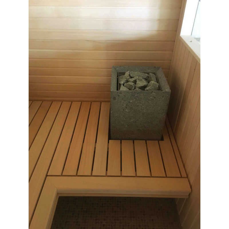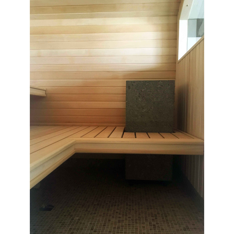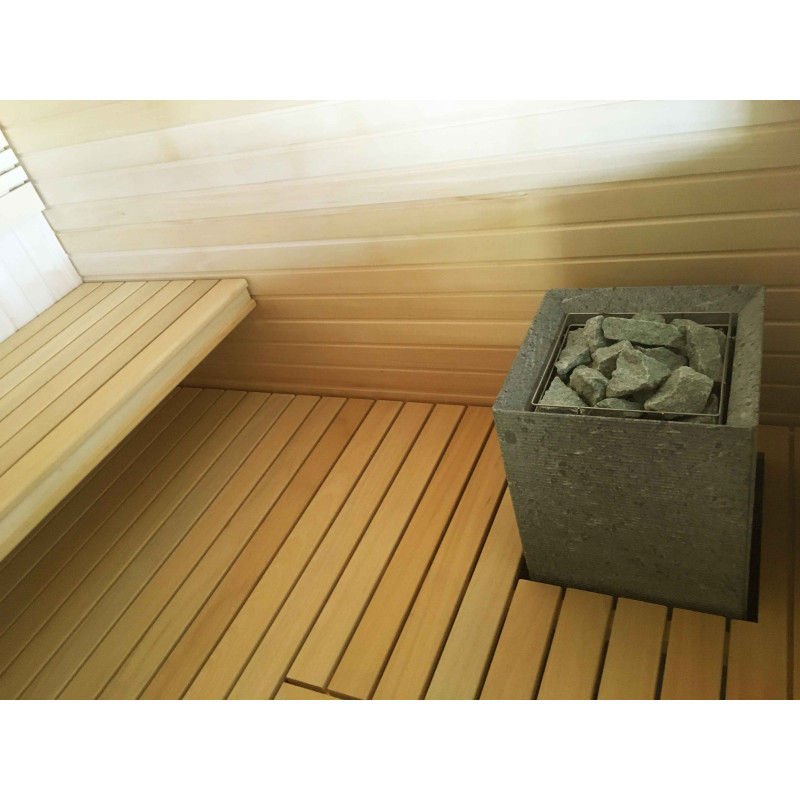 Bastuns väggar och tak är gjorda av lindträ. Linden sidospår ger bastun mer ljus och avger en behaglig trädoft. Högkvalitativ abachiträpanel valdes för bänkarna, ryggstöden och staketet runt värmaren. Detta mjuka och ouppvärmda trä är ett utmärkt val för bänkar, stöder där träet vidrör huden utan att bränna det. Detta garanterar komfort och en härlig vila i bastun. Bänkar, stöd och väggar är lackade, helt förberedda för långvarig användning.
