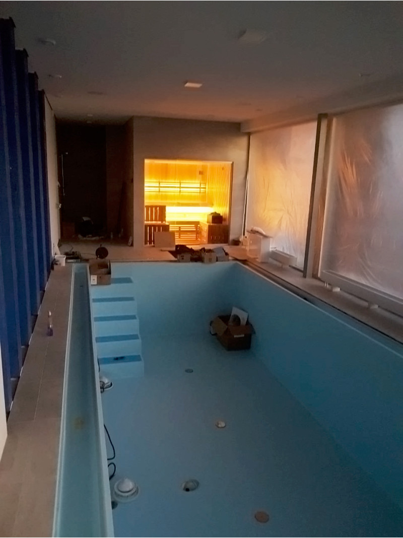 Montering av glasmonter - tonat 8 mm härdat glas i aluminiumram. Tack vare glasmontern öppnar sig utsikten över poolområdet, det lilla basturummet förstoras och bastun får mer ljus.