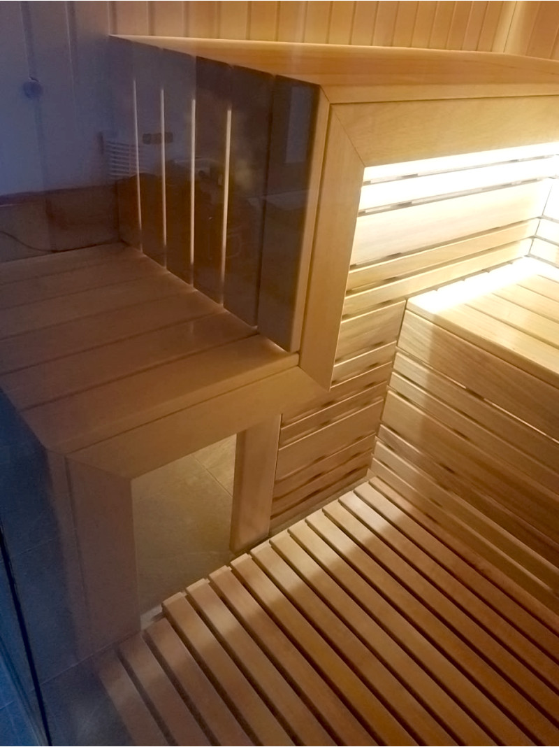 Belysning - fukt- och temperaturbeständig vit LED-belysning installerad i ryggstöden och under den övre bänken, vilket framhäver sidospårens utseende och struktur.