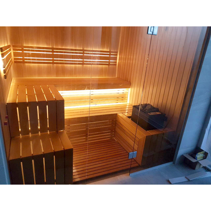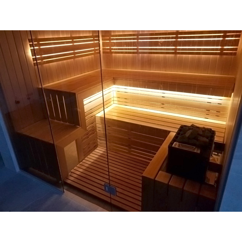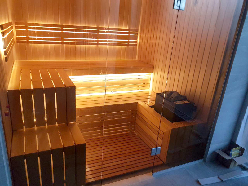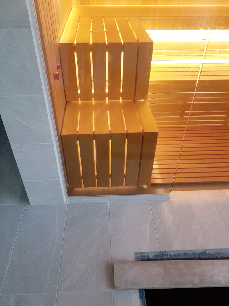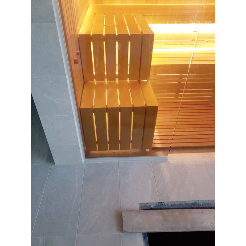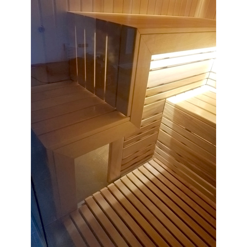 Abachi-trä för bänkar och ryggstöd är ett utmärkt val, eftersom detta kvalitetsträ inte överhettas och det är omöjligt att bränna dig när du sitter på bänkar gjorda av sådant trä. Cederträ ger också ett modernt utseende till bastuns inre.