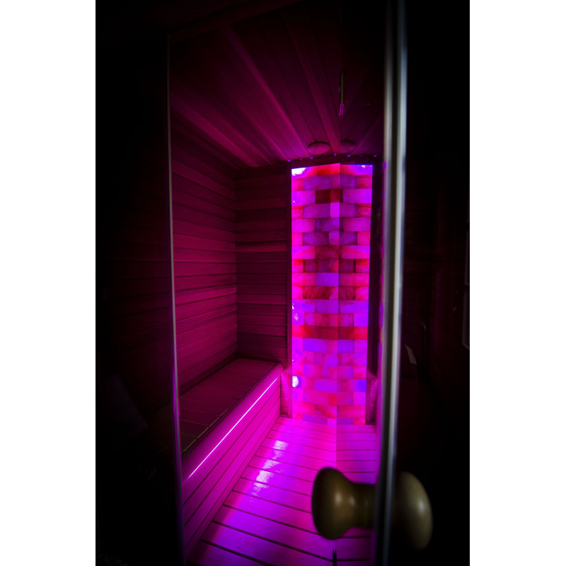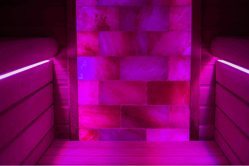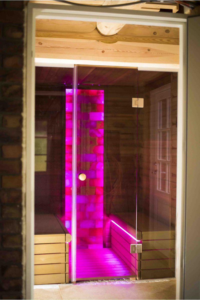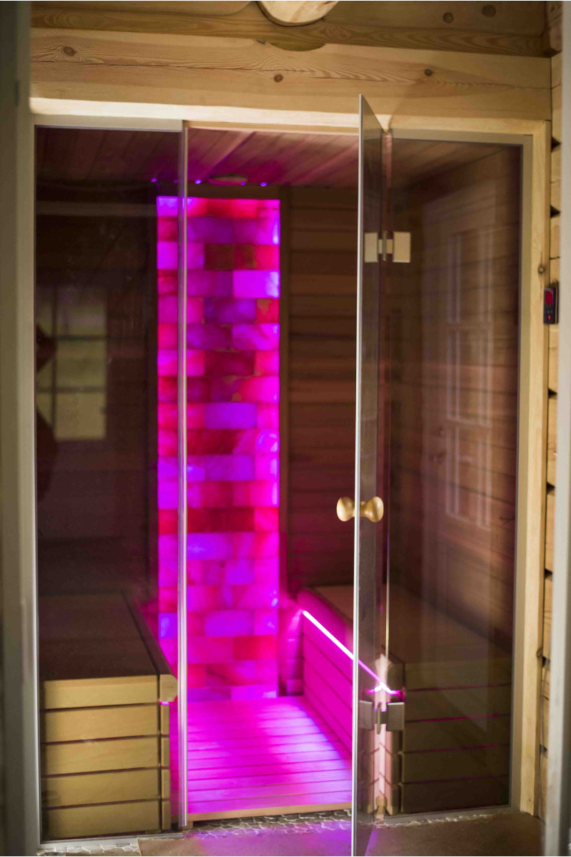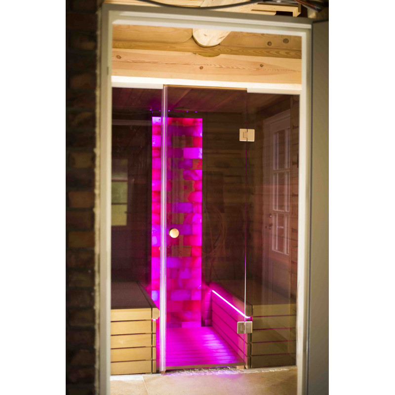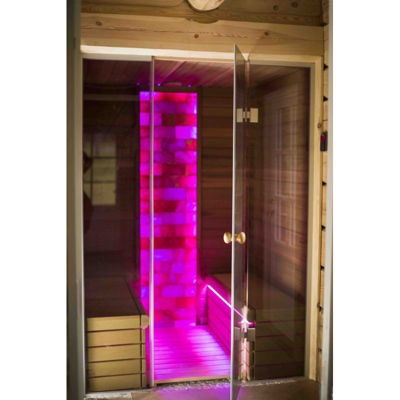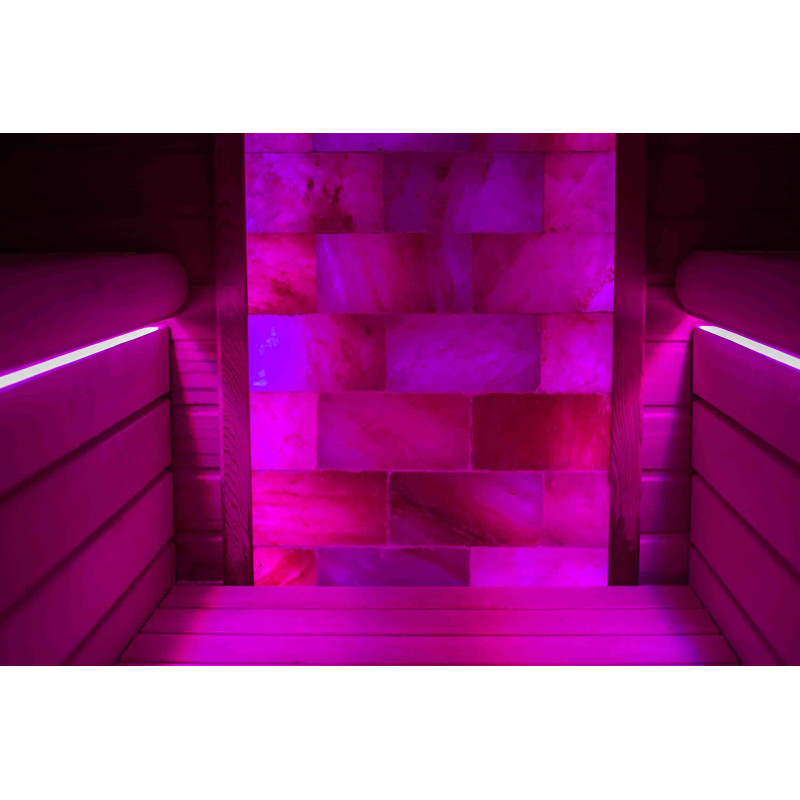 Himalayas salttegelvägg som valts för dekoration av bastun med den inbyggda färgade RGB-belysningen, styrd av en trådlös färgväxlare, skapar en mysig miljö och förstärker bastuns effekt ytterligare.