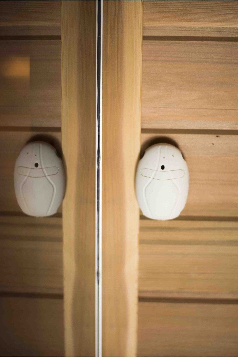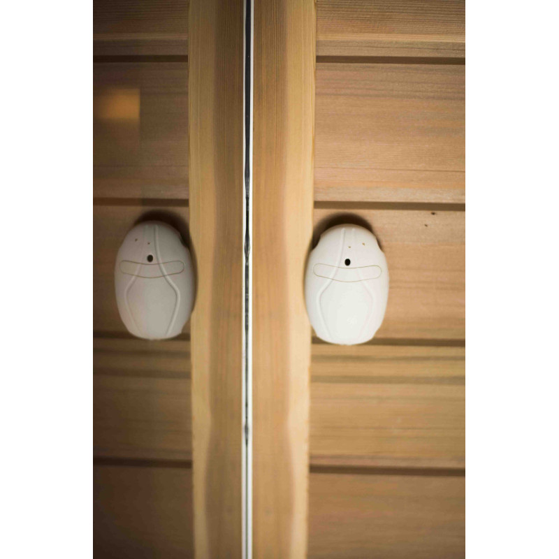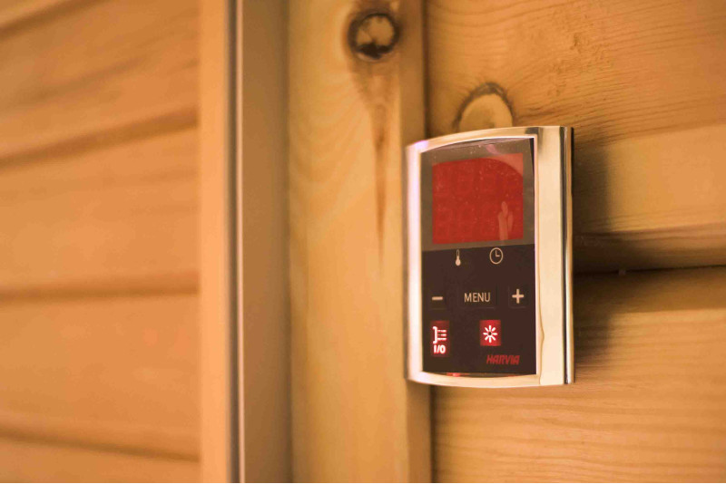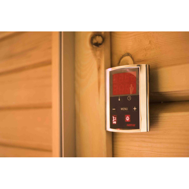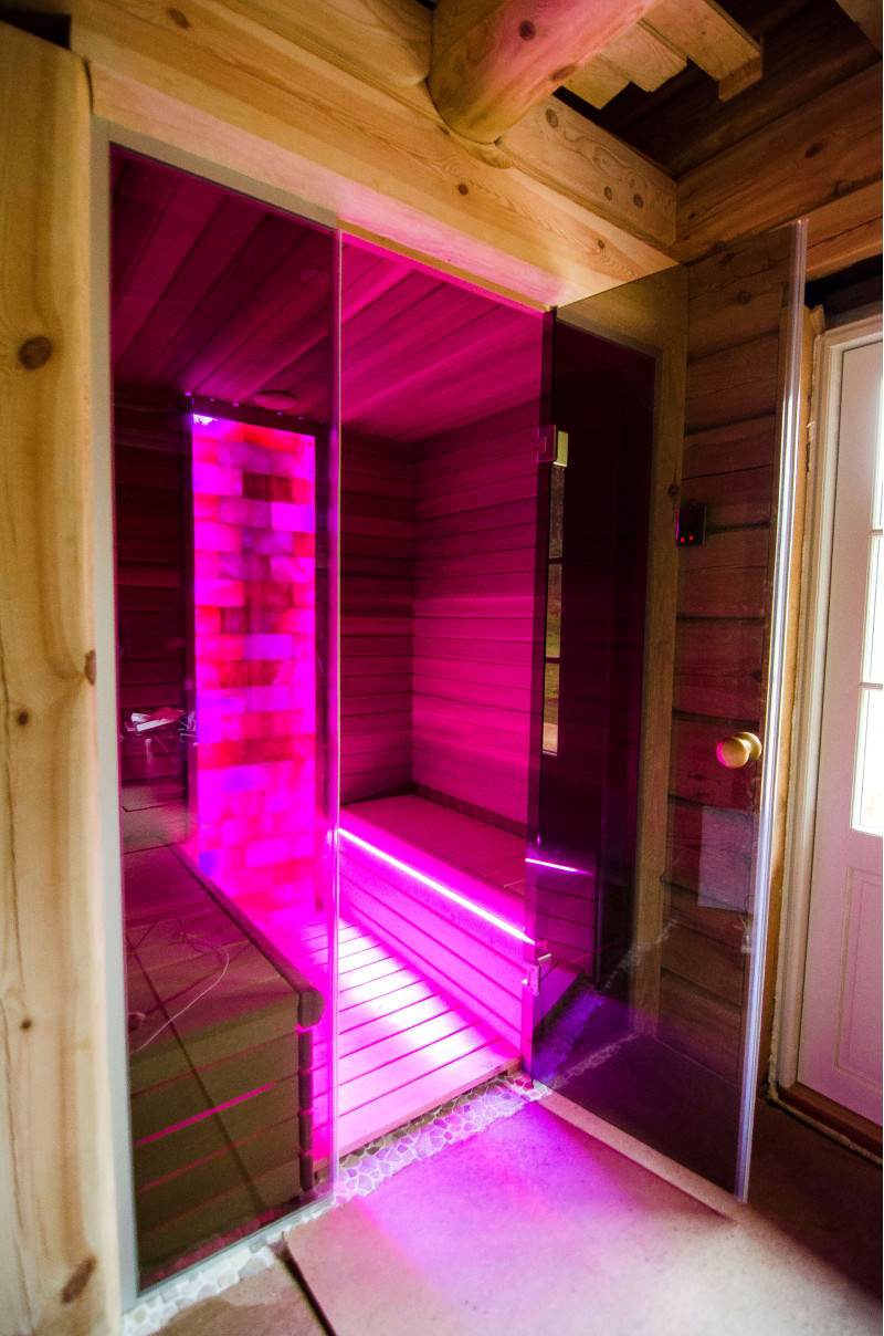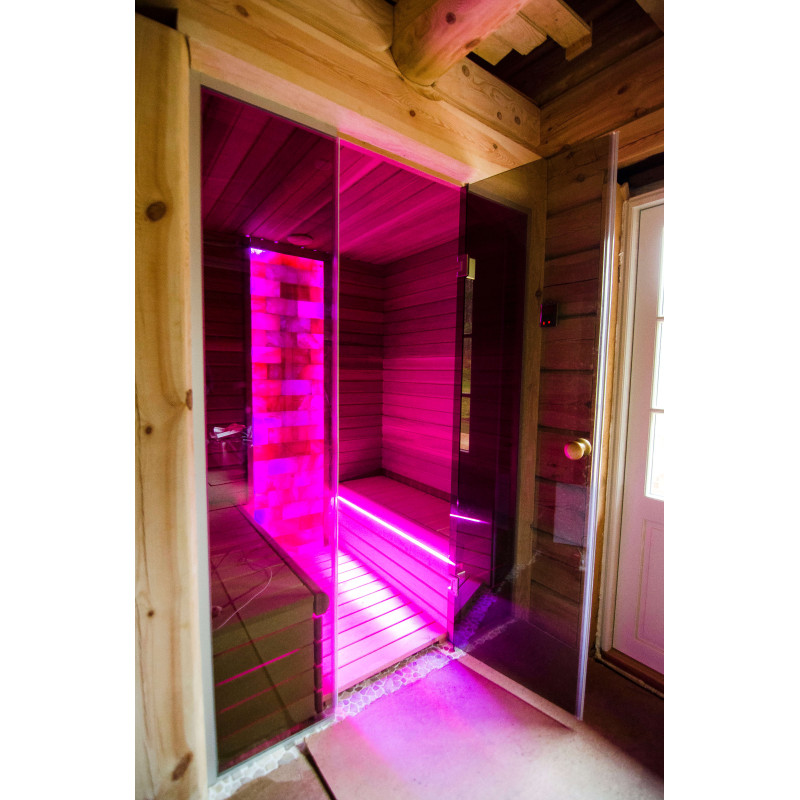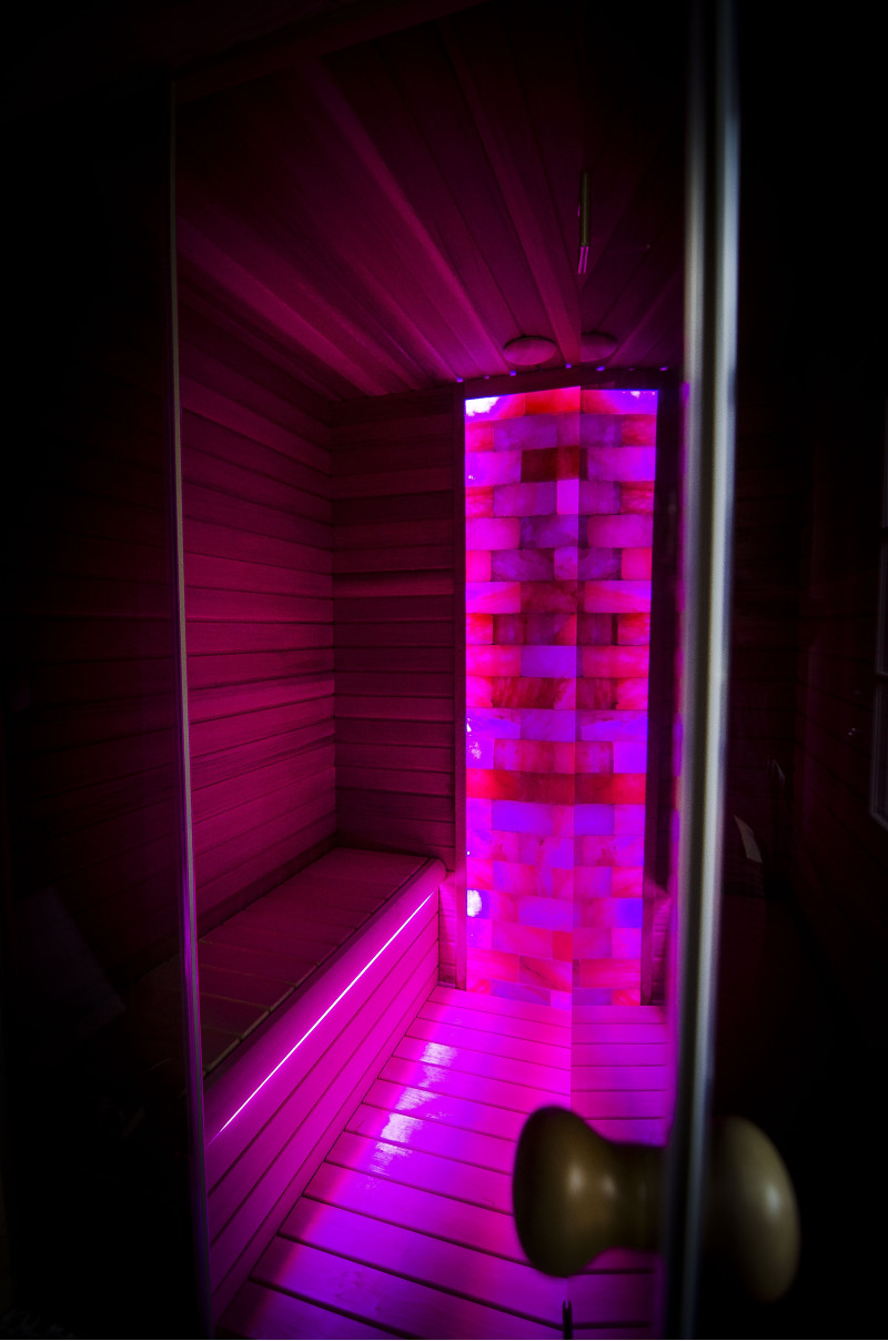 Himalayas salttegelvägg som valts för dekoration av bastun med den inbyggda färgade RGB-belysningen, styrd av en trådlös färgväxlare, skapar en mysig miljö och förstärker bastuns effekt ytterligare.