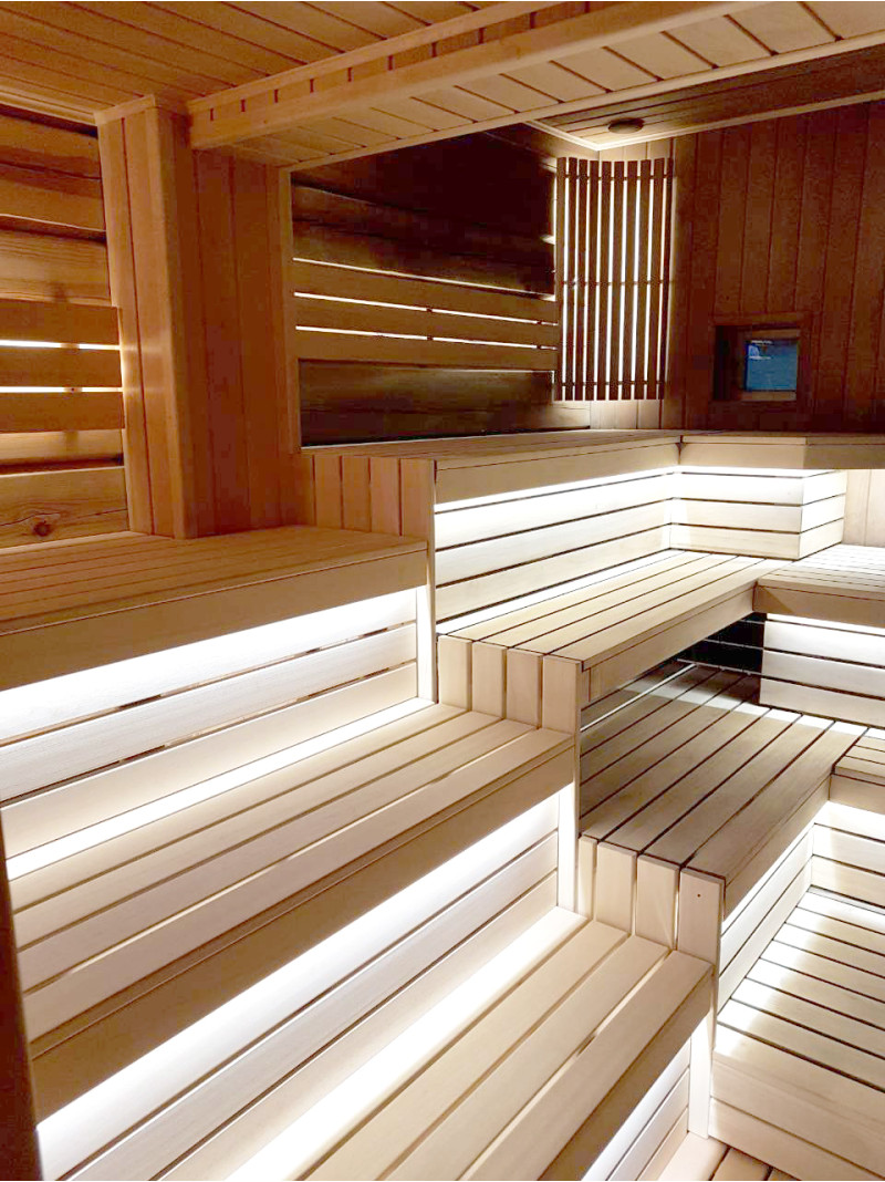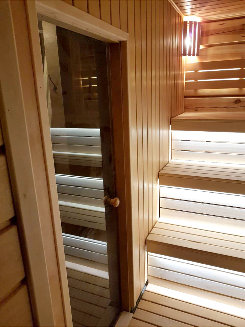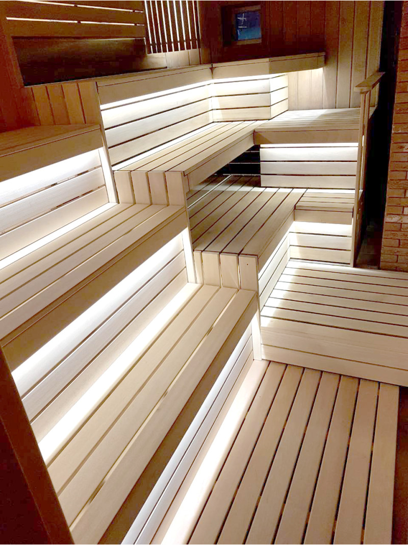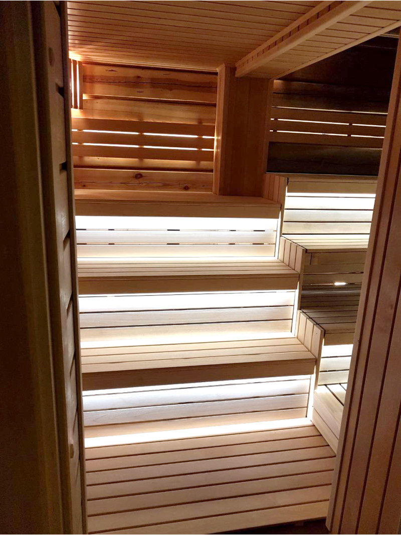 Varmvit LED-belysning är installerad under solstolarna, vilket ger bastun en känsla av rymd och mysighet. Till väggbelysningen valdes en armatur med matchande träkåpa.