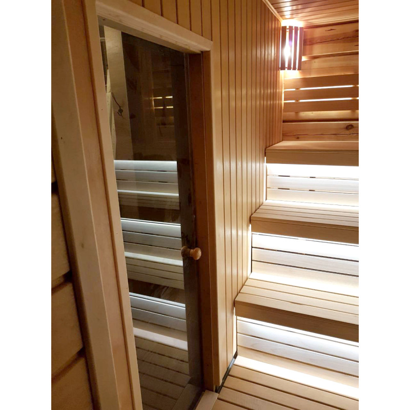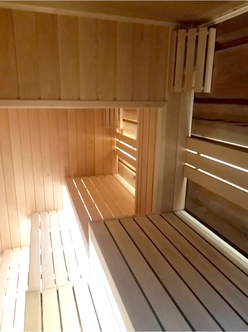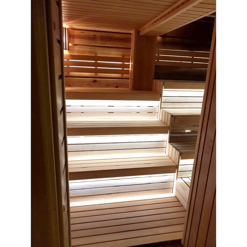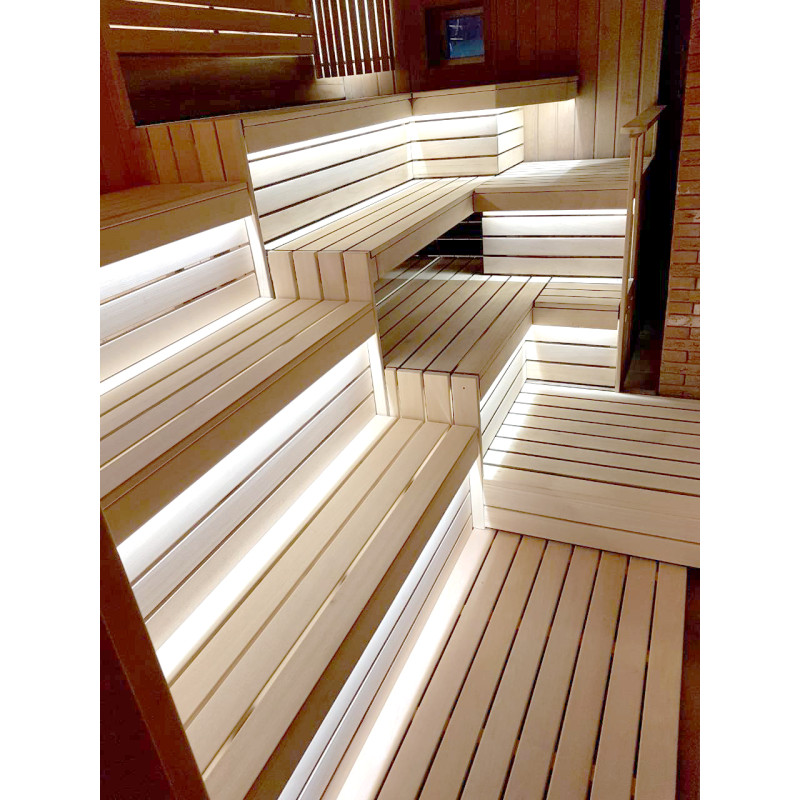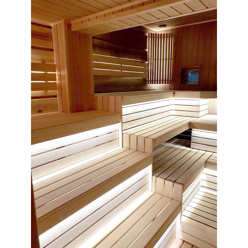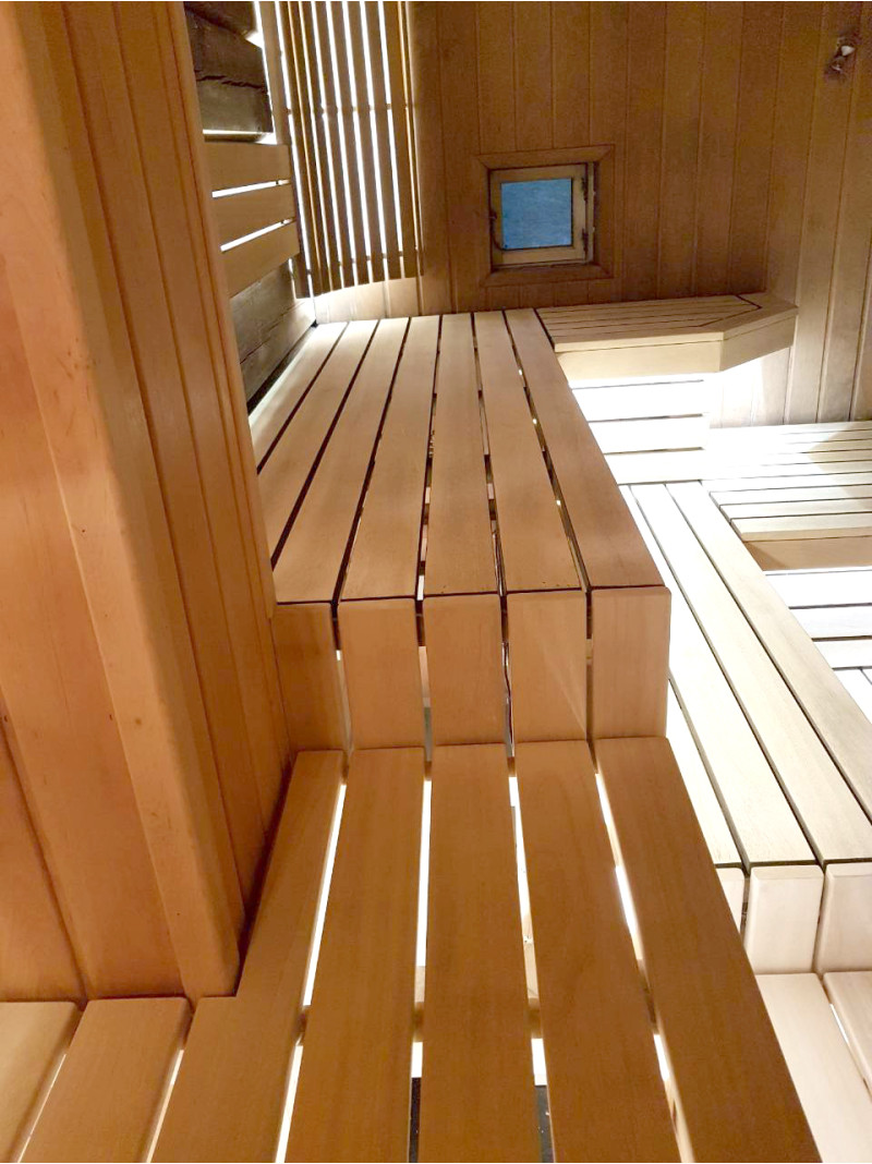 Varmvit LED-belysning är installerad under solstolarna, vilket ger bastun en känsla av rymd och mysighet. Till väggbelysningen valdes en armatur med matchande träkåpa.