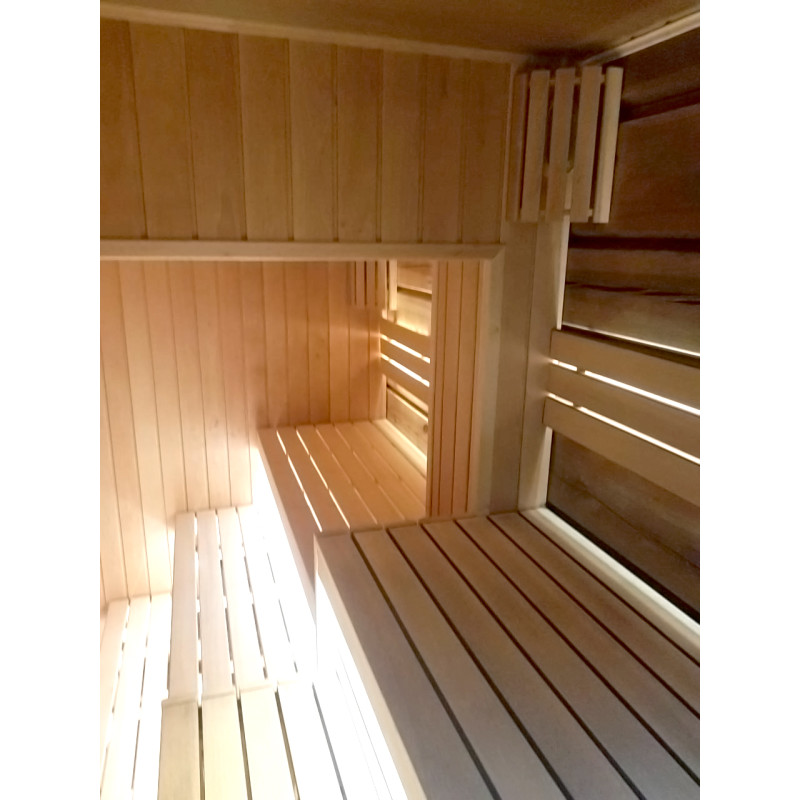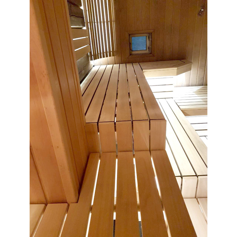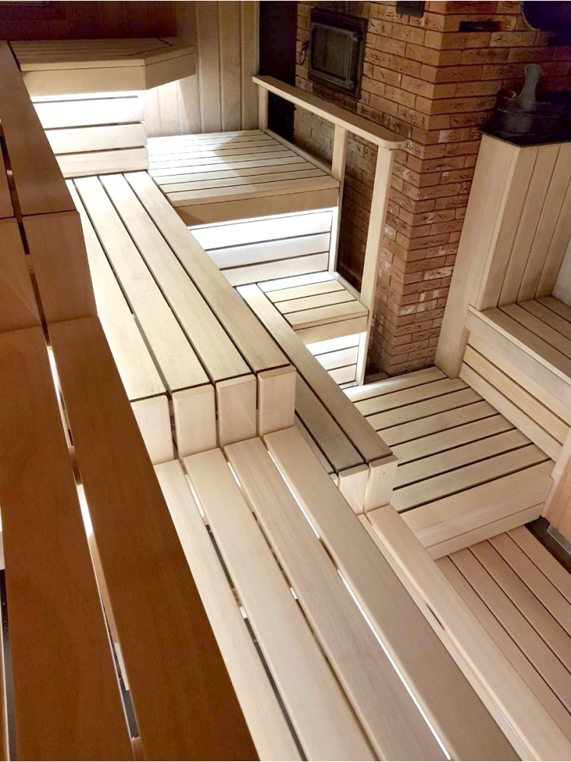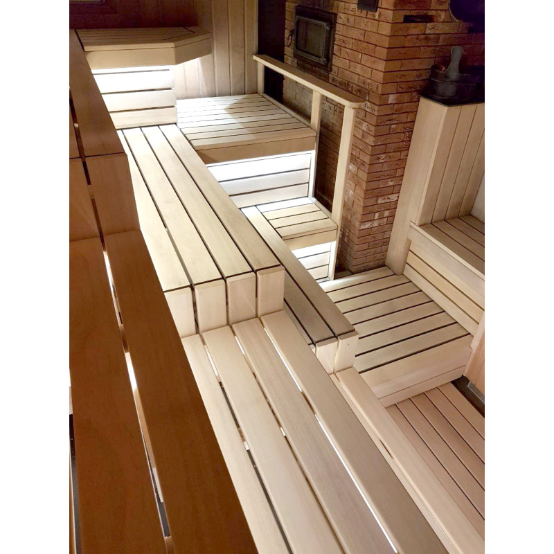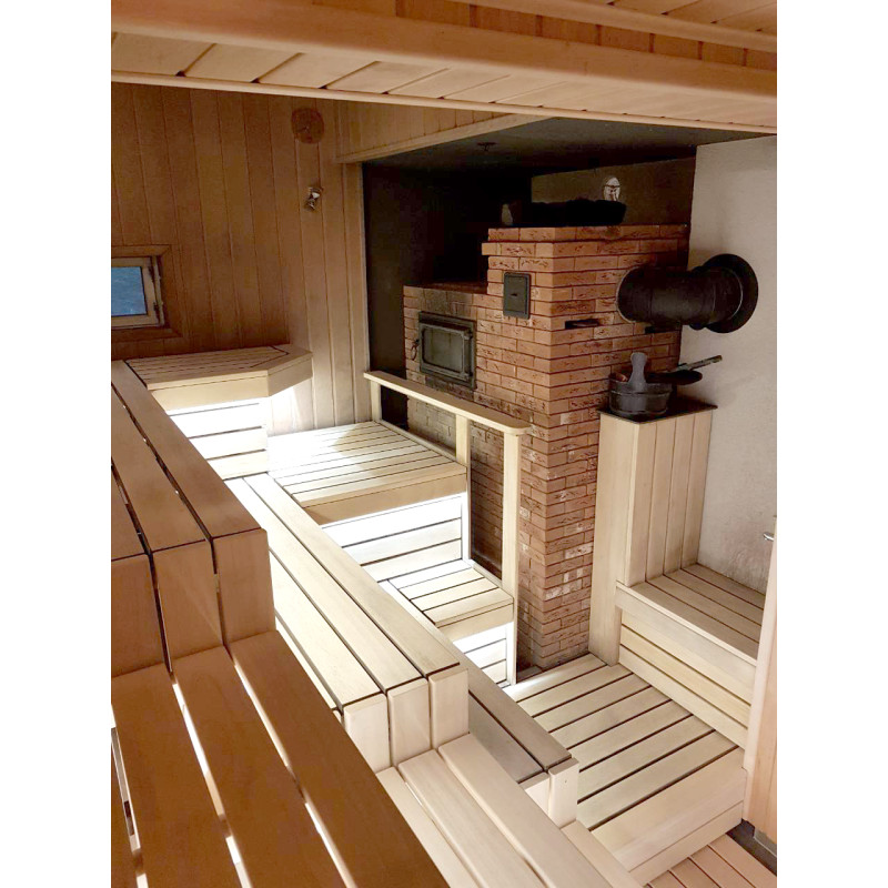 Träet är impregnerat, skyddat från hög värme och redo för långtidsanvändning. Bänkarna och ryggstöden är smorda med en speciell olja för bastuved.
