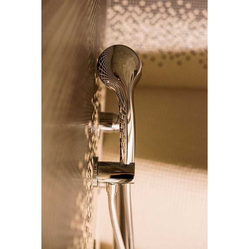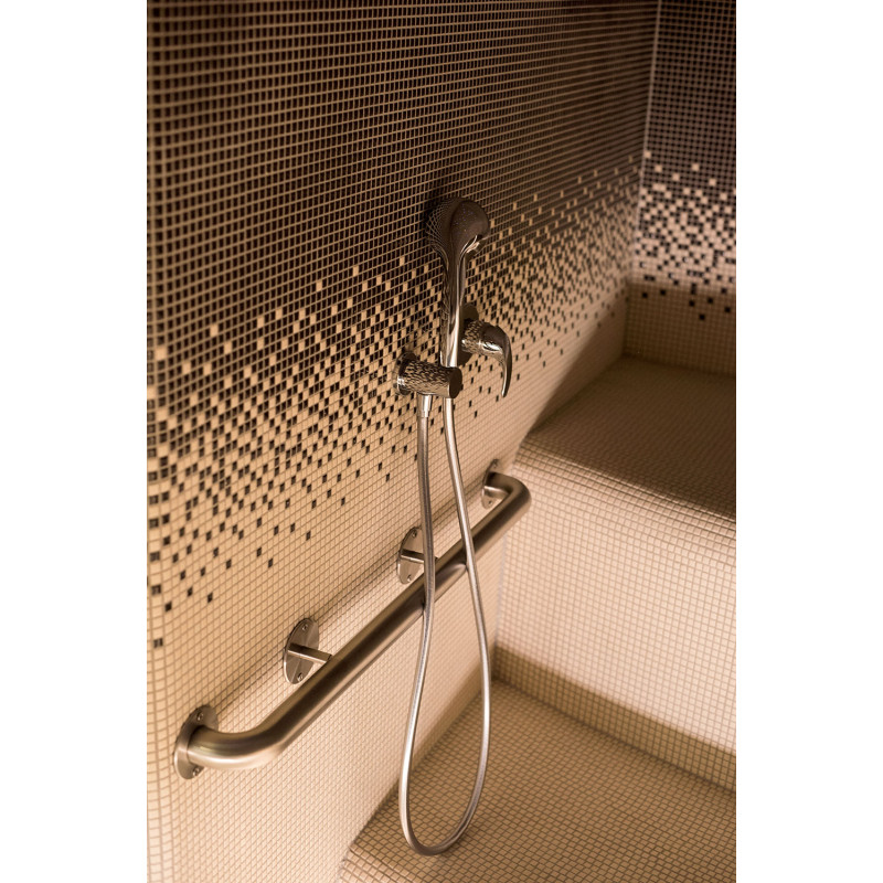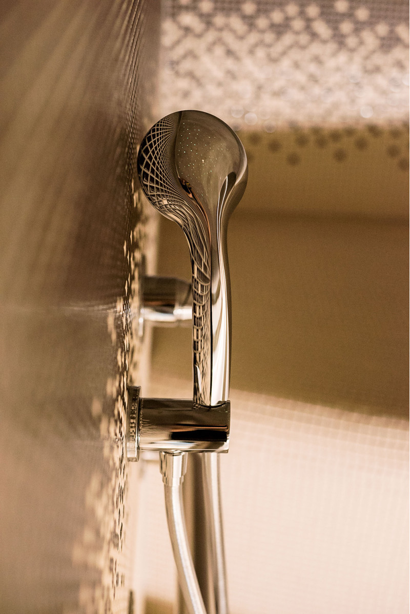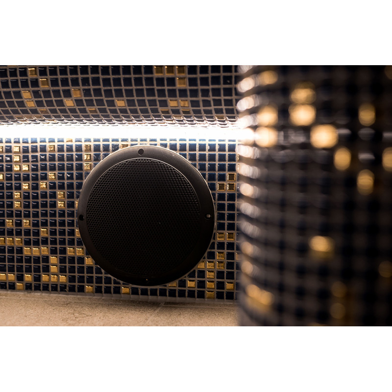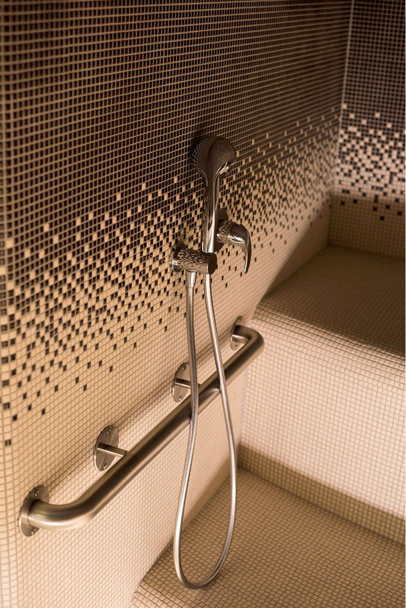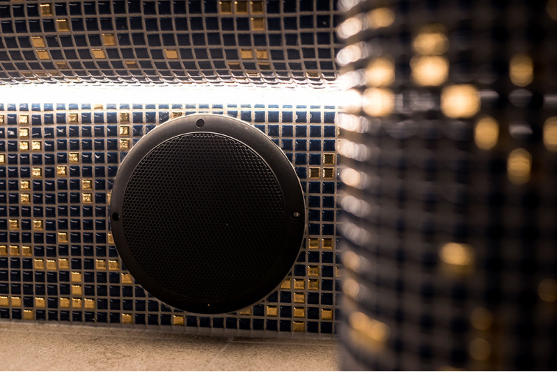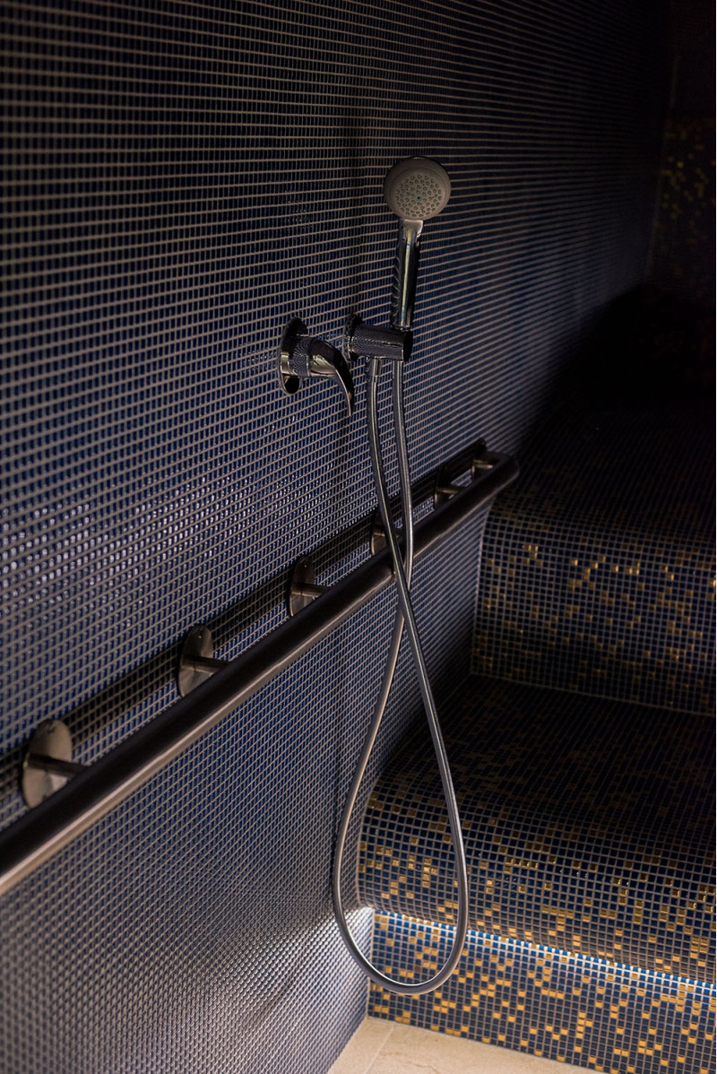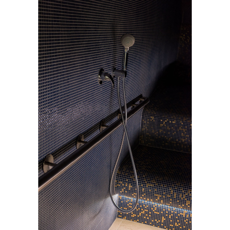 - Luftfuktighet och temperaturbeständiga armaturer installeras under sängarna. Ett matchande svart alverträsskydd valdes i hörnet för den väggmonterade armaturen.