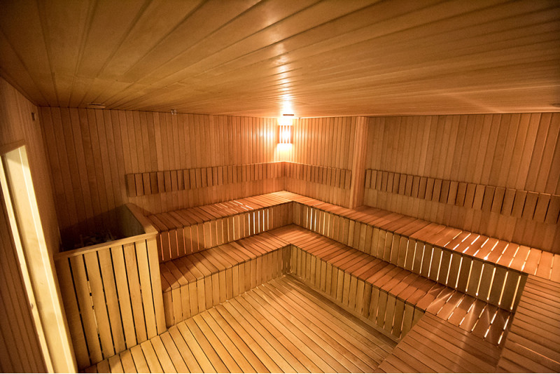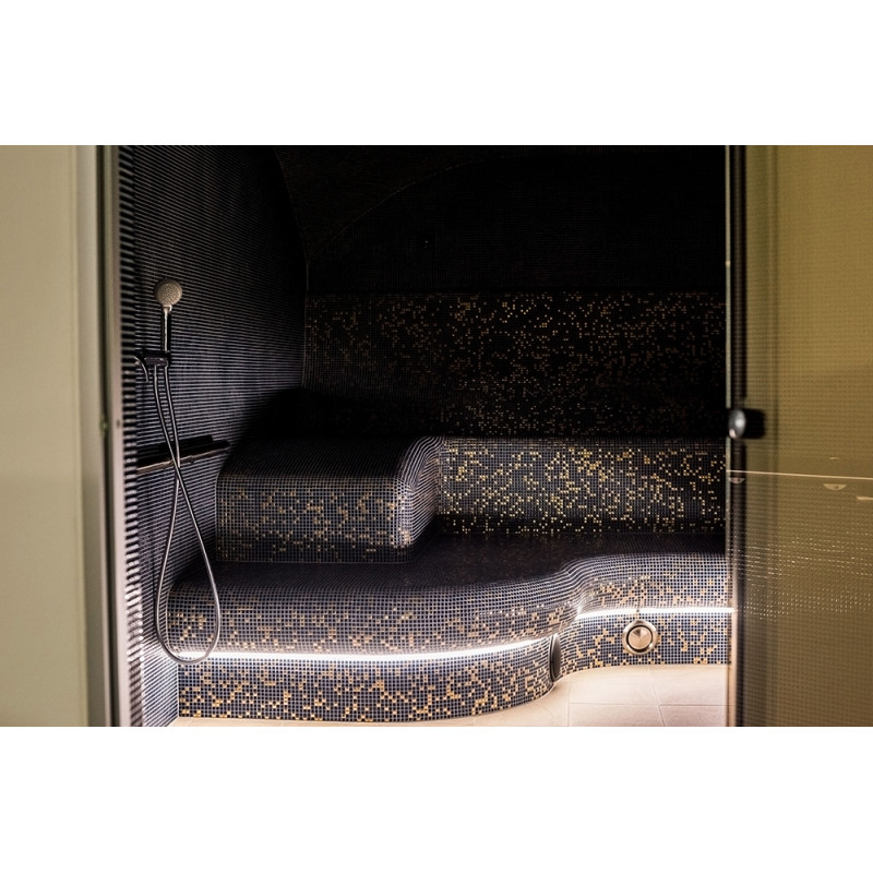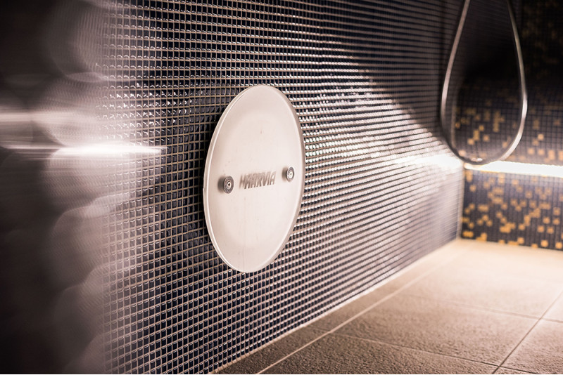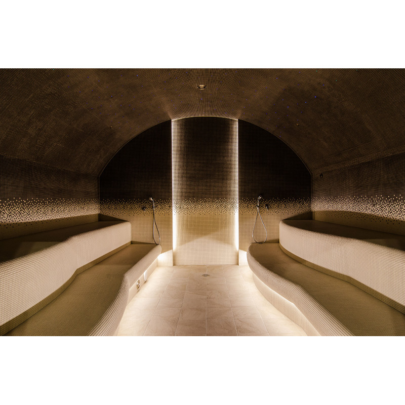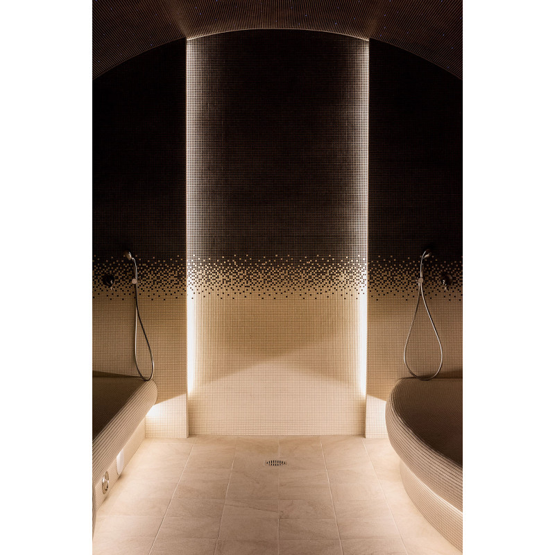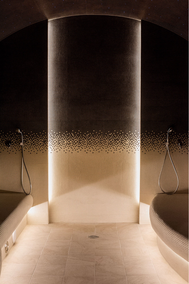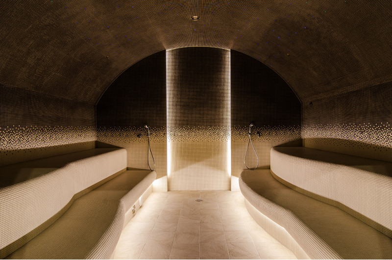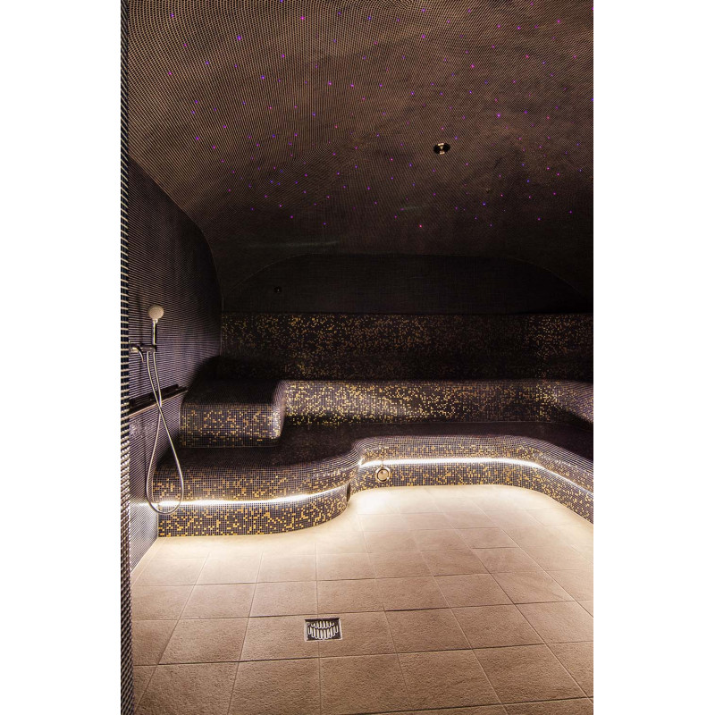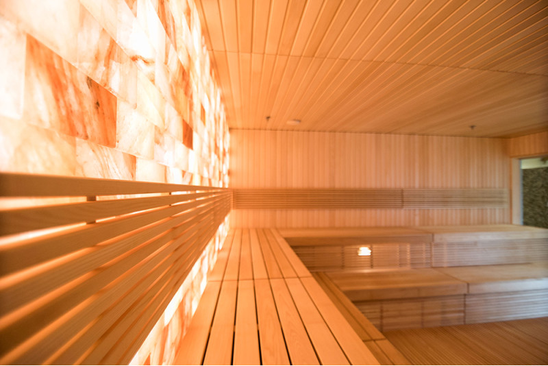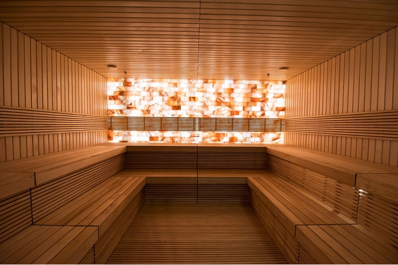 - Luftfuktighet och temperaturbeständiga armaturer installeras under sängarna. LED -belysning är installerad bakom Himalaya saltvägg.