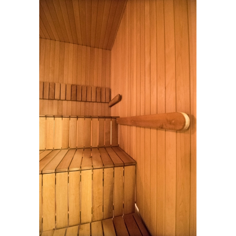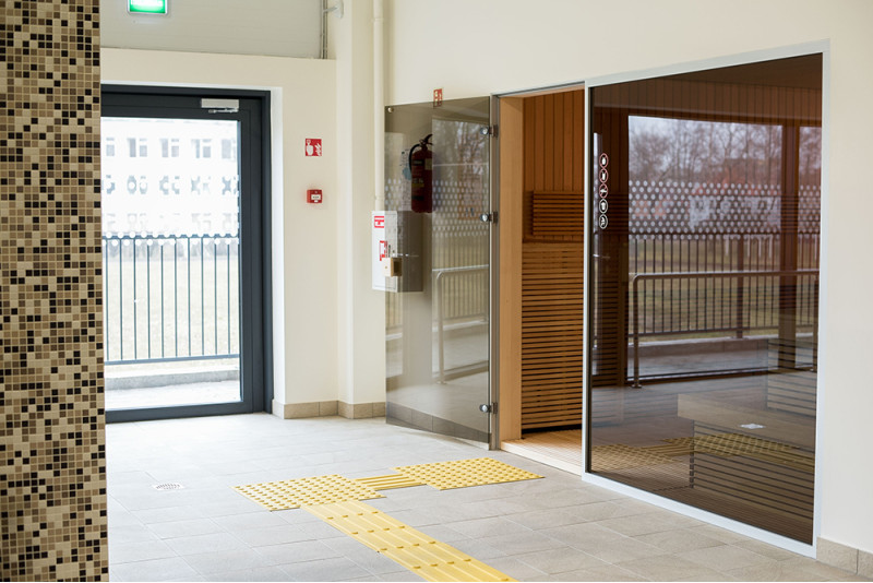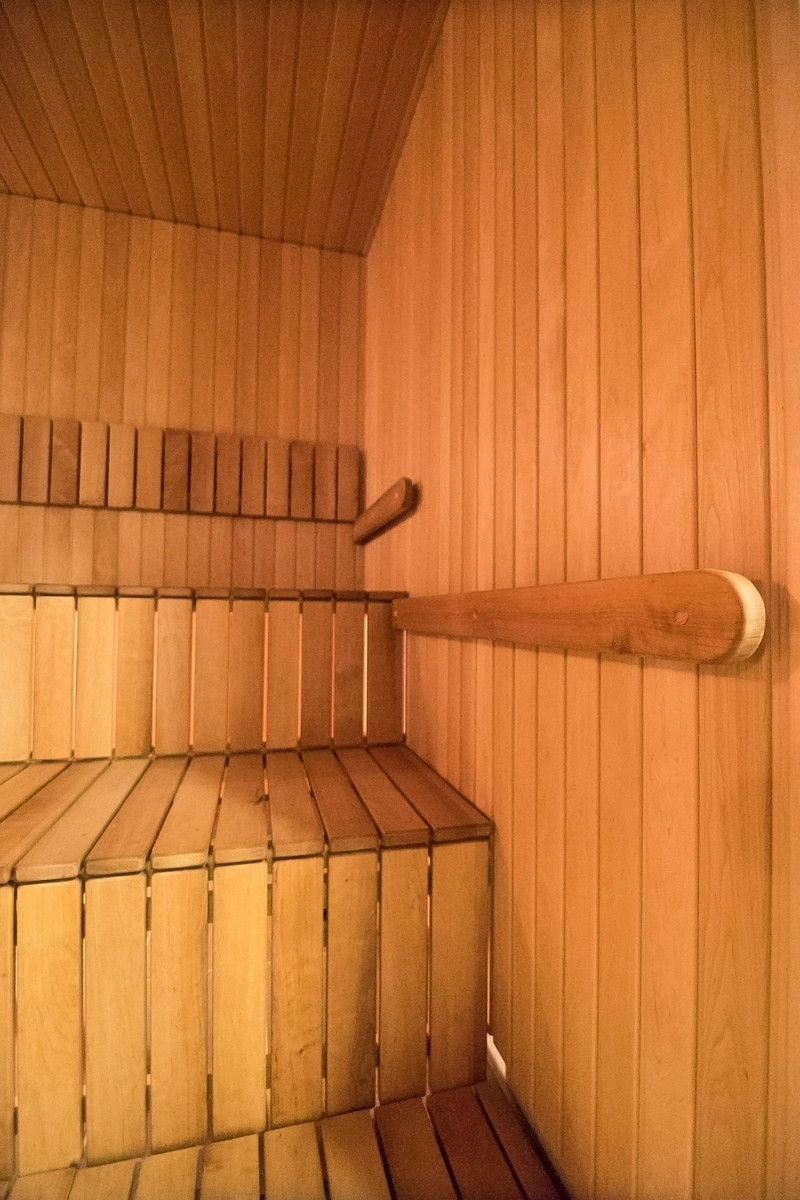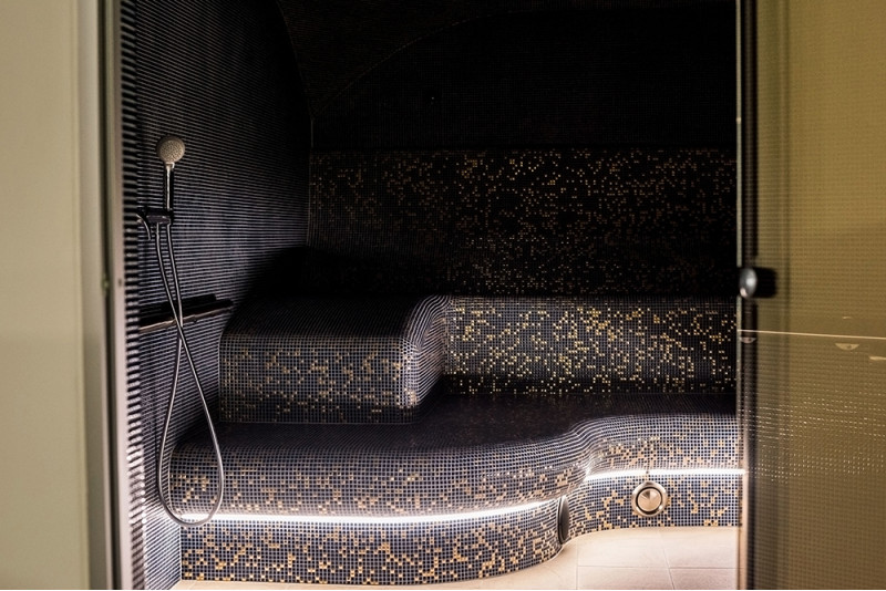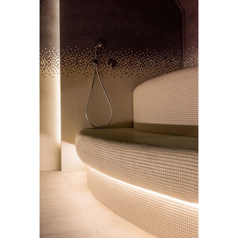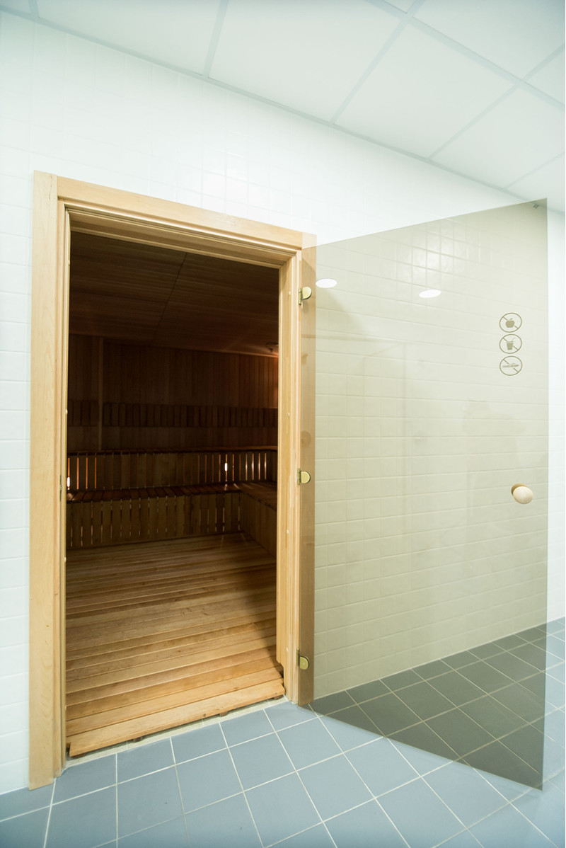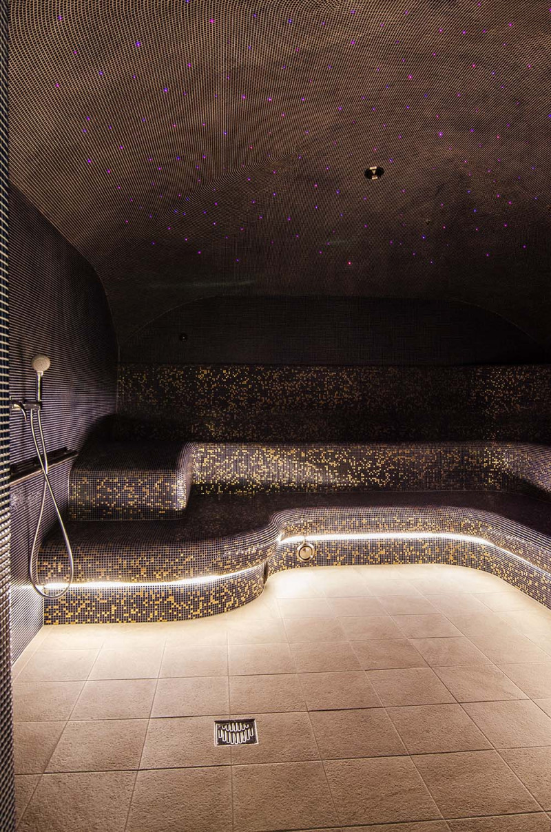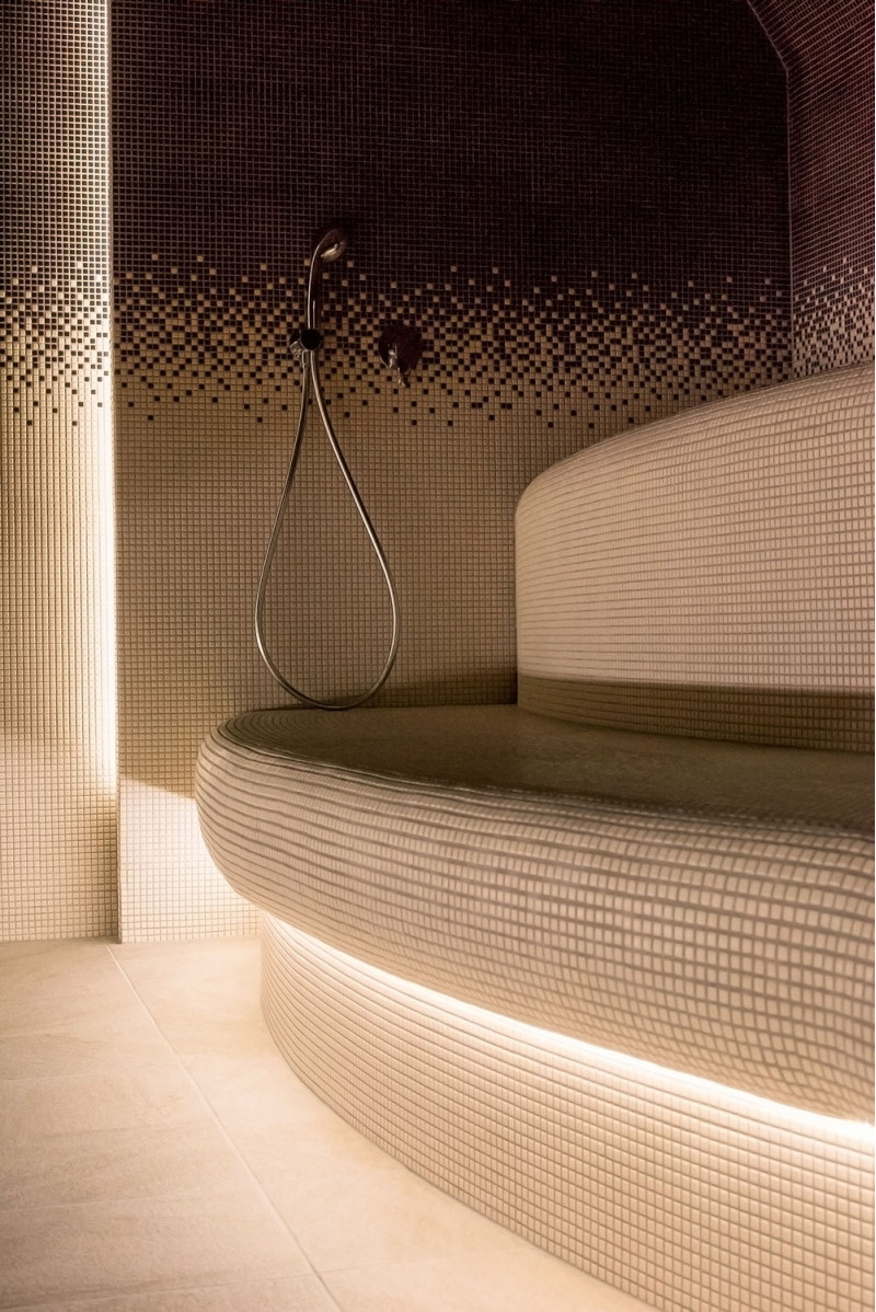 - Luftfuktighet och temperaturbeständiga armaturer installeras under sängarna. LED -belysning är installerad bakom Himalaya saltvägg.