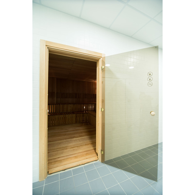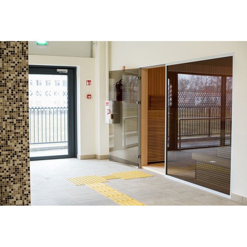 - Glasdörrar - 8 mm härdat, tonat glas, aluminiumram.