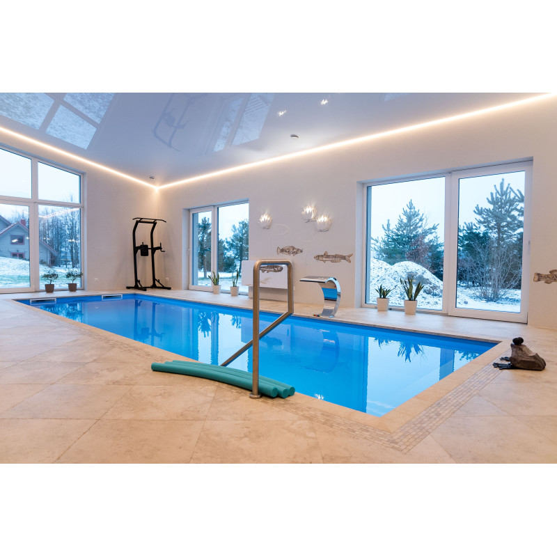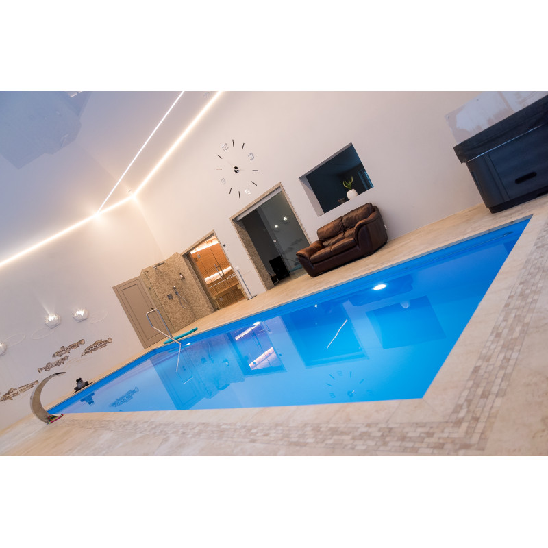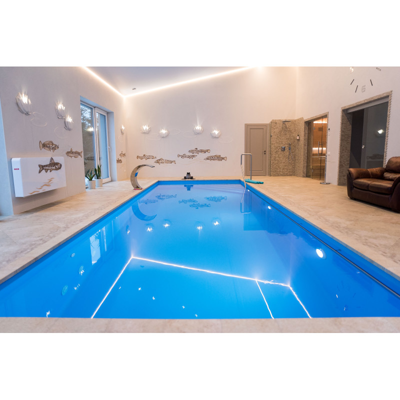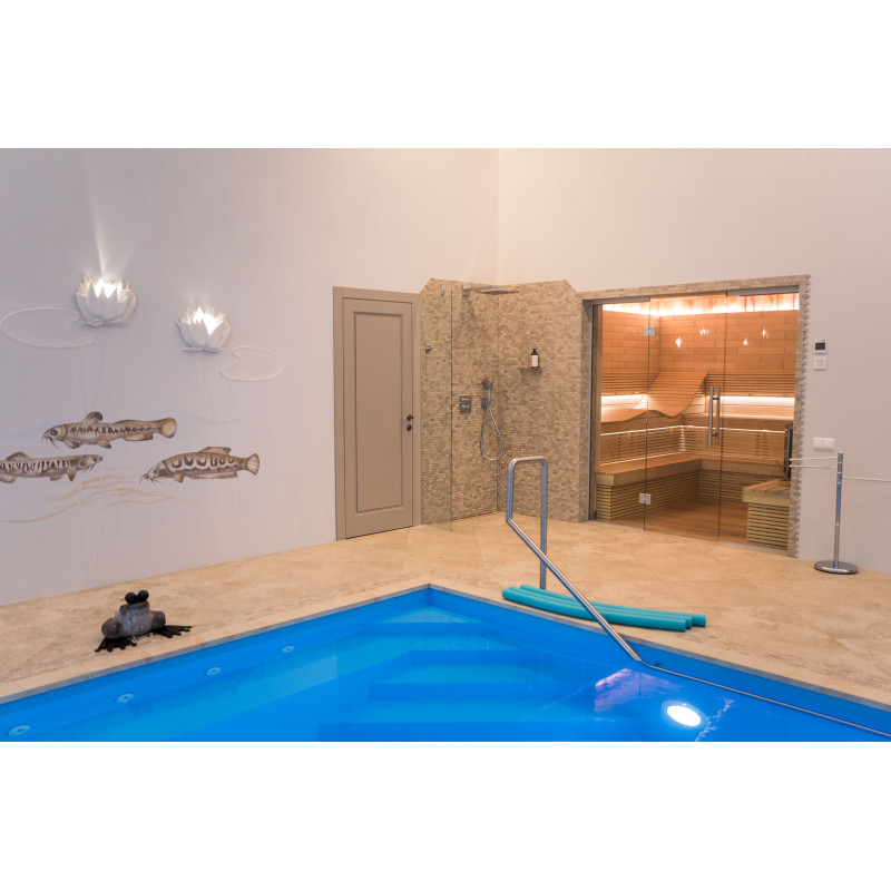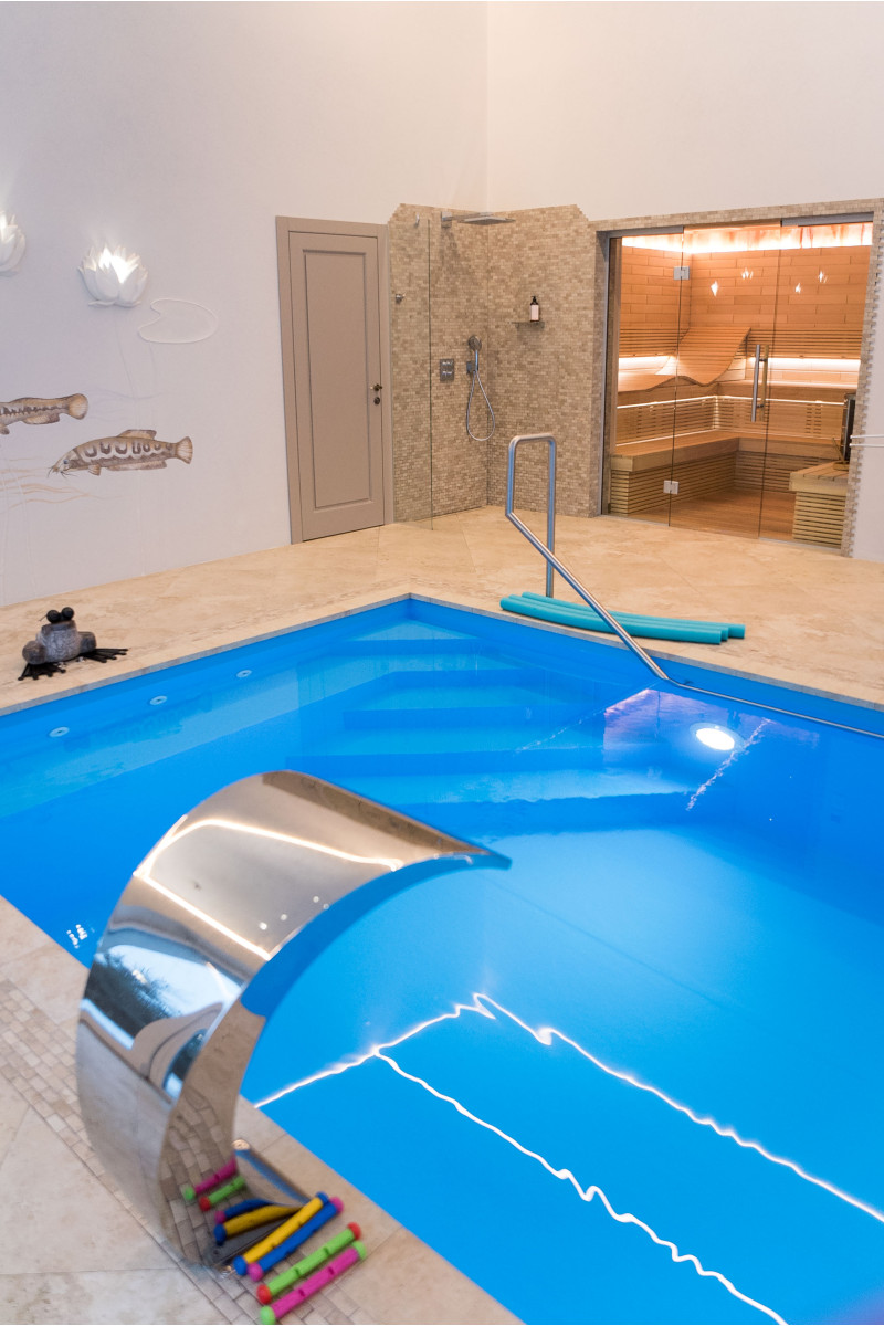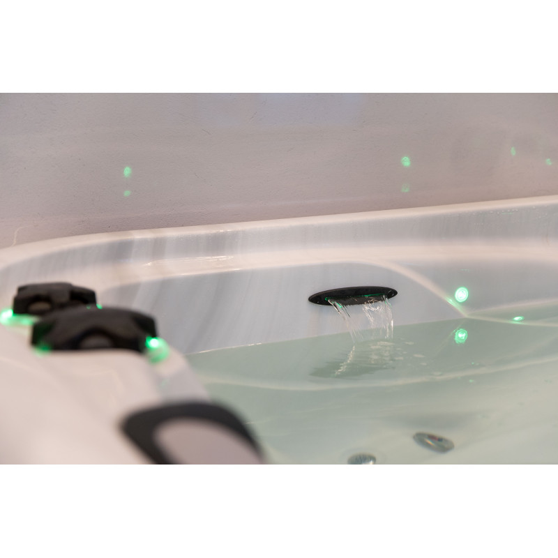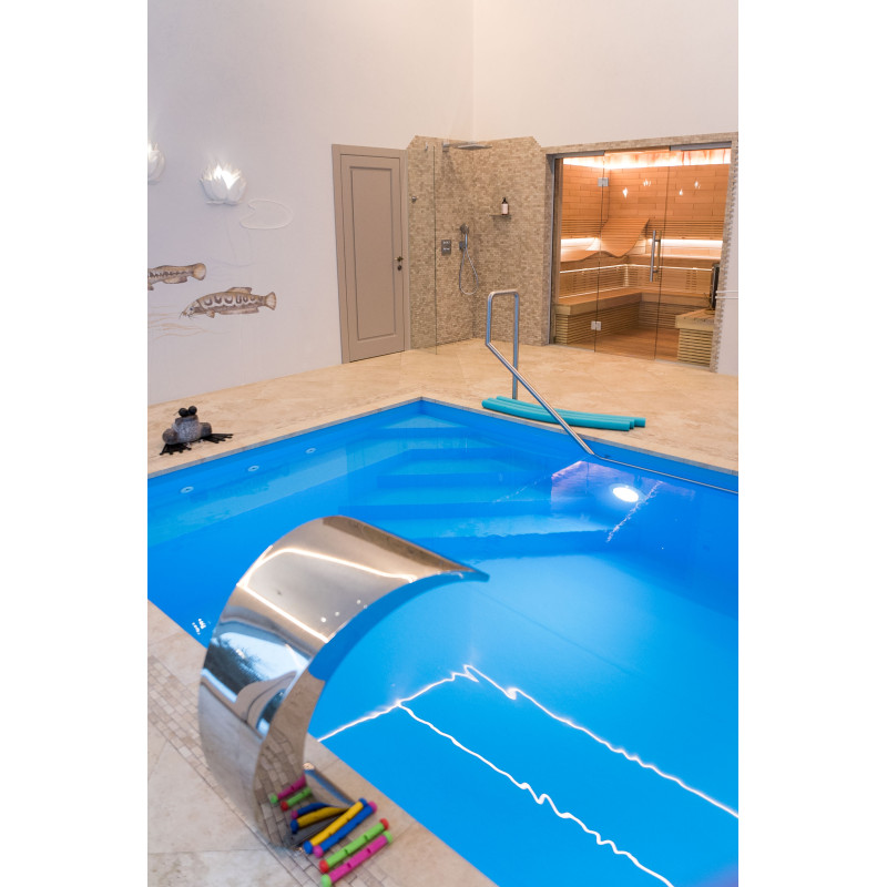 Utrustad med simström, vattenkaskad, massagebänk, ledstång, trappor och undervattensbelysning.