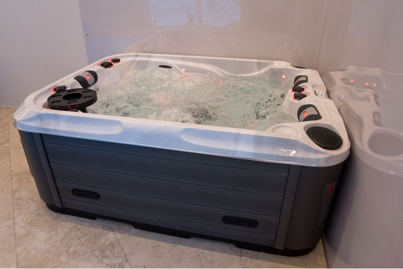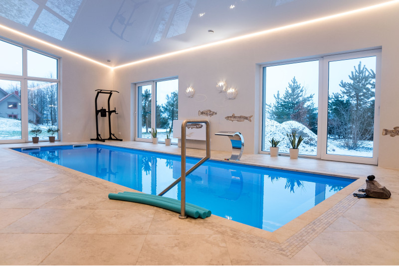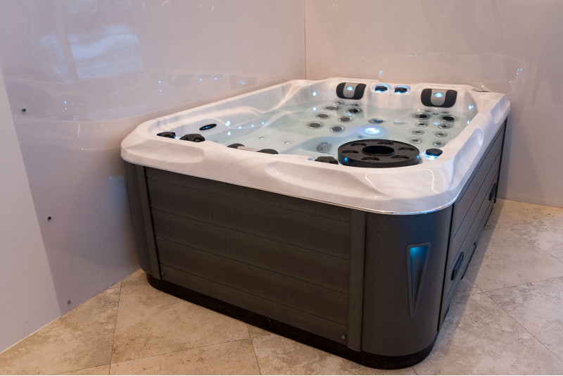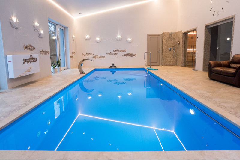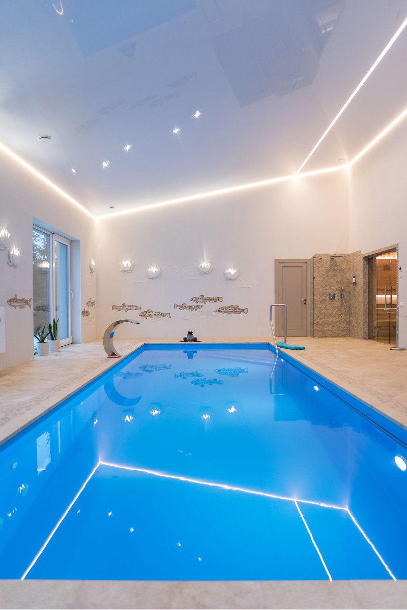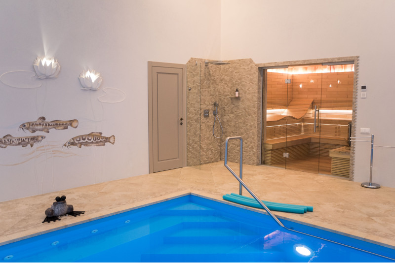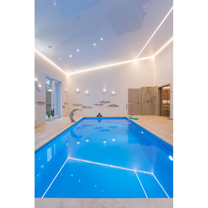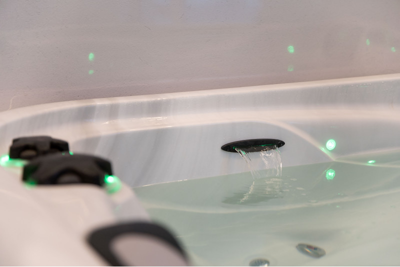 Utrustad med simström, vattenkaskad, massagebänk, ledstång, trappor och undervattensbelysning.