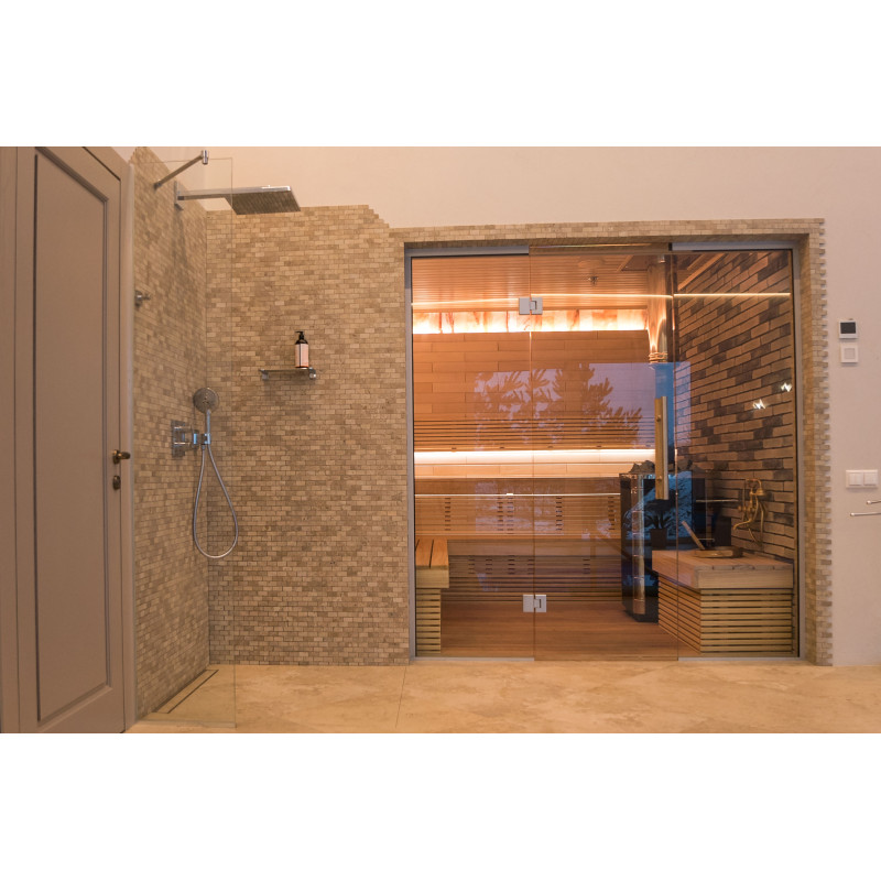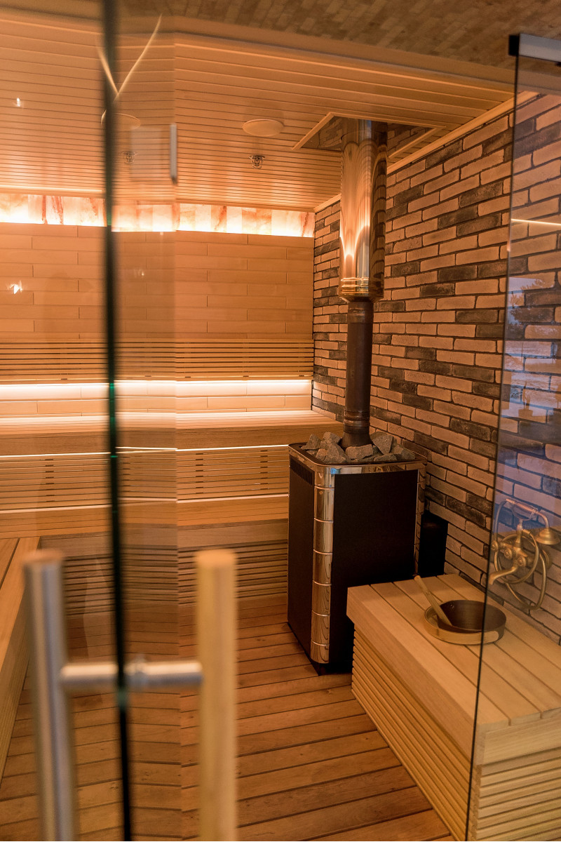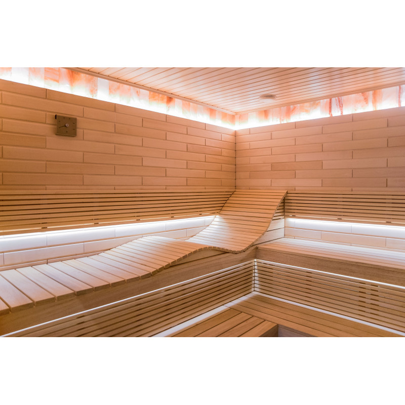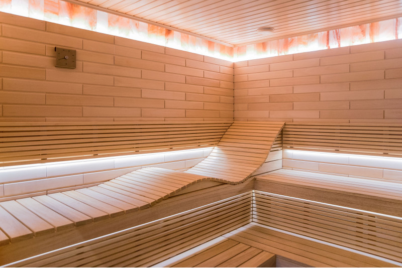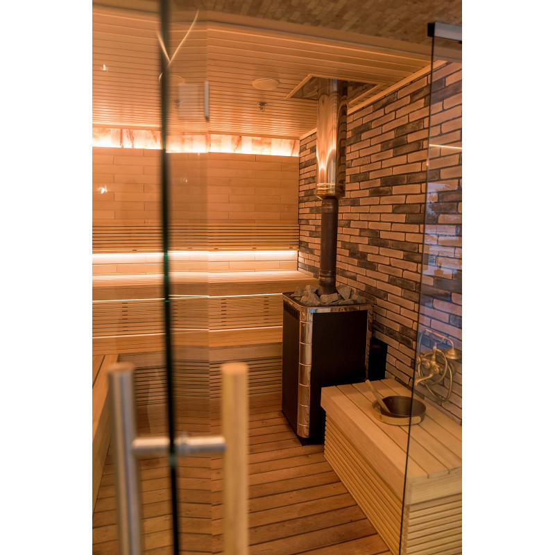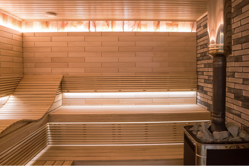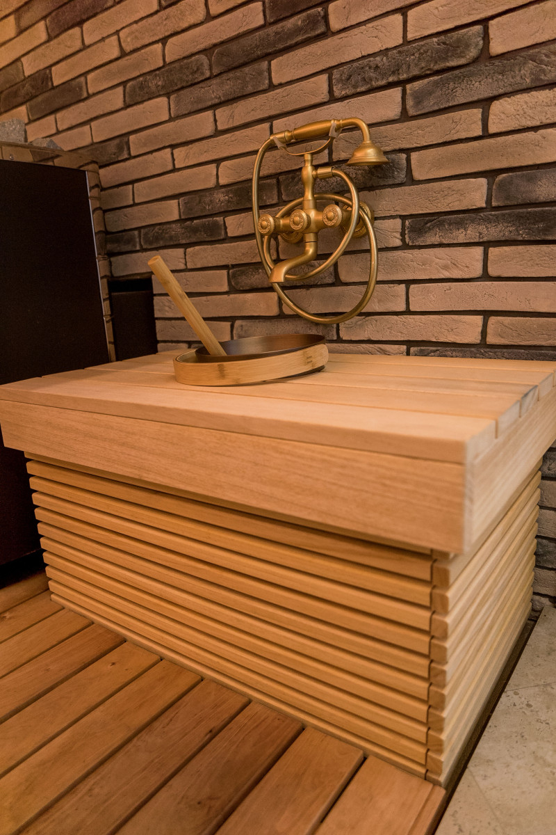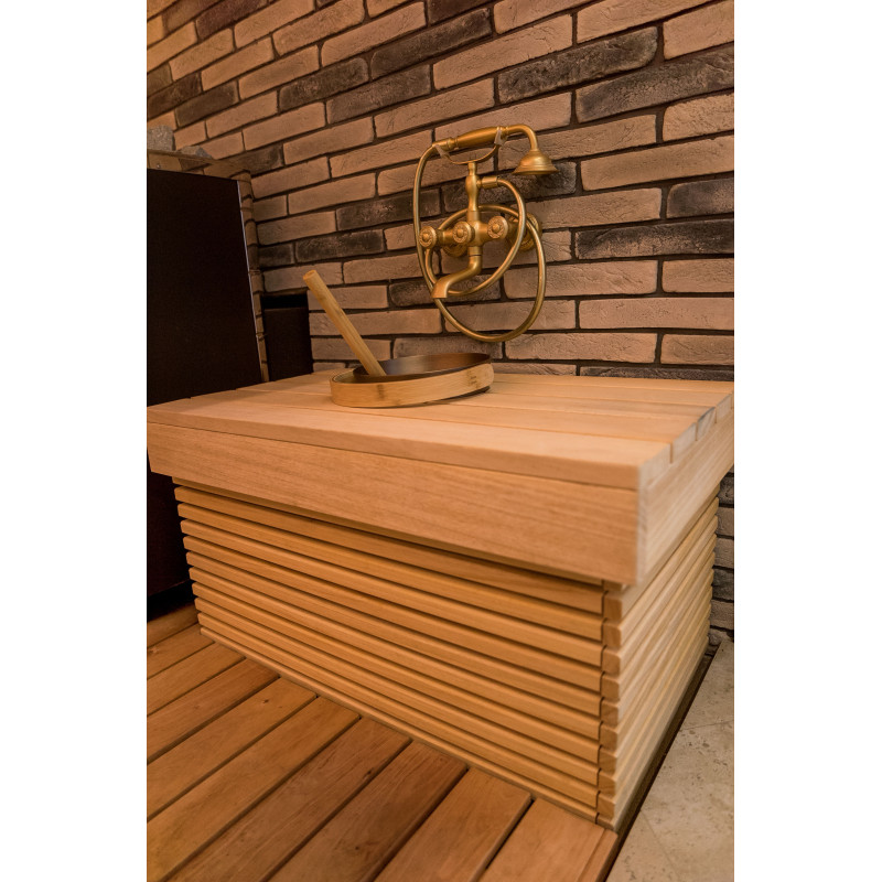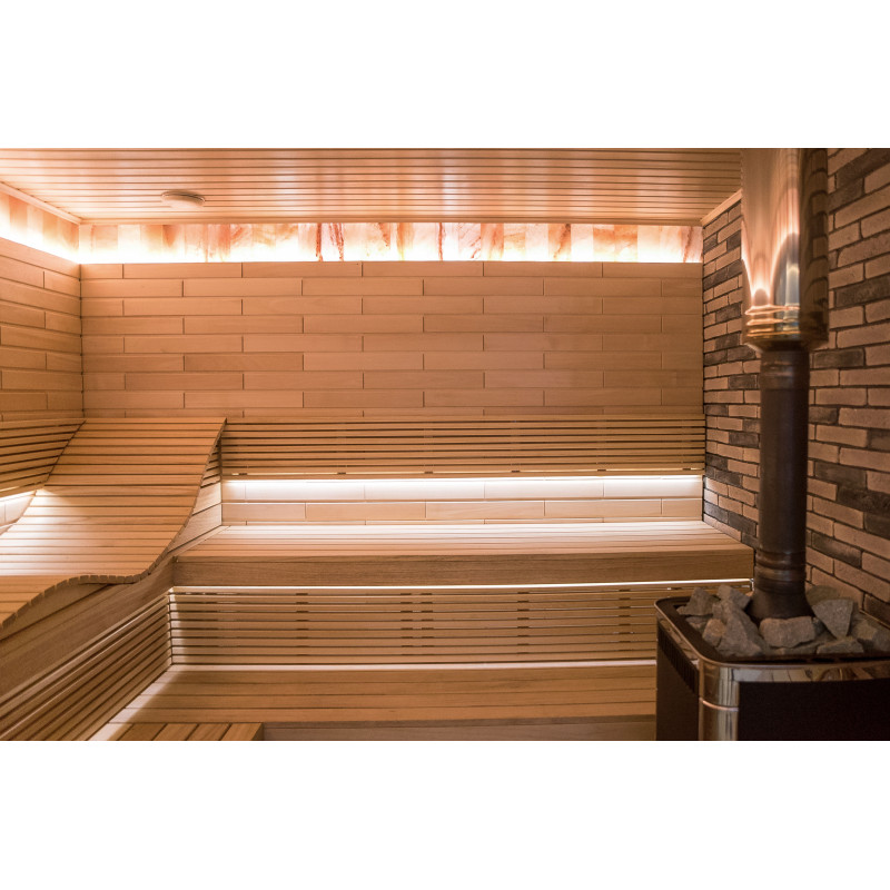 Inredning av bastun - lindträ, sängbrädor, golvgaller - abachiträ. Sängar, stöd och väggar är impregnerade med olja och lackade.