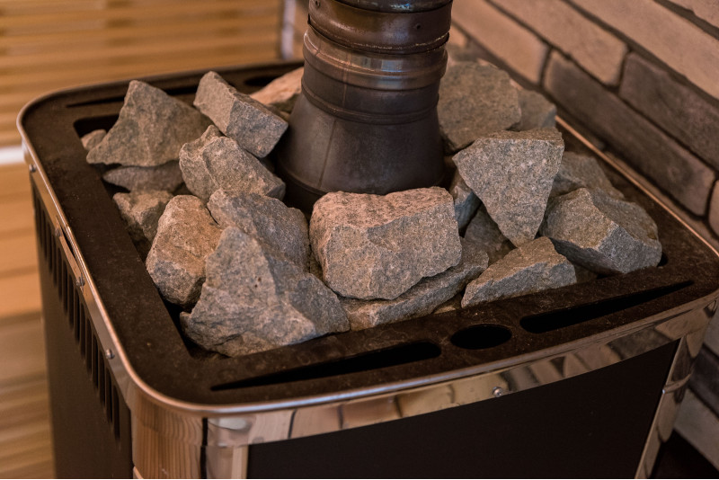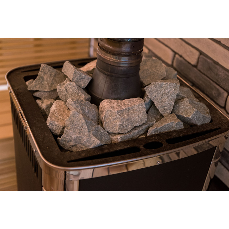 Vedbastuugn - TMF KALINA VITRA. Kaminen är fylld med blandade stenar - finsk olivin och trasig jadeit.