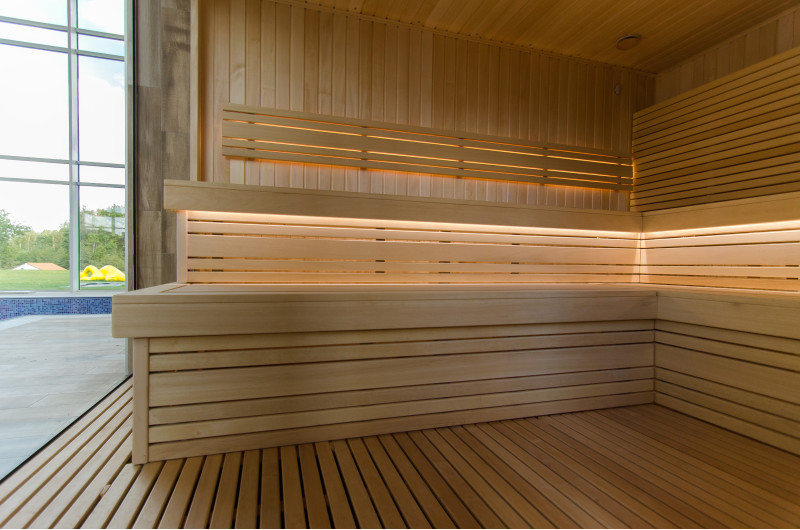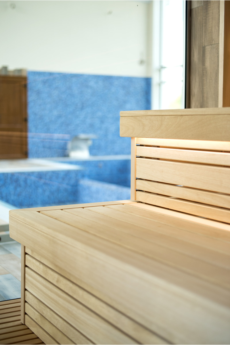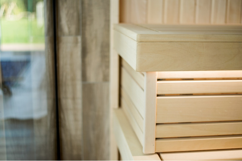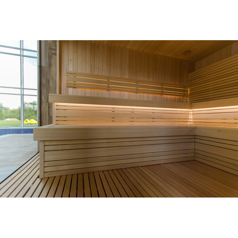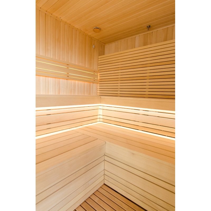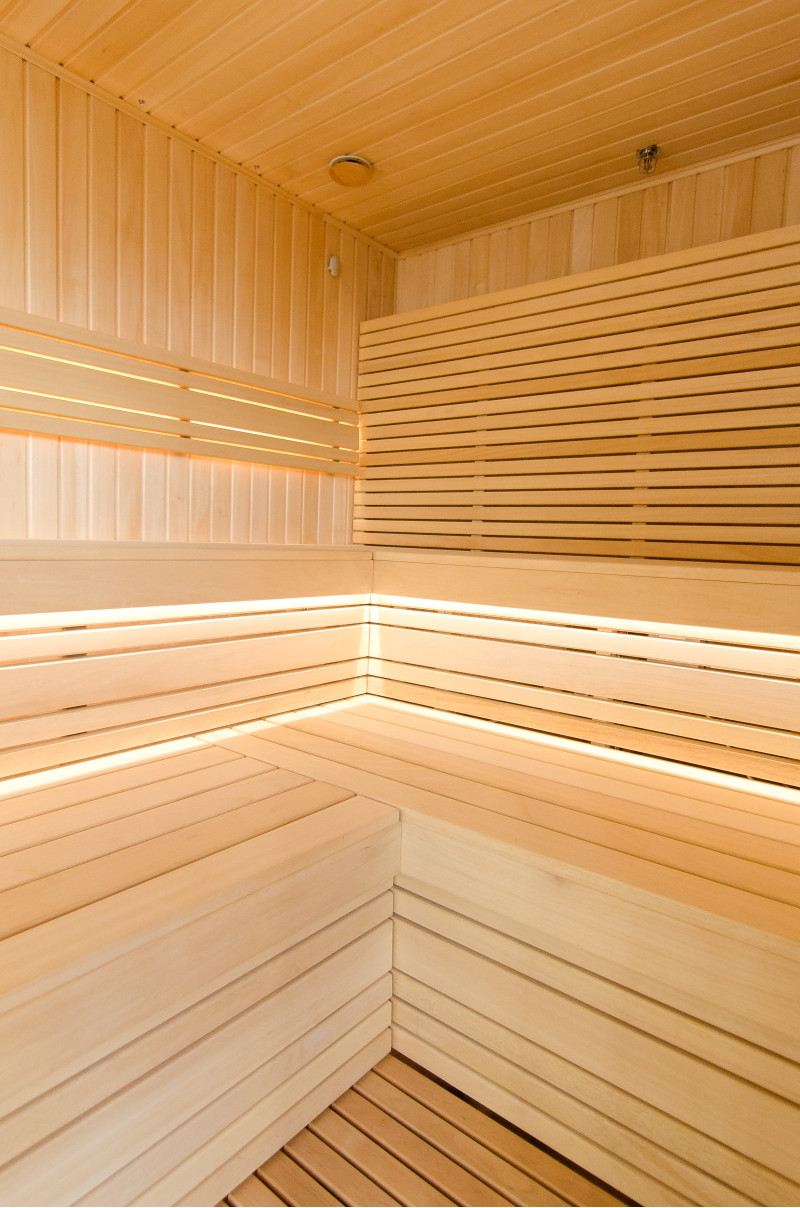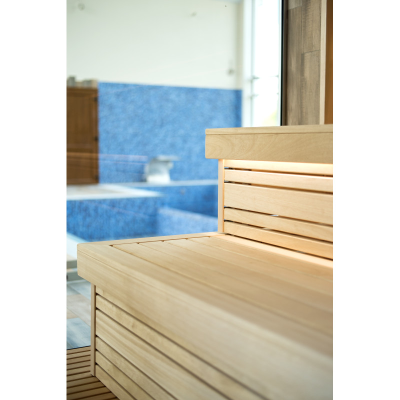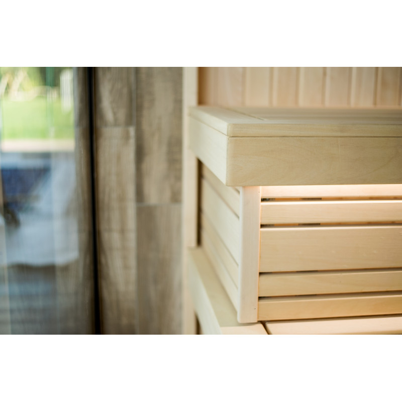 Bastu. De invändiga trädetaljerna i bastun är gjorda av abachiträ, taket och väggarna är gjorda av juliträ. Funktioner: