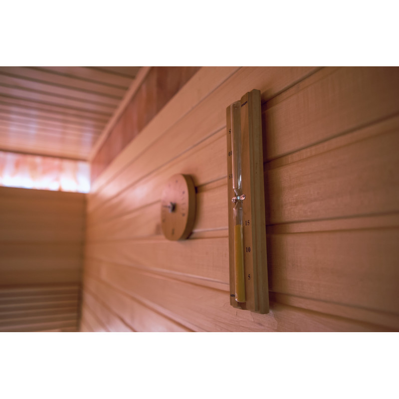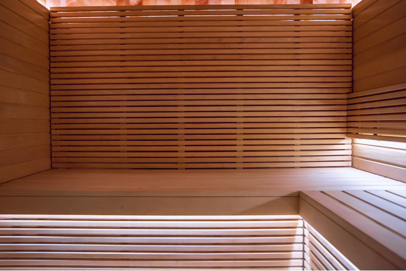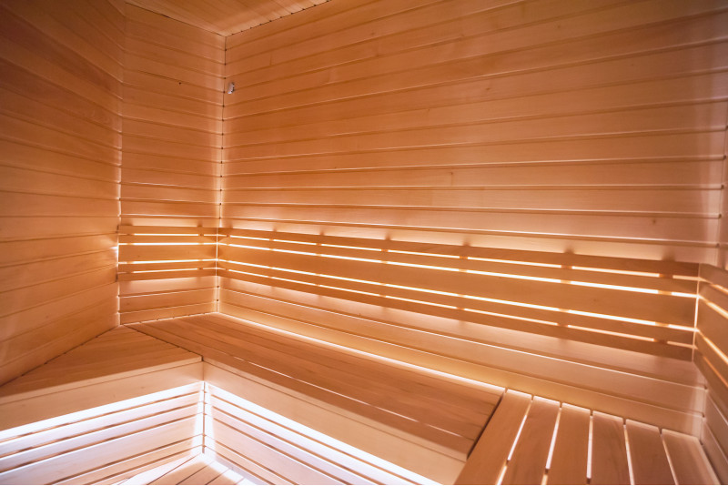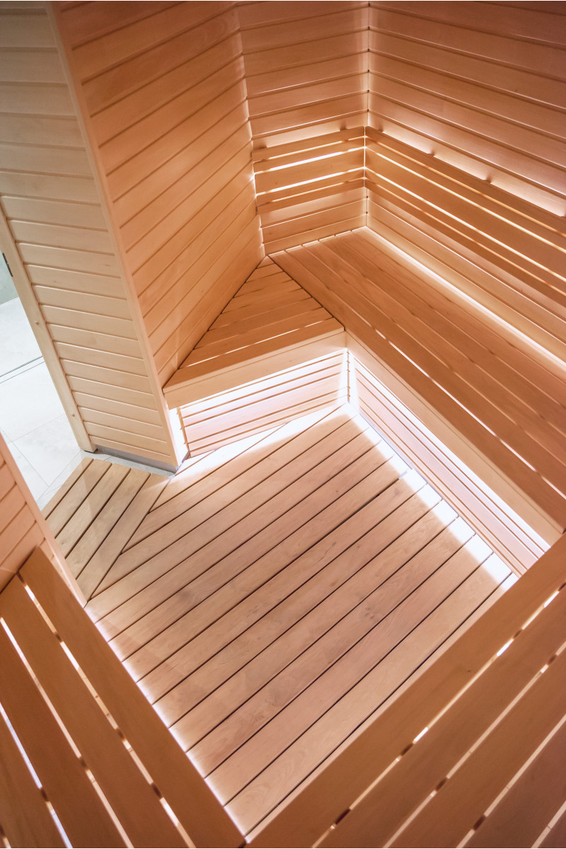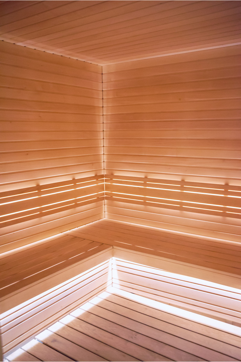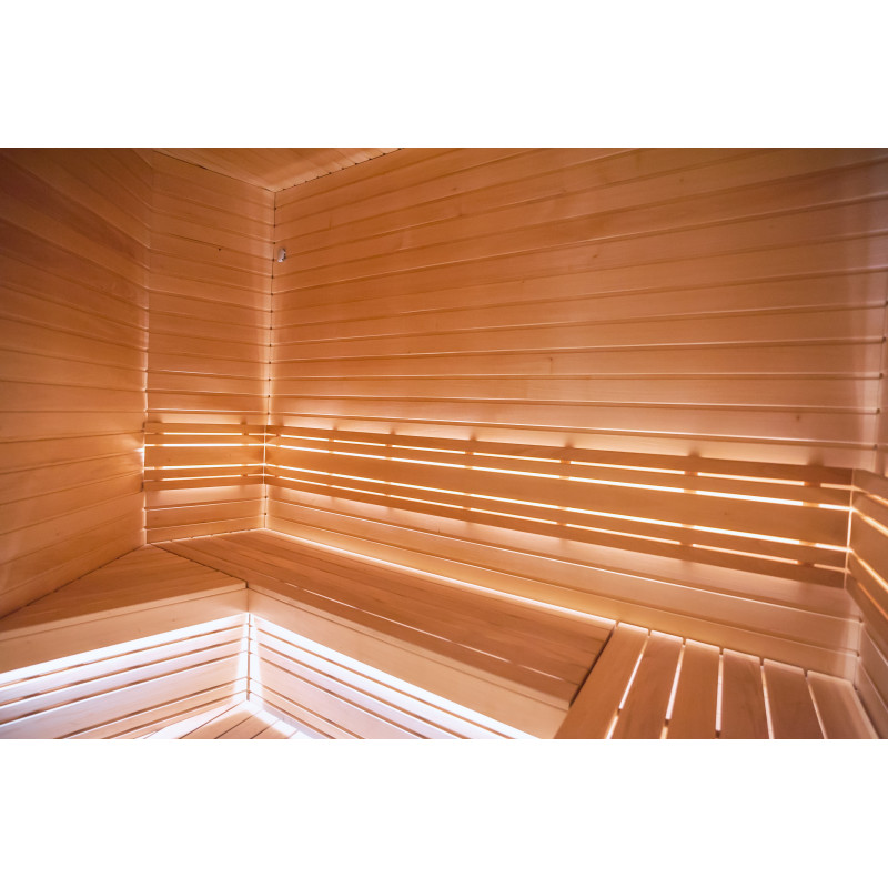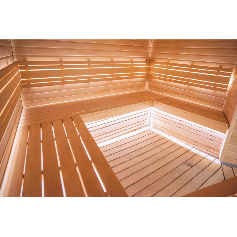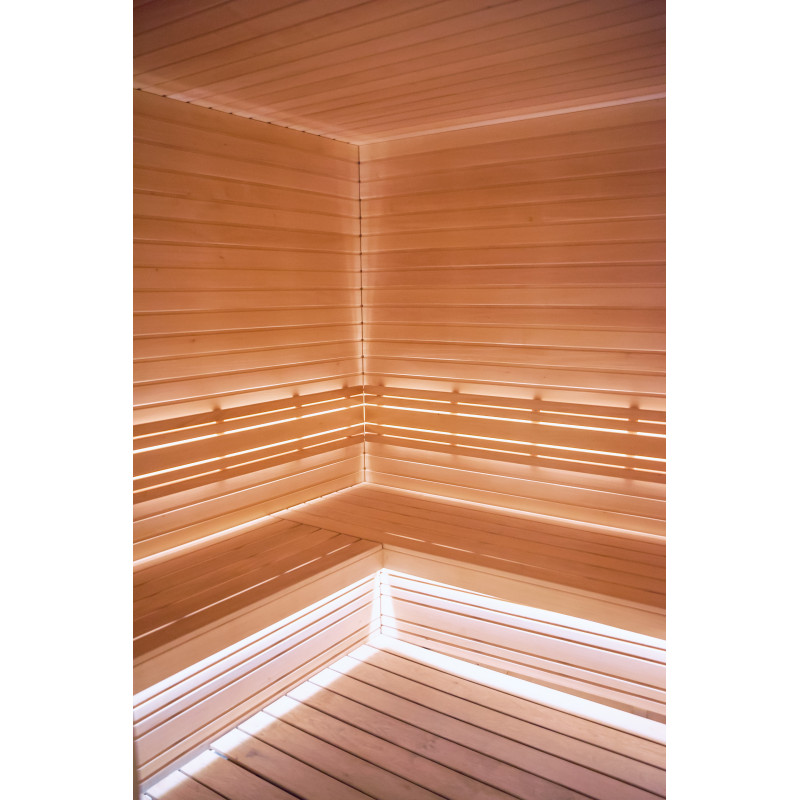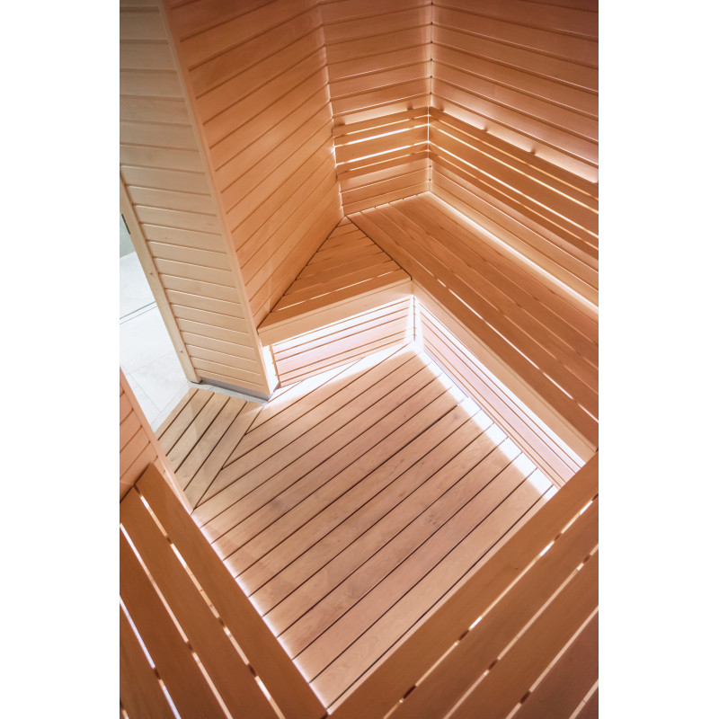 EOS infravärmare och kolelement är installerade under kojarna, styrda av Harvia Xenio Combi CX36I.