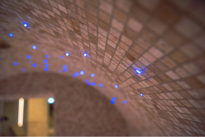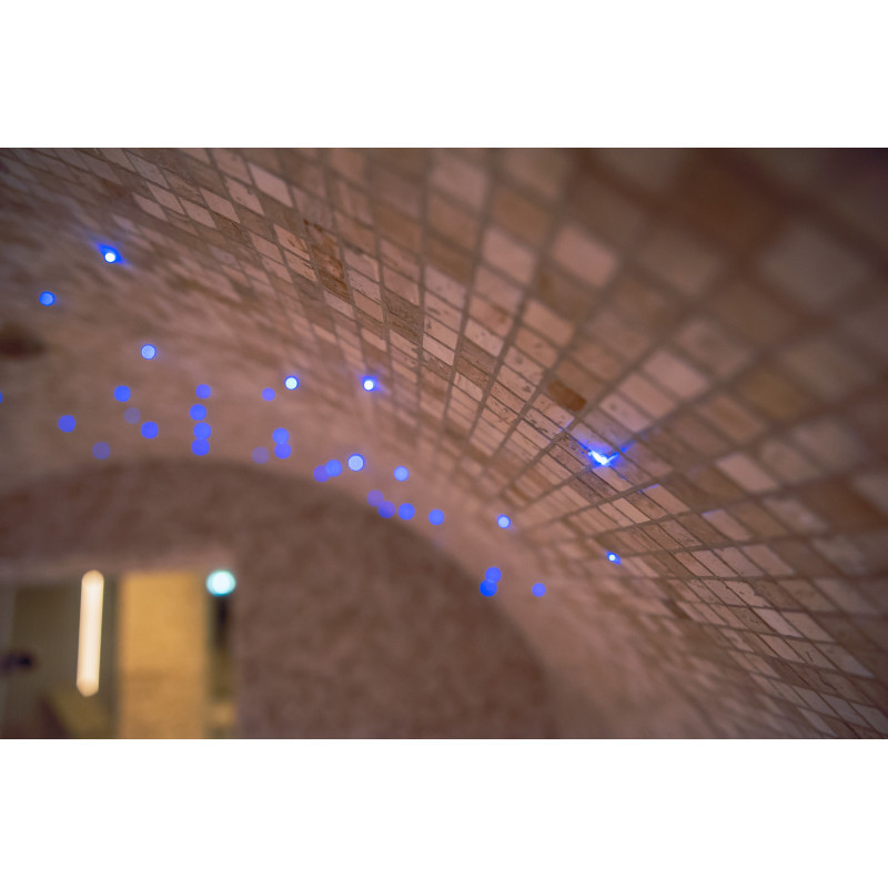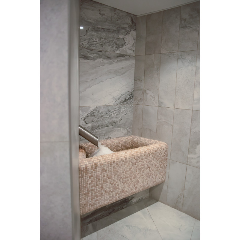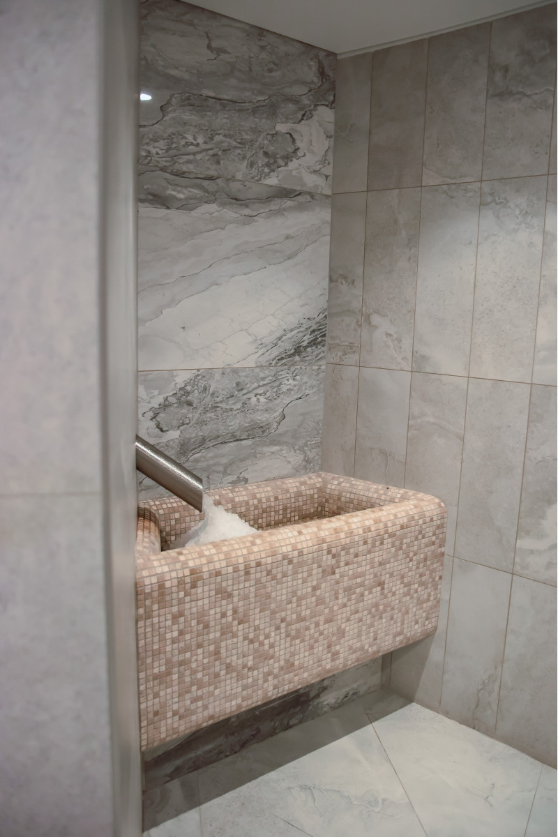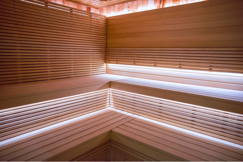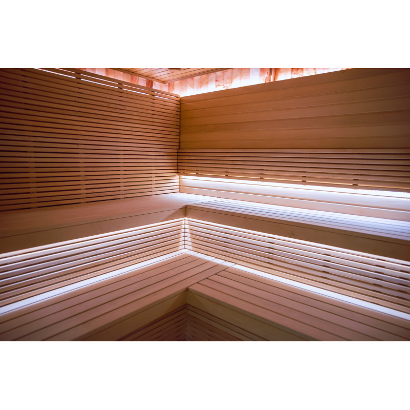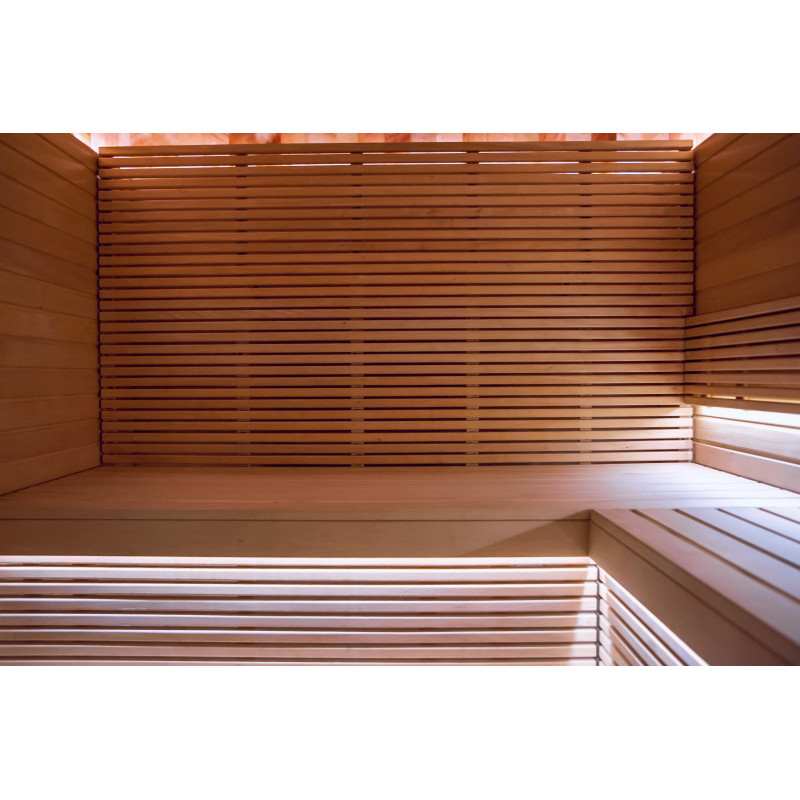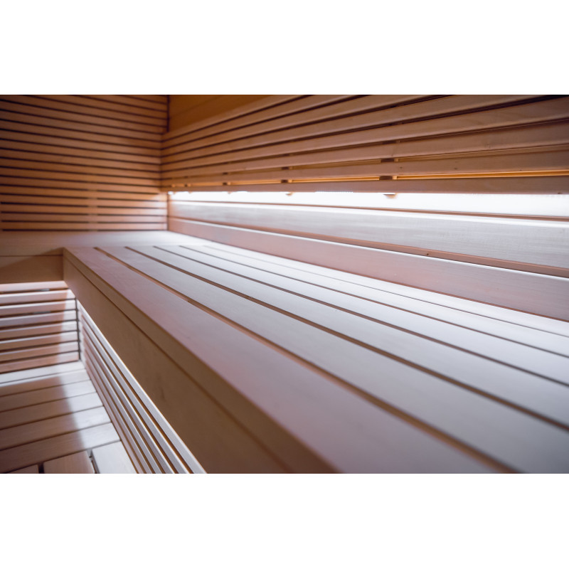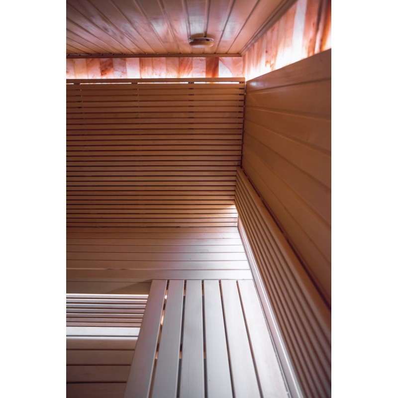En Himalaya saltkakelvägg i en modern bastu är en utmärkt lösning både vad gäller estetik och förbättrad hälsa. En remsa av Himalayasalt bildas 20 cm hög på väggen precis intill taket, runt hela bastuns omkrets. LED-belysning är installerad bakom saltplattorna.