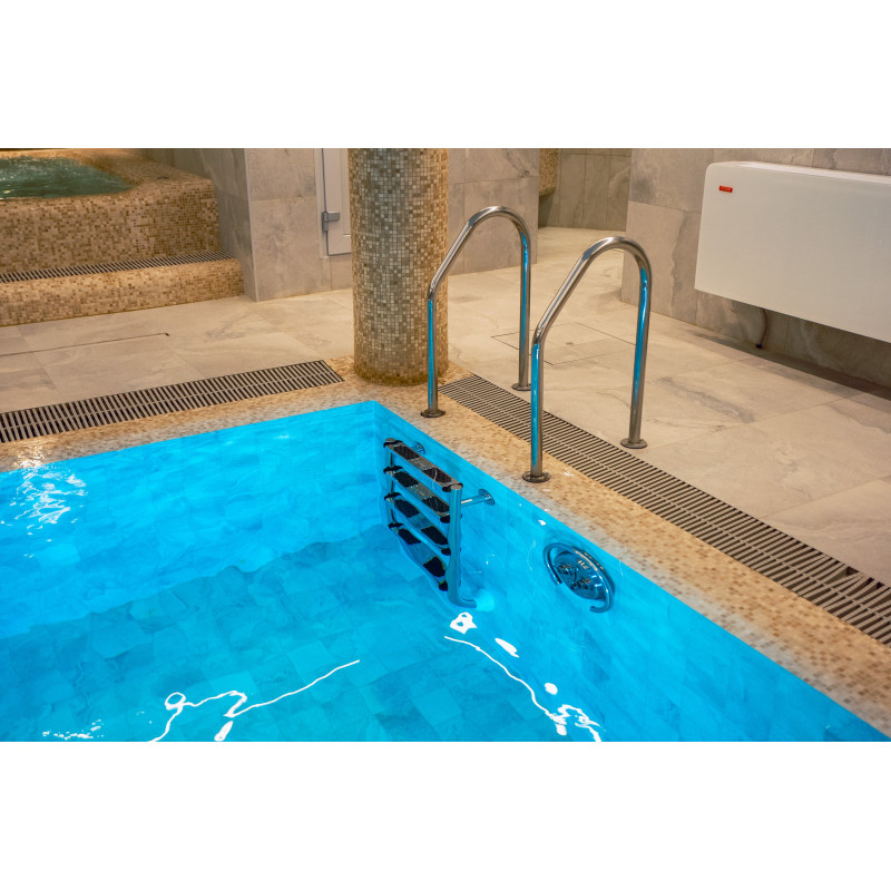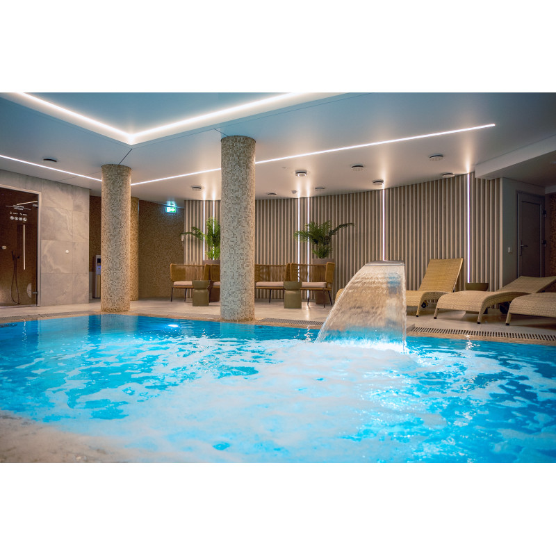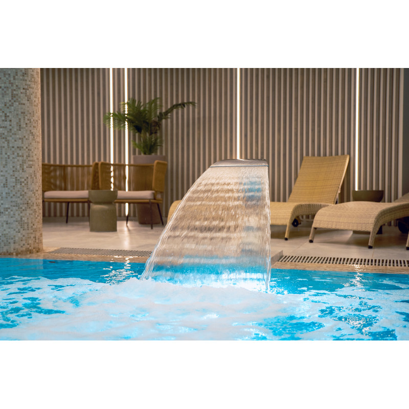 filter, cirkulationspump, massagepump, automatisk kemikaliedoseringsstation, varmvattenberedare, UV-sterilisator, LED undervattensspotlight, dubbla vatten-luftstrålar, luftmassagestrålar, bräddgaller, poolskydd, etc.