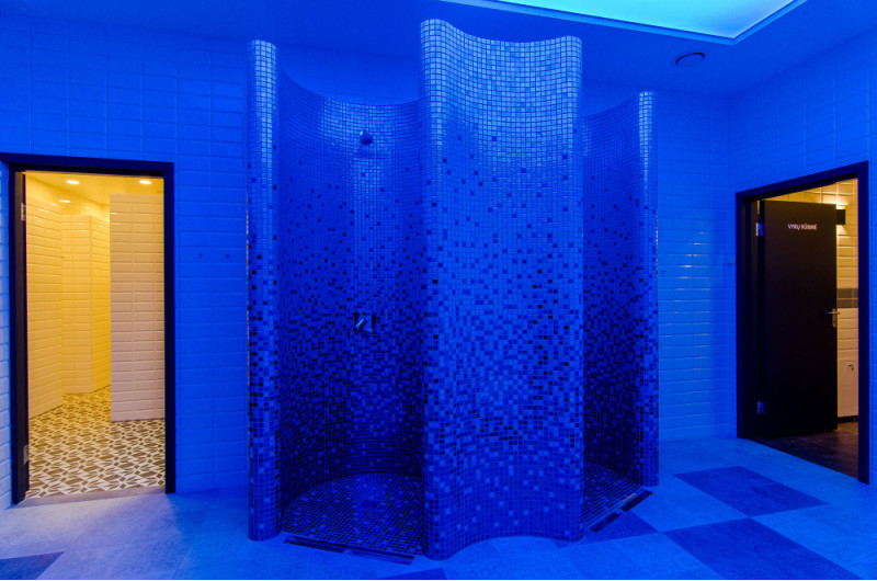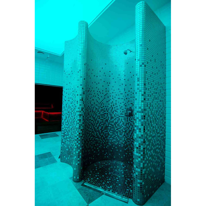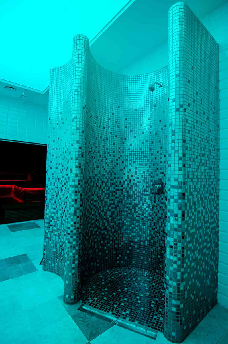Duschformar är gjorda av XPS 300, med spec. skärteknik enligt individuell design. Formar monterade, vattentäta med Schonox smord vattentätning. Limmade mosaikplattor, anpassade till krökning och fyllda med grå Schonox -vattentätning. Duschar - för olika ändamål. En av dem - för en enkel tvätt, den andra - för nedkylning efter en bastu, med kallvattenstrålar.