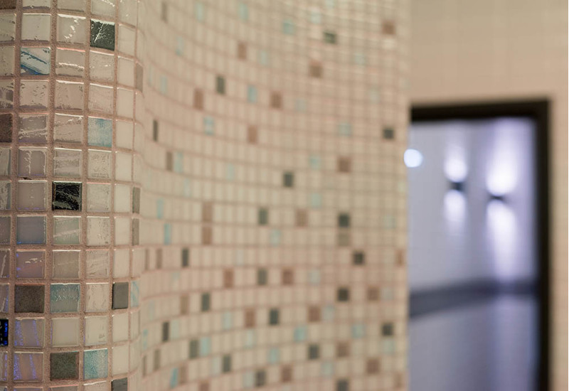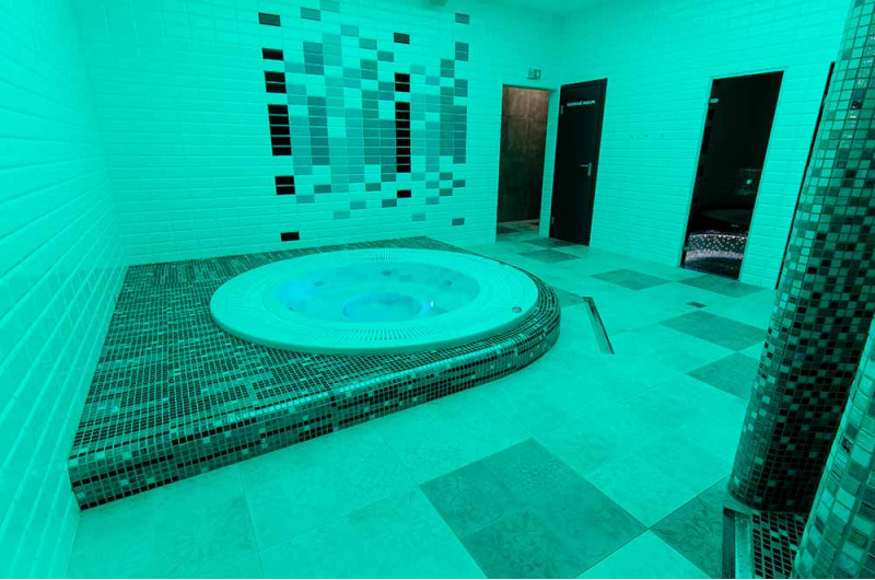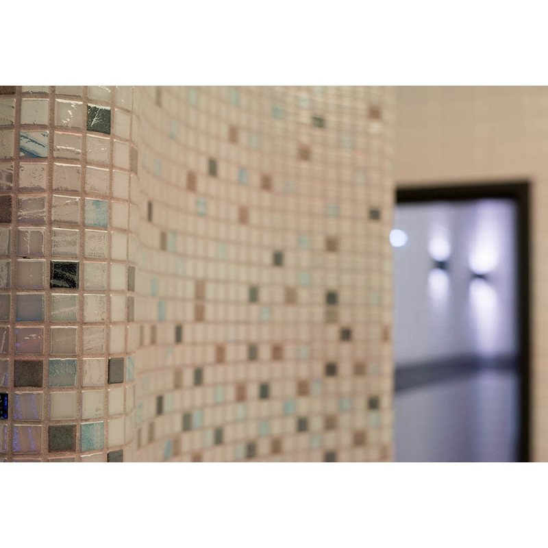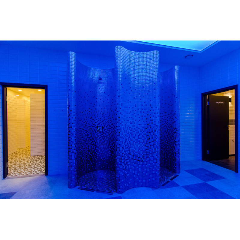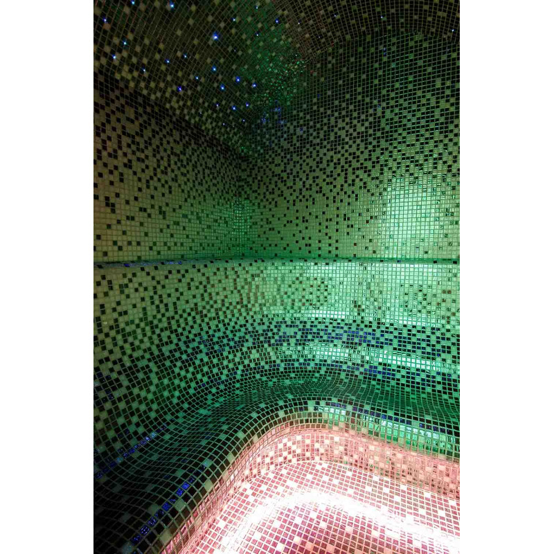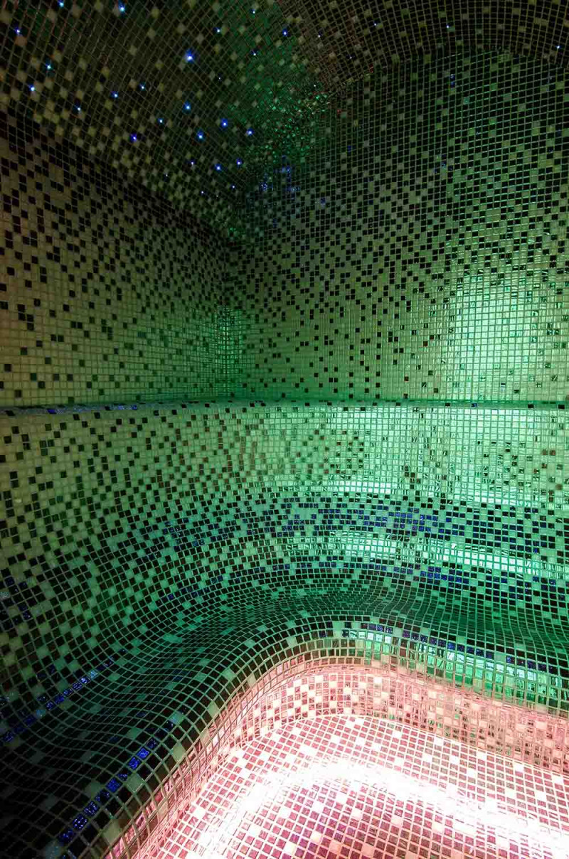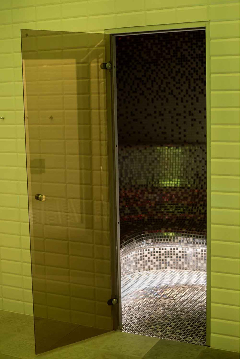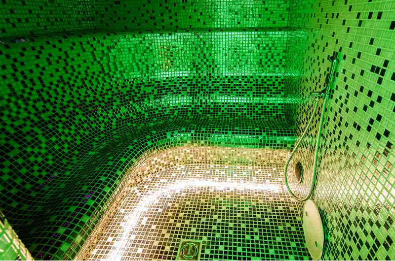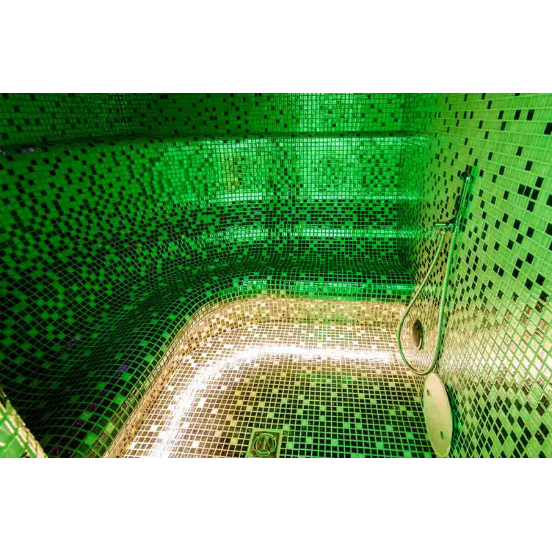 Ångbadets inre ytor formas enligt ett individuellt projekt av expanderad polystyren, med kontinuerlig skärande EPS -styren. Limmade mosaikplattor, anpassade till krökning och fyllda med grå Schonox -vattentätning. Golvet i rummet är uppvärmt. Dörrar - aluminiumram, härdat tonat glas. Ångbad utrustning: