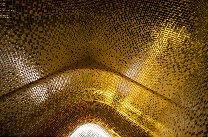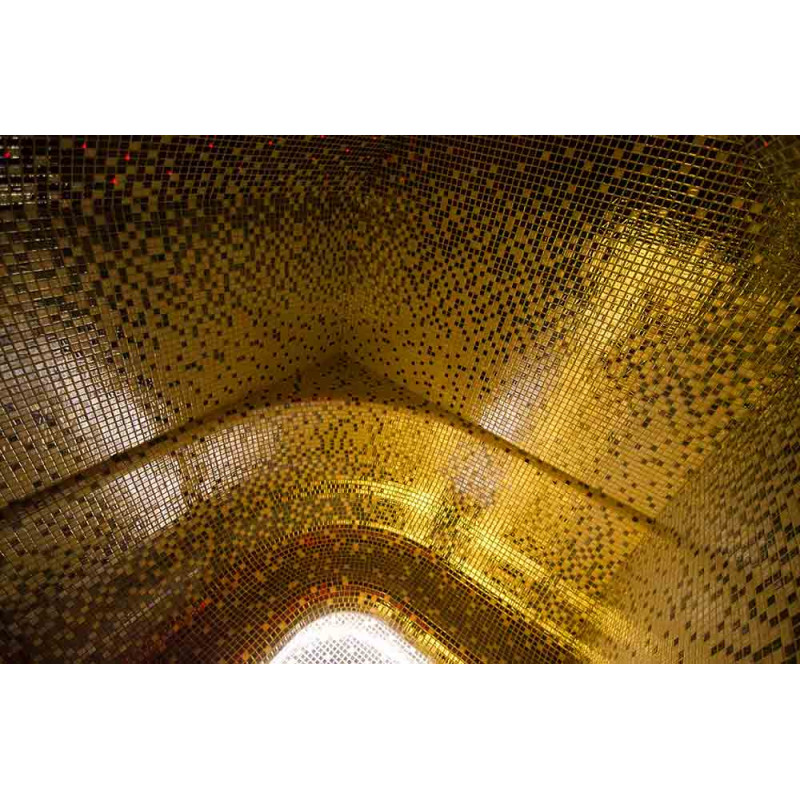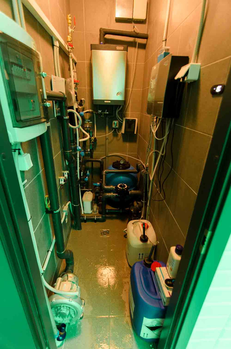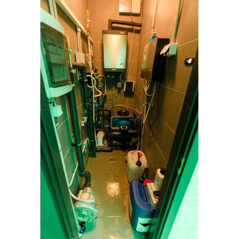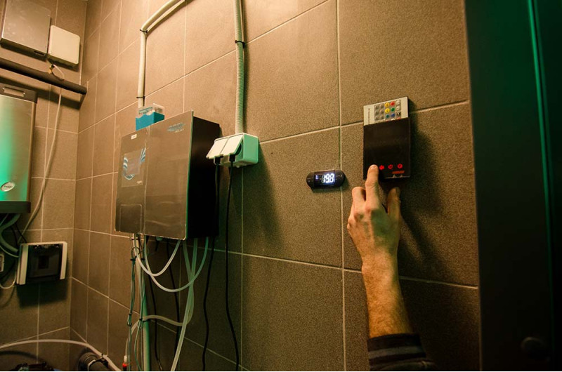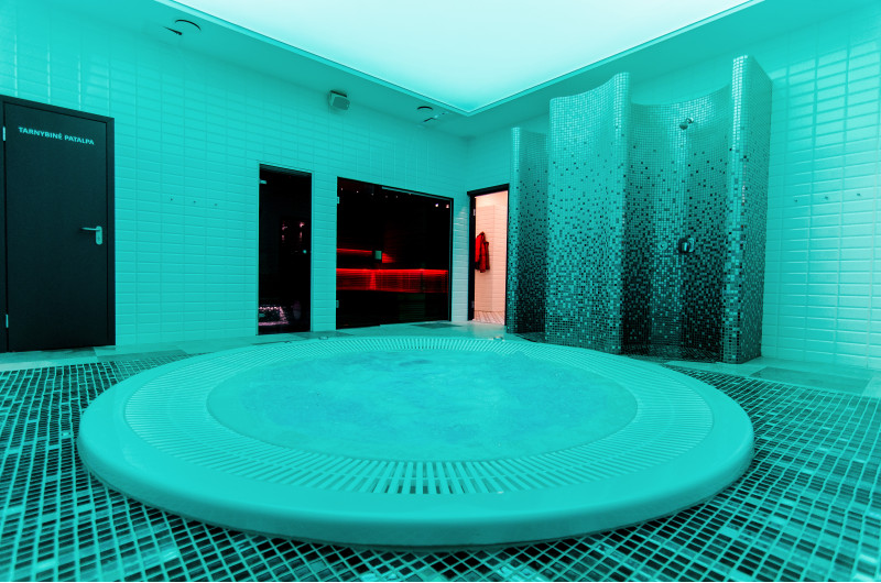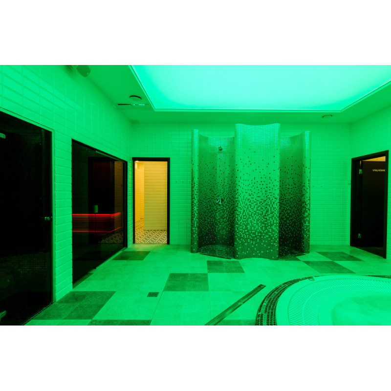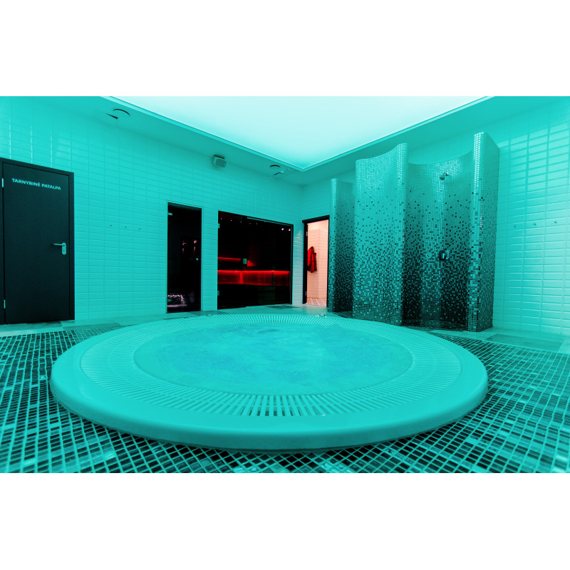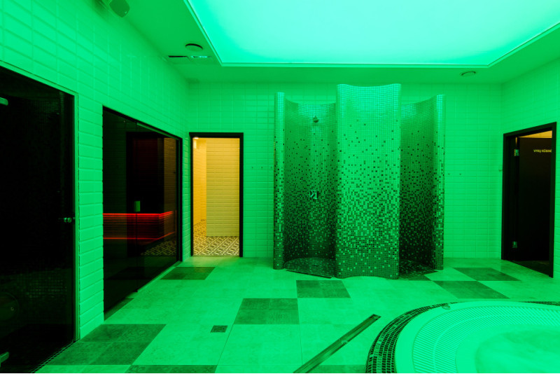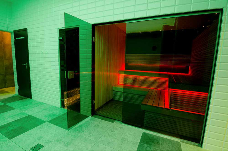 Ångbadets inre ytor formas enligt ett individuellt projekt av expanderad polystyren, med kontinuerlig skärande EPS -styren. Limmade mosaikplattor, anpassade till krökning och fyllda med grå Schonox -vattentätning. Golvet i rummet är uppvärmt. Dörrar - aluminiumram, härdat tonat glas. Ångbad utrustning: