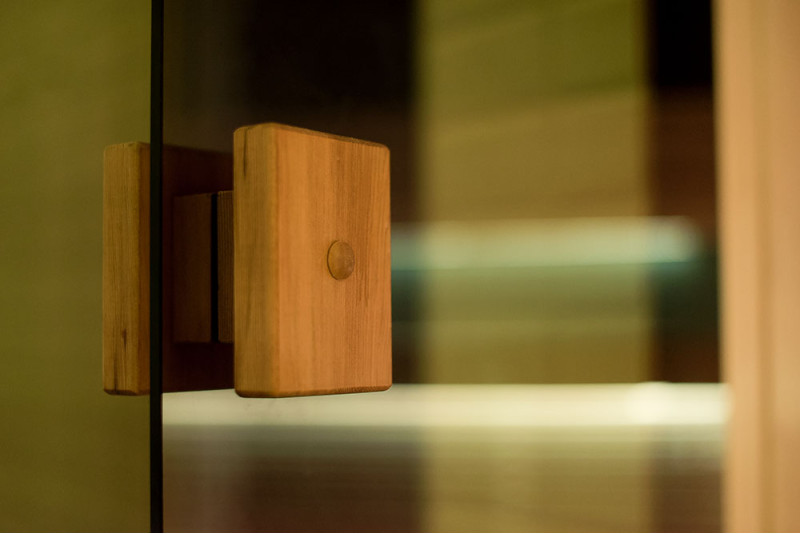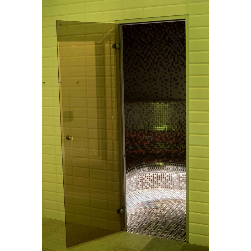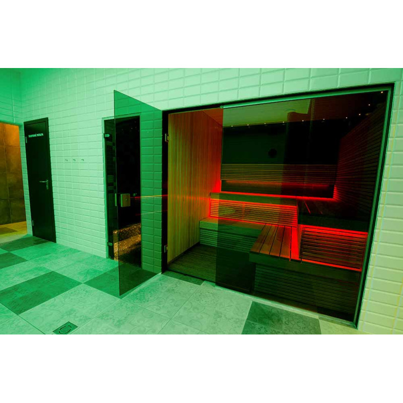 - genom att skapa en sömlös stil, exponerar glasutställningen i bastun utrymmet och skapar intryck av lätthet, ger rummet ljus och modernitet. Vit glasglas - tonat, härdat, aluminiumram,