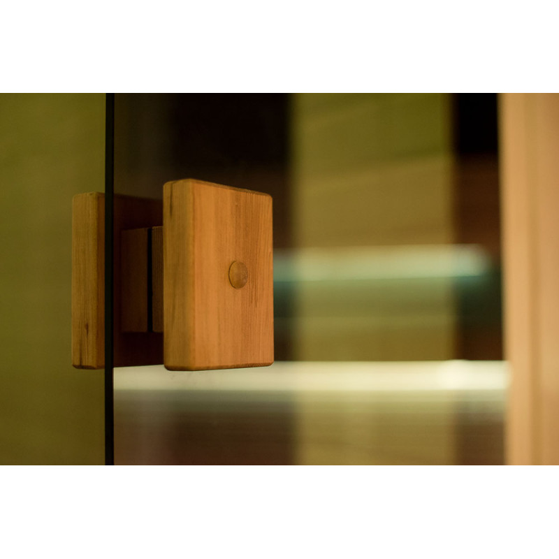 Abachi -trä är valt för basturummet - det är vänligt mot huden, eftersom det inte brinner eller värms upp, så det är bekvämt att skämma bort dig själv med bastuens nöjen. Utrustning:
