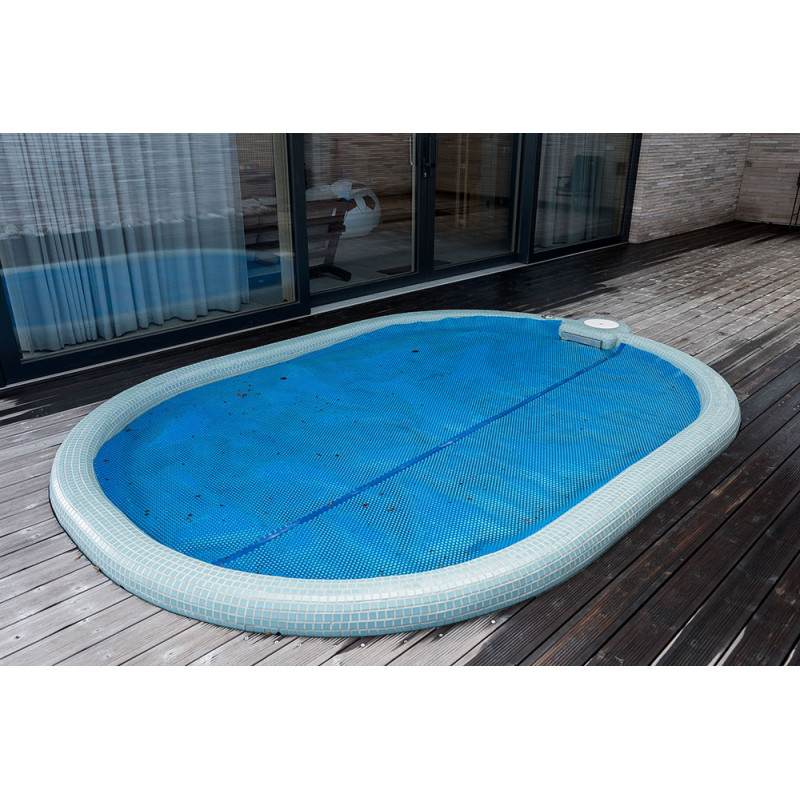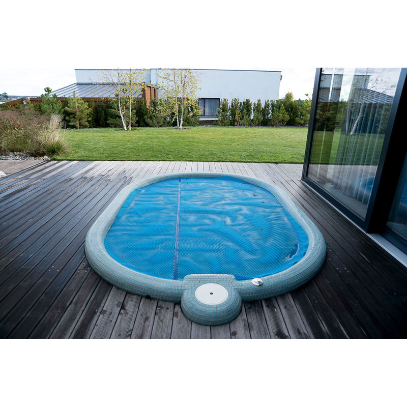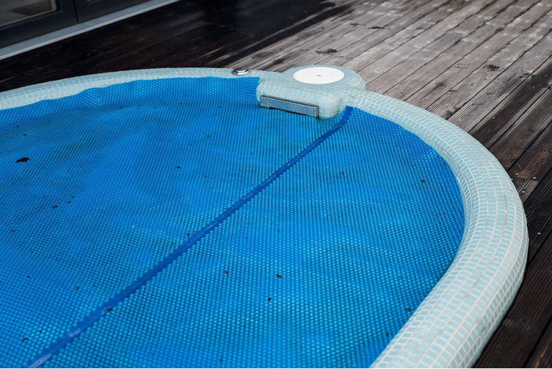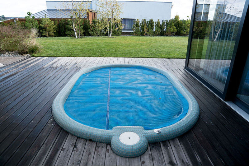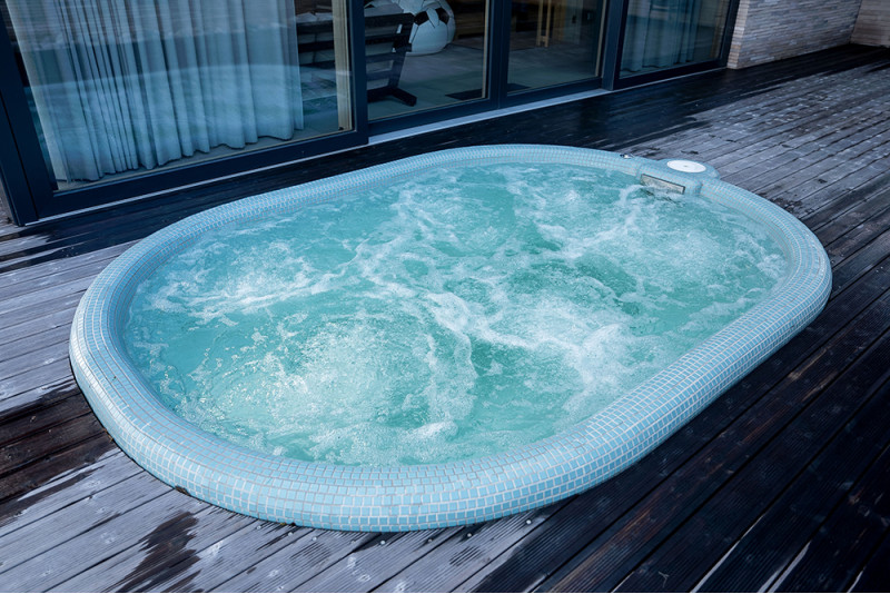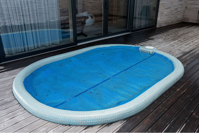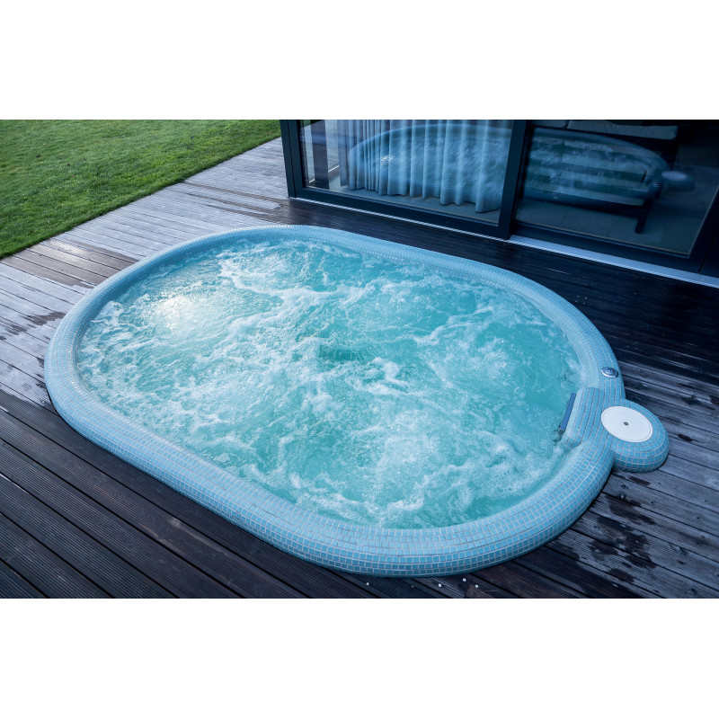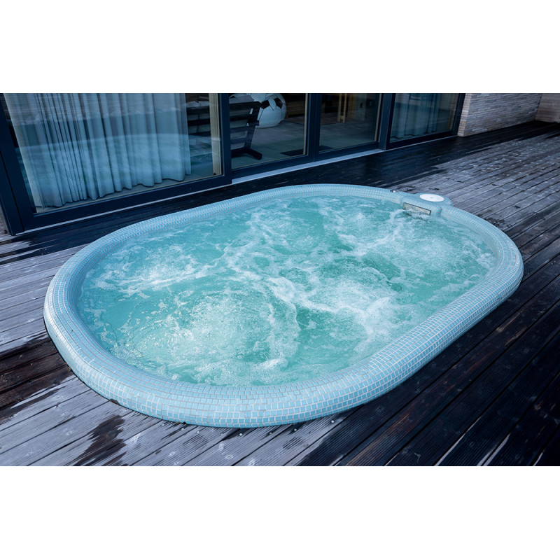 Poolen är utrustad med massagevattenstrålar, undervattens LED RGB-belysning och en poolgardin för att förhindra att smuts kommer in i poolvattnet.
