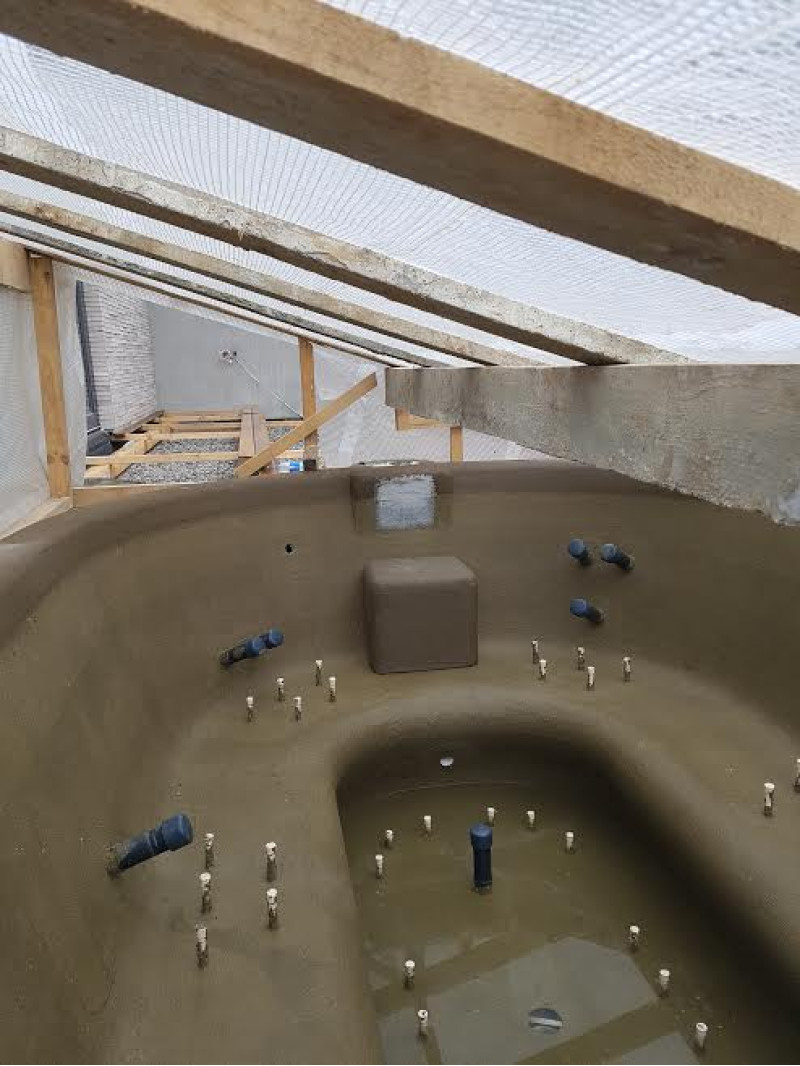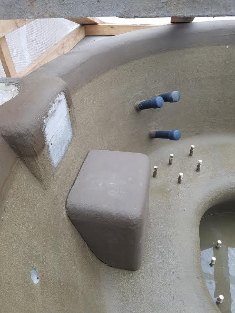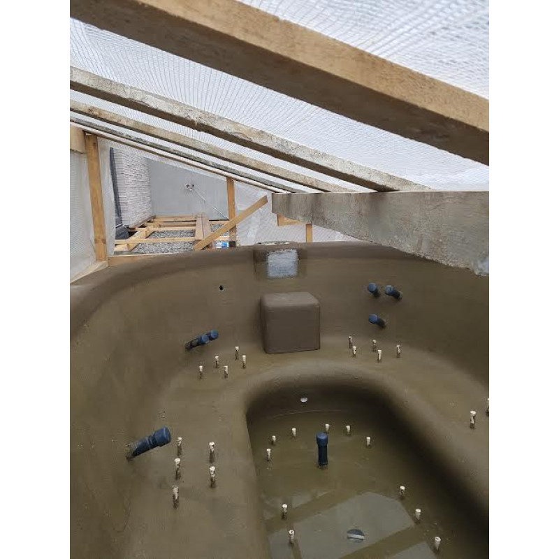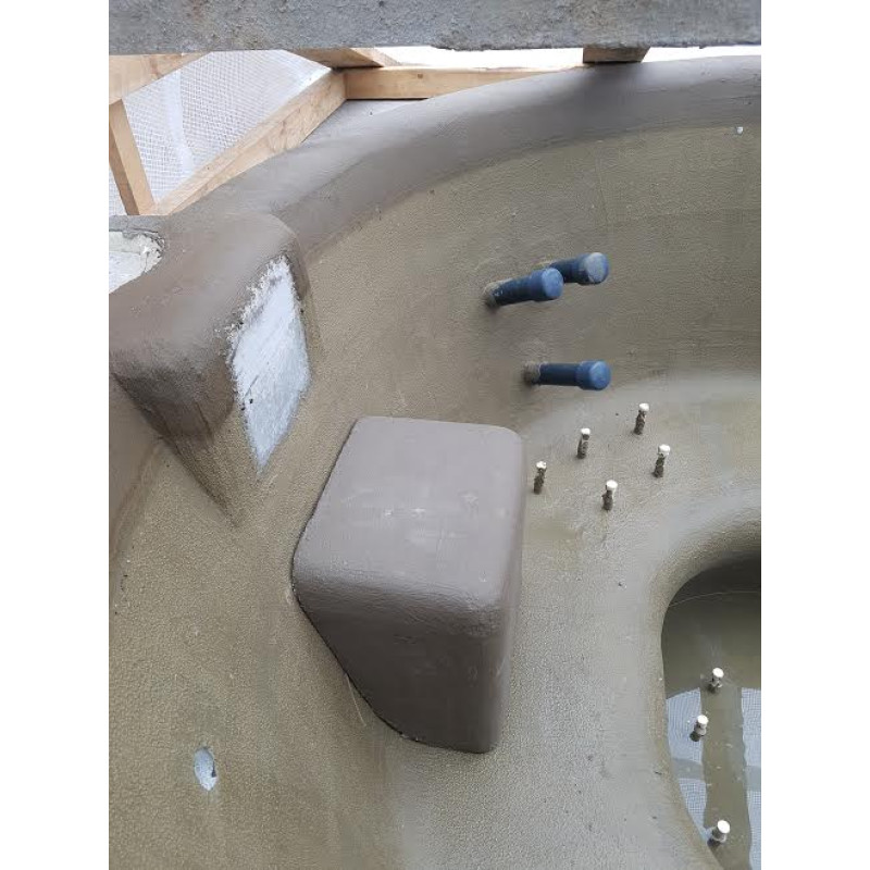 Poolformar är gjorda av speciell extruderad polystyren, enligt individuell beställning. Interiören är klädd med mosaikplattor av krossat glas.